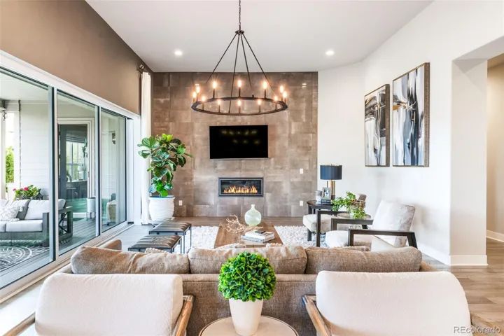 Capturing the essence of Colorado, this home emphasizes indoor-outdoor living in a location that is moments from both recreation and urban amenities. A private front patio ushers residents into an open-concept floorplan with sumptuous designer finishes. At the heart of the home, a chef’s kitchen is characterized by a vast center island, double ovens, and a gas range with a hood.