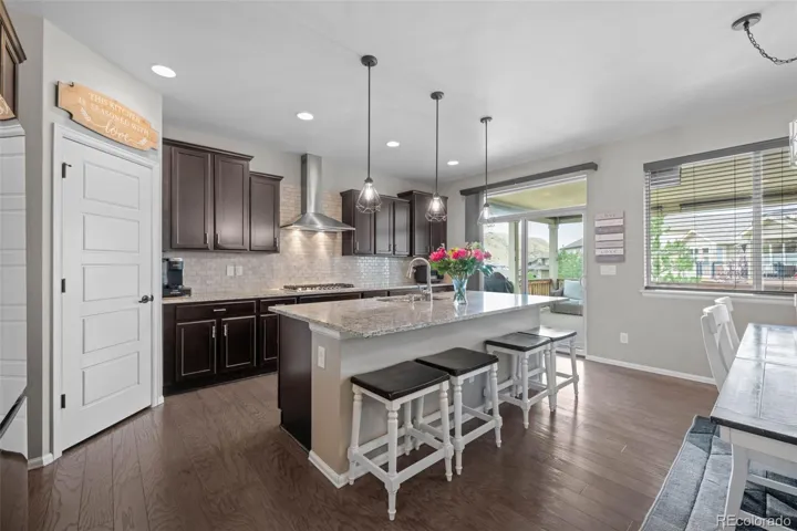 Located in the coveted Village at Castle Pines community, this 5 bed | 5 bath retreat is a true mountain view sanctuary. The inviting foyer leads to an updated open concept family room | kitchen. The family room features a stone fireplace surround, custom shelves and a beautiful view of the Cherokee Ranch.