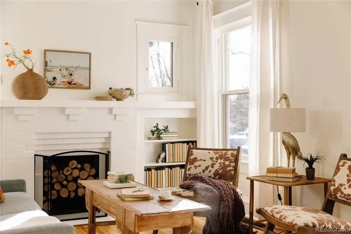 Classic charm meets city sophistication in this thoughtfully updated LoHi bungalow. A cozy entryway nook sets the tone, drawing residents into a striking living space anchored by a dramatic floor-to-ceiling marble fireplace. Hardwood floors flow seamlessly through the open-concept layout, illuminated by recessed lighting and enhanced by tall ceilings that amplify the home’s airy feel.