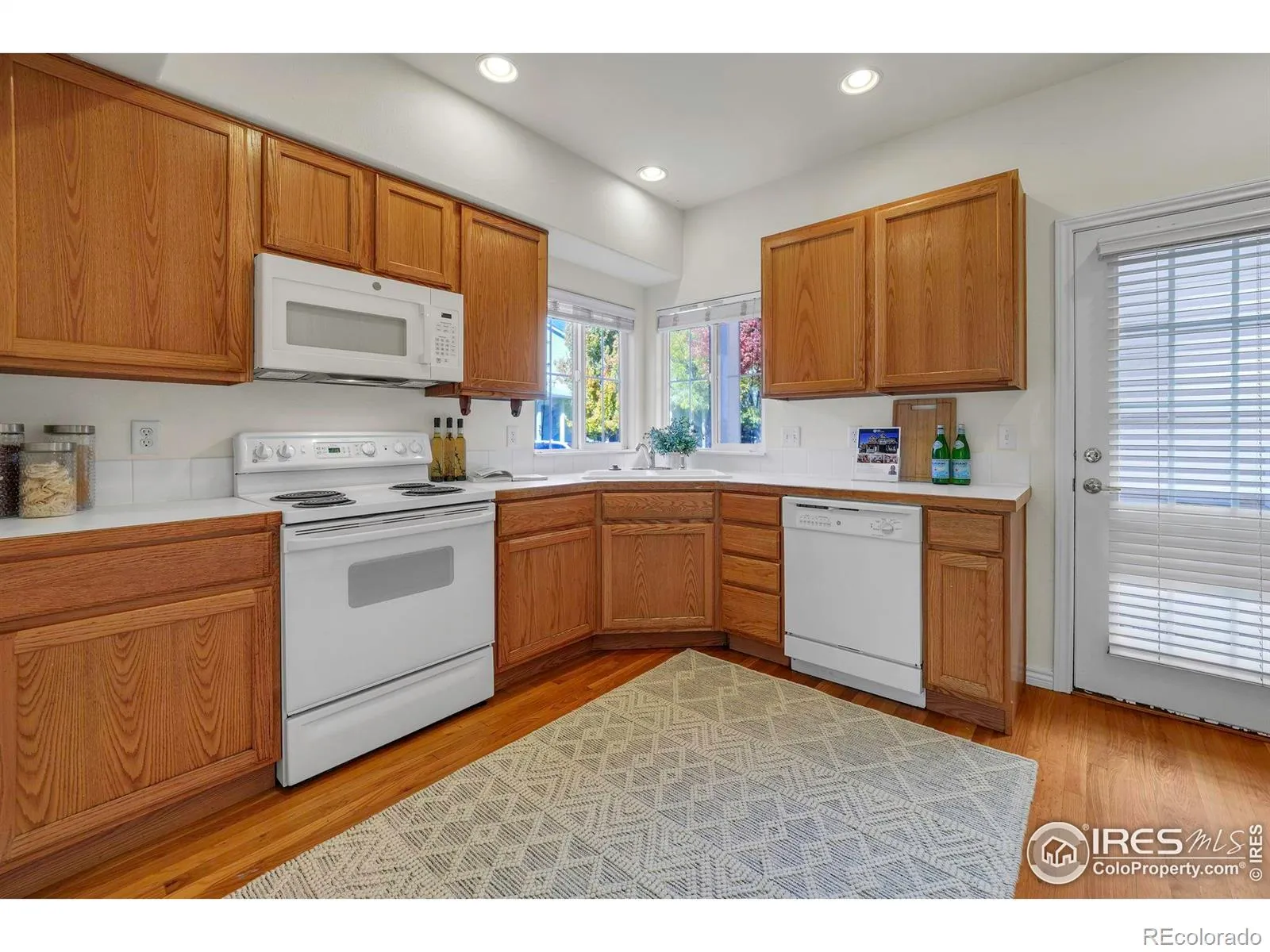 Charming three-bedroom townhome in a sweet location! South facing end unit flooded with natural light. Home is situated on a very quiet interior street, with only 1 shared wall! Enjoy looking out over the HOA green space from your covered front porch. New carpet, fresh paint, wood floors on the main level and dramatic vaulted ceilings. Primary bedroom with private bath, walk-in closet, and large south facing windows. Sunny laundry room on the upper level. One-car attached garage. NOT in a metro tax district!