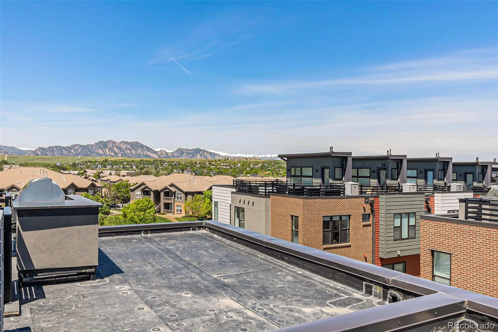 The second floor features a chef’s kitchen with a built-in gas range, double ovens, waterfall quartz countertops, and a massive walk-in pantry. The open-concept design flows seamlessly into the great room with a tiled gas fireplace and ample natural light, where you can enjoy breakfast while taking in breathtaking views of the Flatirons.
