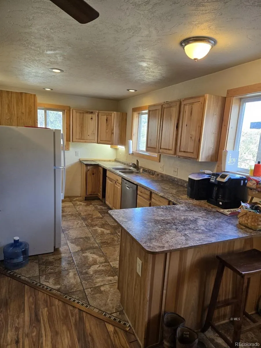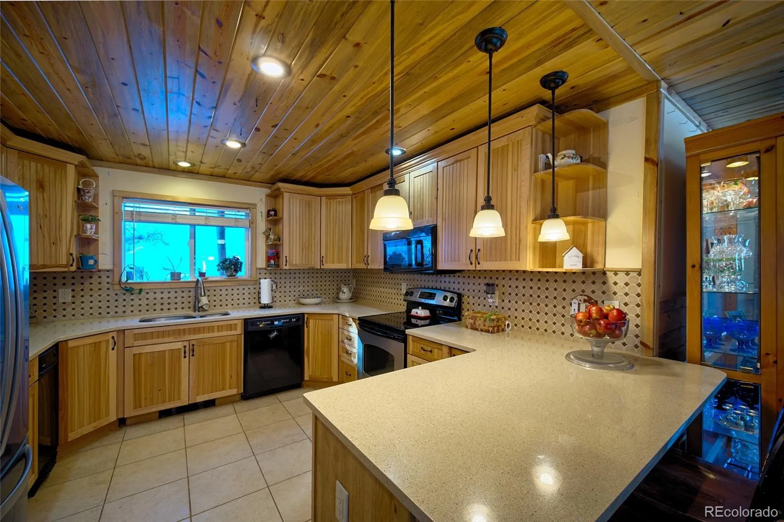 The kitchen is designed with durable ceramic tile flooring and user-friendly appliances, blending functionality with mountain charm.