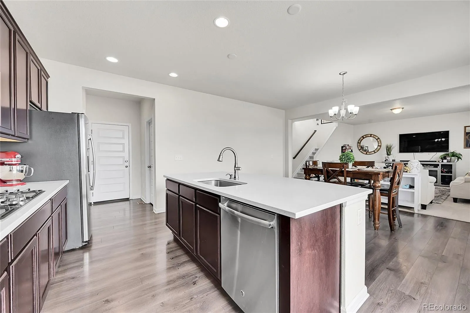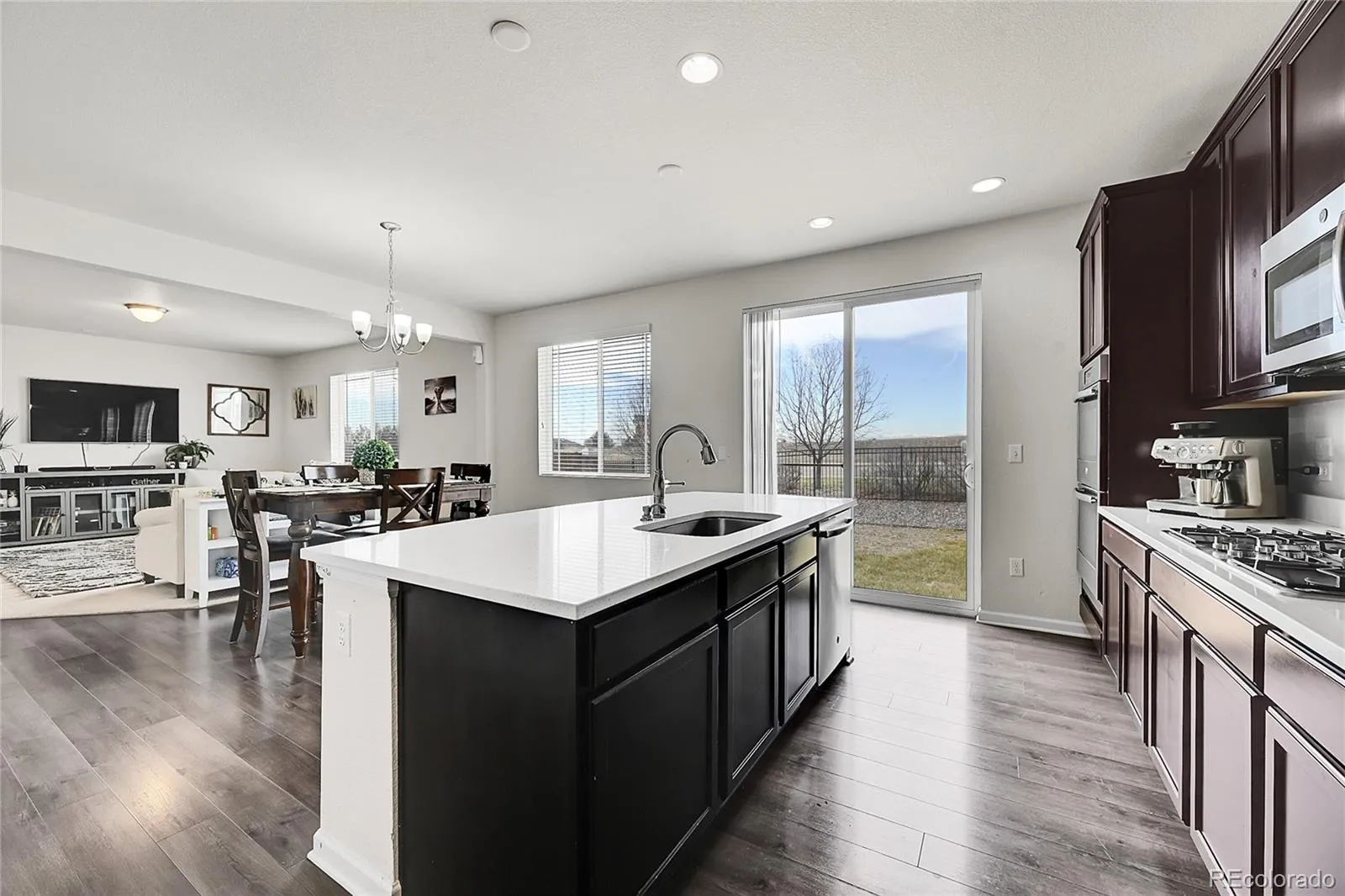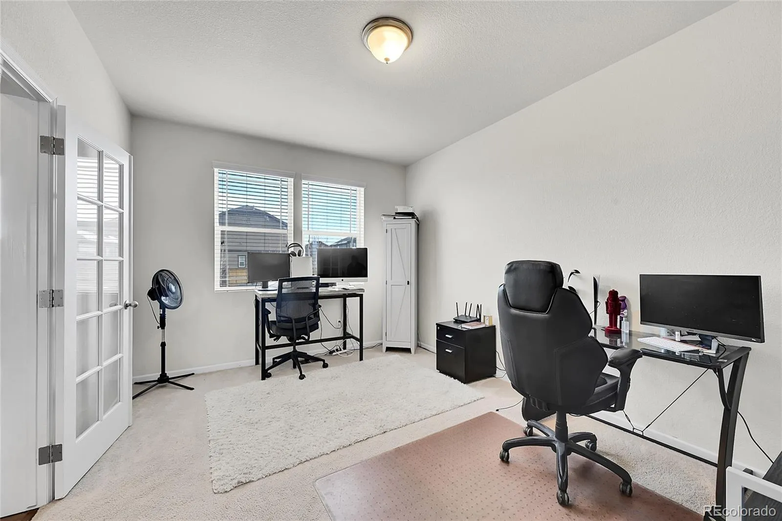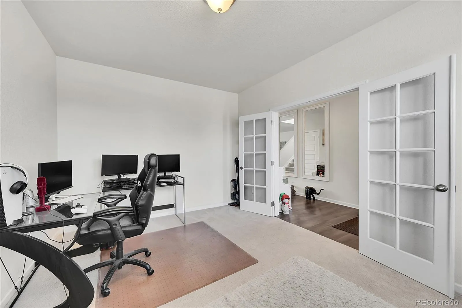 Step inside to find beautiful hardwood floors throughout the main level and a private office with French doors—perfect for working from home. The spacious living room flows seamlessly into the open-concept kitchen, which is equipped with quartz countertops, a modern backsplash, gas stove, double oven, stainless steel appliances, and a generous pantry.