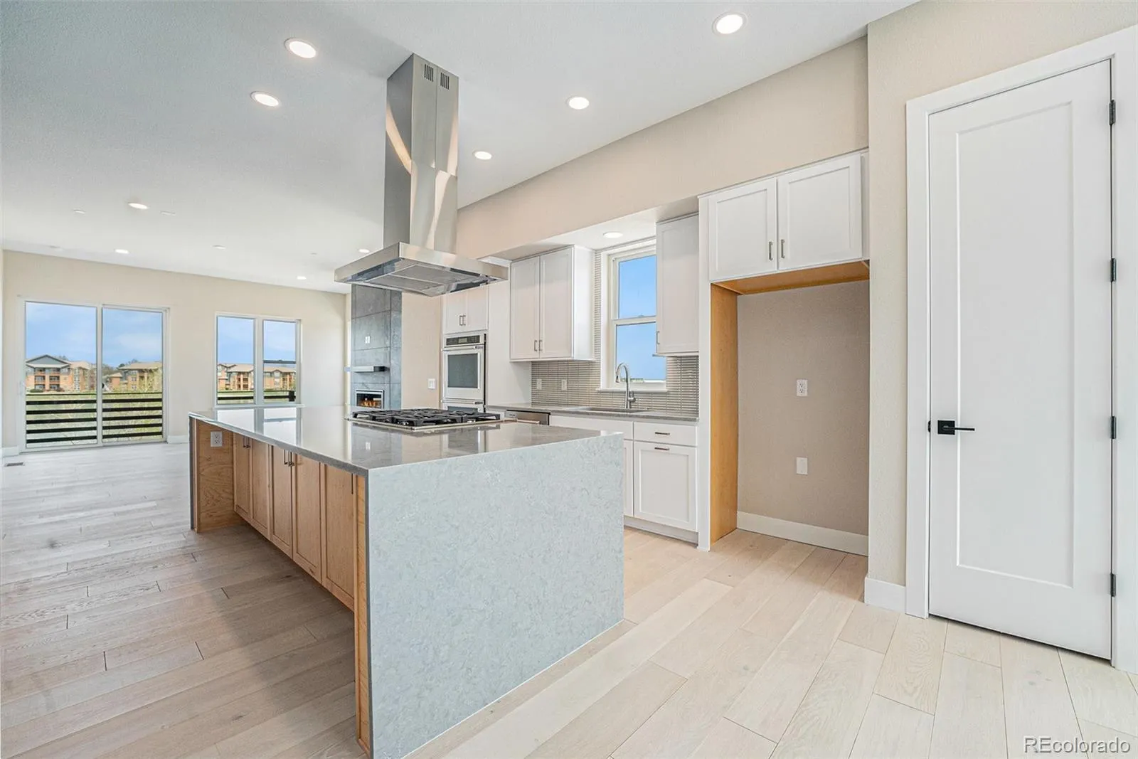 The second floor showcases an expansive great room filled with natural light and centered around a striking quartz waterfall island. The chef’s kitchen features premium appliances, a sleek hood vent, double ovens, and ample space for hosting in the adjacent dining area.