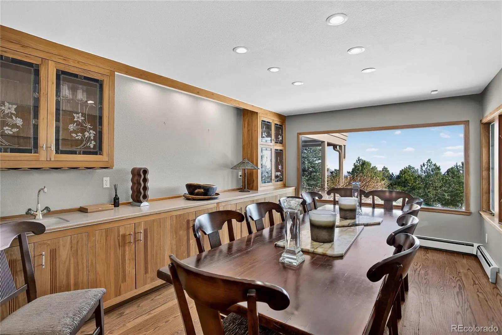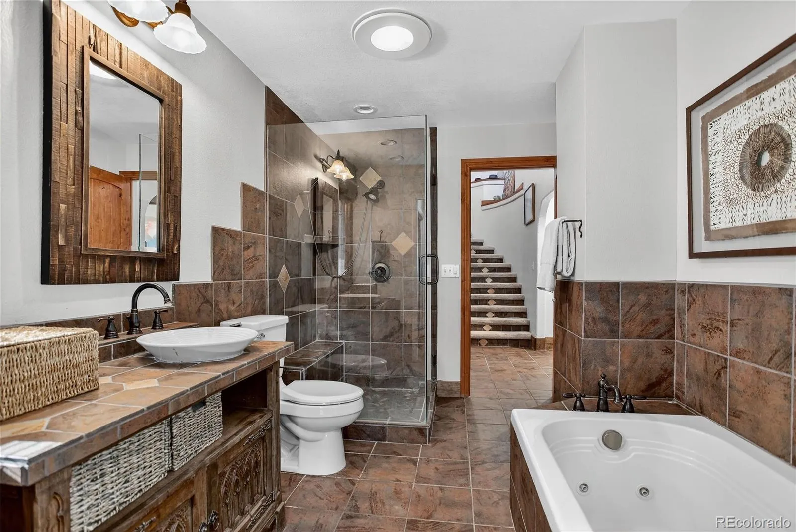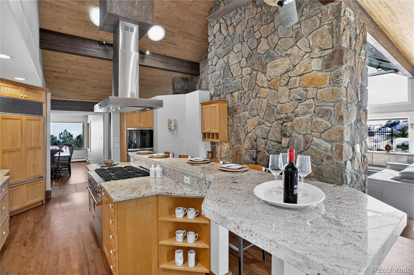 Welcome to 5237 Bear Mountain Dr, a breathtaking 5-bedroom, 5-bathroom sanctuary nestled on 3.91 private acres in Evergreen, Colorado. This luxurious 4,771-sqft estate offers unparalleled views of the city skyline & the majestic Mt Blue Sky, all framed by stunning rock outcroppings & the rugged natural beauty of the surrounding landscape. Don’t miss the upper deck perch, which provides far-reaching 360-degree views of both- a breathtaking vantage point for sunrises & sunsets. A security gate provides both privacy & peace of mind, setting the tone for the exclusivity that awaits within. The main level boasts a grand great room with vaulted ceilings & a wood-burning, double-sided fireplace that adds warmth and ambiance to both the living area & the adjacent spaces. A formal dining room showcases spectacular city views, creating the perfect setting for dinner gatherings. The kitchen is a chef’s dream, equipped with Viking appliances, granite countertops, & a spacious walk-in pantry. This level also includes a bedroom with an attached 5-piece bathroom, a laundry room, & a convenient 1/2 bath. The heart of this home is its expansive primary suite on the upper level, a true retreat that includes a private library with floor-to-ceiling windows, perfect for quiet contemplation or inspired work. With two beautifully appointed bathrooms, a convenient kitchenette, & a wrap-around deck, the primary suite offers a blend of comfort & elegance that is hard to match. On the lower level, a fully finished basement with walk-out access boasts 3 additional bedrooms & a bathroom, making it ideal for guests or extended family. The property is designed for entertaining & practical living, featuring a 4-car heated garage attached to the main residence. Every inch of 5237 Bear Mountain Drive has been crafted to offer a harmonious blend of luxurious comfort & natural splendor, making this Evergreen property a true mountain masterpiece that combines exclusivity with warm, welcoming charm.