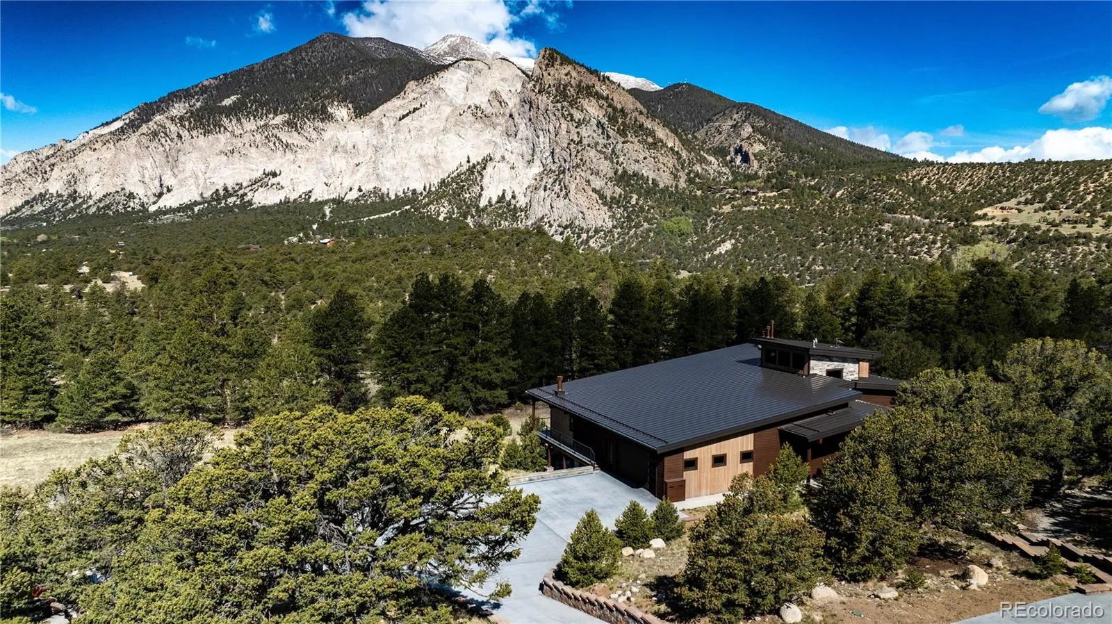 Now offered at $4,950,000, this newly built mountain estate presents a rare opportunity to own a design-forward residence with unobstructed views of Mt. Antero, Mt. Princeton, and the Chalk Cliffs, thoughtfully positioned as an exceptional value in today’s luxury market. A gated entry and intentional approach unveil a residence where sustainable, energy-efficient design is executed with exceptional architectural precision. Interiors showcase rich Maplewood finishes, plastered walls, stacked stone accents, and soaring cedar T&G ceilings that extend seamlessly into expansive covered outdoor living spaces. The great room is framed by floor-to-ceiling mountain views and anchored by a sleek gas fireplace, flowing effortlessly into the dining area and gourmet kitchen equipped with Wolf and Sub-Zero appliances. A fully soundproofed media room and integrated smart-home networking system enhance both everyday living and entertaining. The primary suite offers a private retreat with a fireplace and a spa-inspired bath featuring floating dual vanities, soaking tub, double-headed steam shower, custom walk-in closet, and a dedicated washer/dryer. Two additional en-suite bedrooms provide luxurious accommodations. Designed for entertaining, the lower level includes a third fireplace, mountain views, and a secondary kitchen area. The home is fully outfitted with Sonos speakers, central vacuum, and pre-wiring for mounted TVs throughout. Outdoor living rivals the interior with a covered deck with full outdoor kitchen and fireplace, a private hot tub patio, and 22 acres spanning three parcels, offering privacy and open space. Heated garages include granite counters, built-in air compressors, and EV chargers. With its rare combination of new construction, premium finishes, acreage, and iconic mountain views, this exceptional estate delivers outstanding value for mountain retreat of this caliber. Experience in person to fully appreciate the craftsmanship and panoramic mountain views!