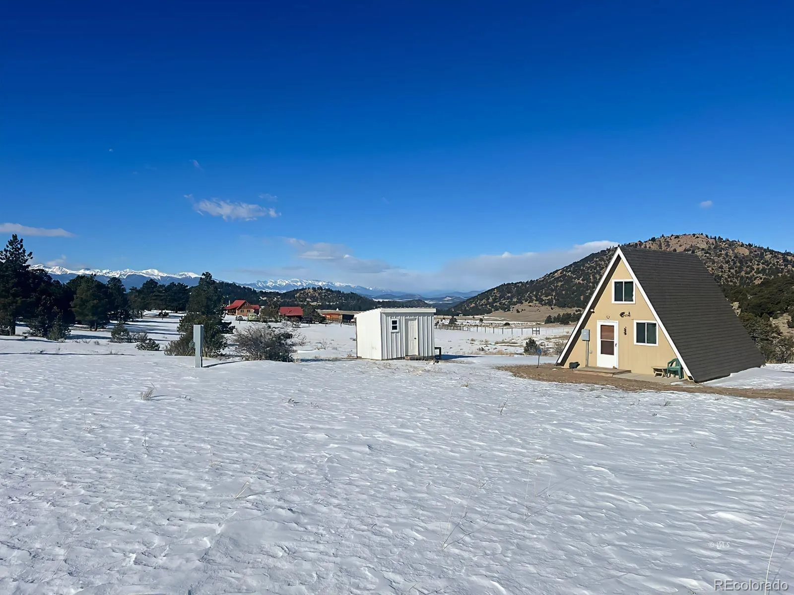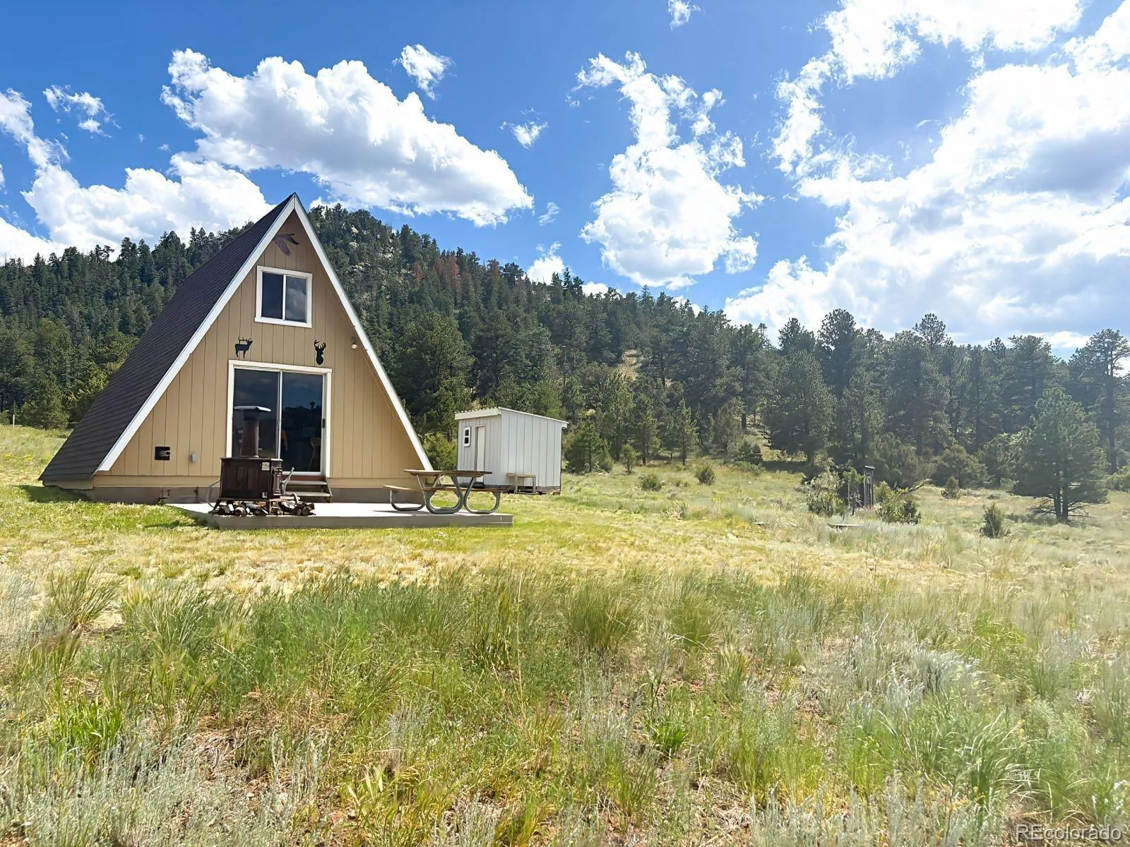 Dreaming of a mountain escape with views that wow? This remodeled A-Frame retreat delivers! Nestled on over 5 acres with sweeping views of the Sangre de Cristo Mountains and Pikes Peak, this cozy one-bedroom + loft cabin is your serene getaway in the woods. The seller is currently adding a brand-new shower, making your half-bath even more functional! Inside, the warm, open layout features a charming pellet stove, kitchenette, and dining nook, perfect for chilly evenings or weekend getaways. An electric heater keeps the bedroom and bath toasty, while the loft above offers extra sleeping or hangout space (yes, you can stand up!). Step through sliding glass doors onto your deck, pick your view, and fire up the BBQ! With just a few neighbors on this quiet, scenic road, it’s peace, nature, and starry skies galore. On-grid power, stove hook-up, and furnishings negotiable. Whether you’re sipping coffee with the birds or hosting a mountain cookout, this A-Frame is calling.
