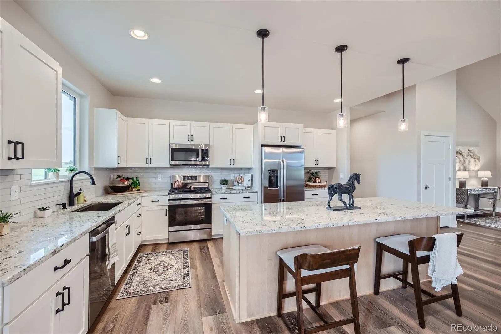Be wowed as you enter off of the 8′ deep covered front porch into the Great Room of this 3 bedroom / 2 bath home with office, to impressive LVP floors, vaulted ceilings, floor-to-ceiling stone fireplace with a wood mantle, a gourmet kitchen with granite counter tops, stainless appliances, soft-close cabinets, huge island with seating, an oversized walk-in pantry and a dining area with a walk-out to the extra wide covered grilling porch. Enjoy the views from the Master Suite and bathroom with double vanities, walk-in shower, stand-alone soaking tub, 2 walk-in closets. This home is complete with a 3 car garage that opens into the laundry room with a counter sink. Silverado ranch also offers a Community Equestrian center where owners can board their horses and utilize the oversized arena and round pen. Trails for hiking, biking and riding throughout the community are soon to be completed. 15 minutes from Schriever AFB, 23 minutes from Peterson AFB and 30 minutes from downtown Colorado Springs. If you are ready for Colorado open space, gorgeous sunsets and peaceful nights, Silverado Ranch is the place for you!