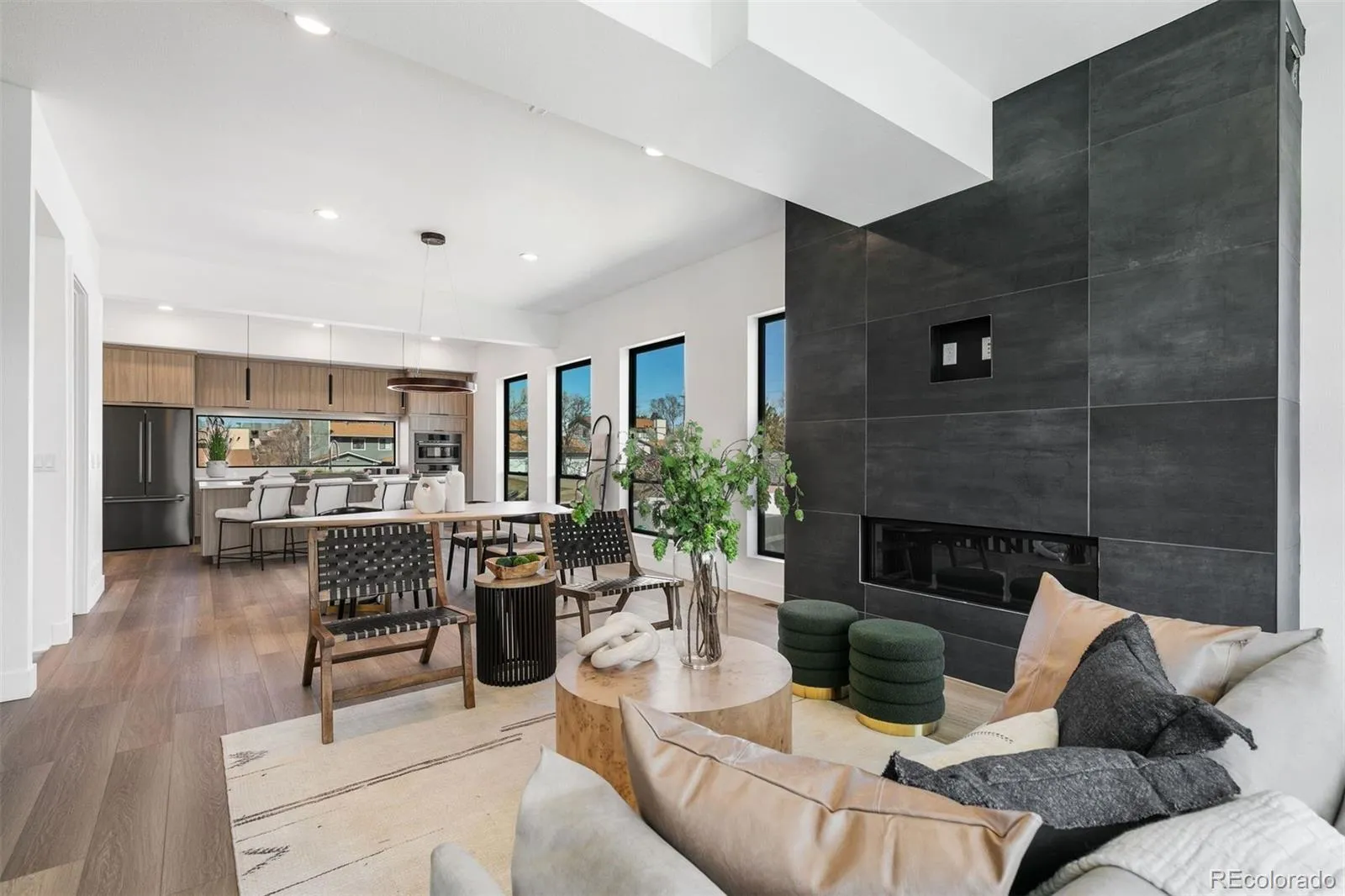 Inside, high-end finishes and thoughtful upgrades define every space. The custom kitchen features Bosch appliances, sleek cabinetry, and designer details that elevate daily living. Sunlit and spacious, the open-concept main level showcases soaring ceilings, wide-plank LVP flooring, and a stylish fireplace ideal for effortless entertaining or relaxing in comfort.
