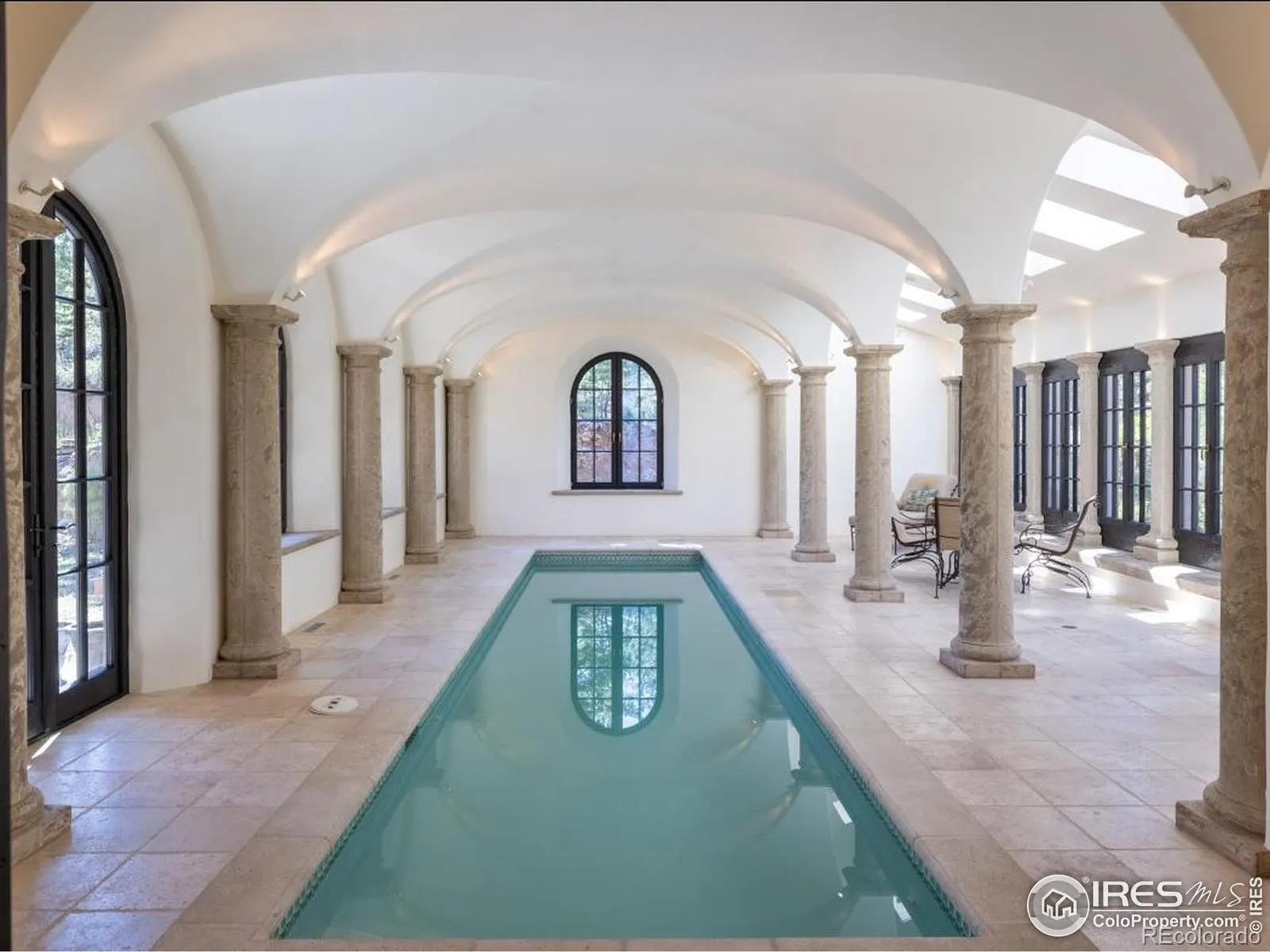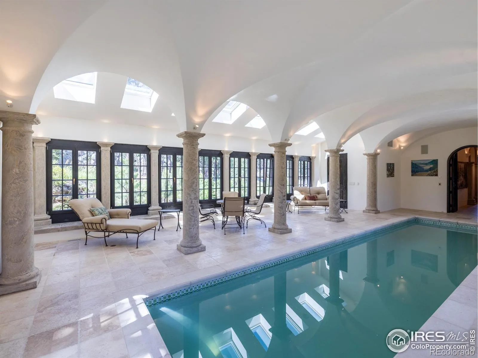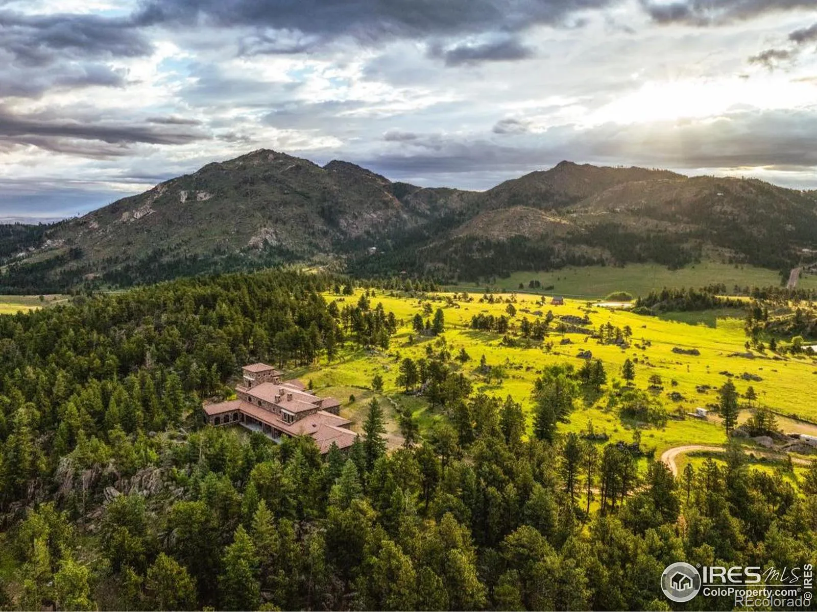 The Villa on 52 acres, including a beautiful spring-fed pond. A timeless classic in a historically unique landscape, this local landmark in the foothills boasts magnificent views, abundant granite, and natural water sources. The location provides easy access to Fort Collins, Loveland, and the Poudre Canyon. This landscape is also full of history as a significant past residential site for the Ute Indians, early pioneers, and the Pony Express. Construction on The Villa began in 2007, with the entire residence built out of full-thickness granite handpicked on the property. This Italian-inspired work of art comprises various artifacts, some dating back 2,000 years. Maintaining an affinity for the arts, the structure includes a third-floor art room with ample natural light and picturesque views, which could be converted to 6th bedroom. It honors the traditional villas of the Renaissance, and its connection with nature is evident in all the windows framing the surrounding landscape. It is luxury at its finest, blending art and function with two elevators, 14-foot-tall arched ceilings, and German wood-framed windows that swing open and tilt with dual hinges. A 32-foot-long indoor saltwater pool and lounge area offer spaces to relax and recharge, while the private office and library with a wet bar inspire creativity and productivity. A formal dining room invites guests to stay awhile, with a separate serving entrance from the kitchen through the bottle room. Off the main gourmet kitchen is an auxiliary kitchen that leads to separate living quarters. Multiple entertainment and living spaces have radiant in-floor heating for optimal comfort.Additional acreage and indoor arena available: ask about other options!