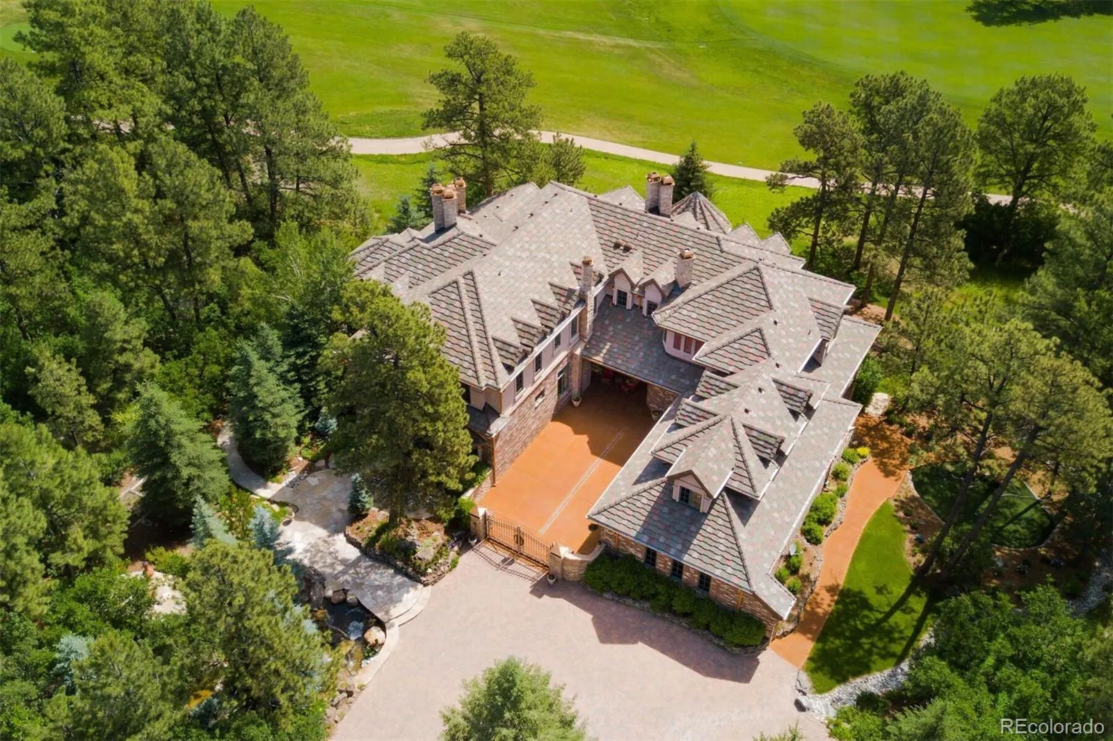 This Contemporary English Manor, set on a private lot along the 10th fairway of the Castle Pines Golf Club, offers an unparalleled blend of luxury and nature. Every detail of this home has been thoughtfully designed for ultimate comfort and sophistication. The completely updated chef’s kitchen is a dream for any cook, featuring two large islands and top-of-the-line appliances, including 4 ovens (including a steam oven), a Miele coffee system, a 6-burner gas stove with a built-in griddle, 2 dishwashers, Sub Zero refrigerator, freezer, and wine cooler. Even your furry friends were considered, with a built-in dog bowl station! The two-story library is a striking space, with a spiral staircase and a wall of windows that flood the room with natural light. Adjacent, the formal dining room is perfect for intimate gatherings, while the family room features wood ceilings and a massive antler chandelier. Expansive windows overlook the lush golf course, seamlessly blending indoor and outdoor beauty. All 8 bathrooms have been completely updated, and new flooring and LED lighting can be found throughout. Upstairs, two large secondary bedroom suites offer privacy, and a huge bonus space near the primary suite is currently being used as a home gym. The primary suite itself offers a cozy fireplace, stunning golf course views, and a spa-like bath with a steam shower, dual vanities, and a freestanding tub. Custom doors crafted from Maryland black walnut add a unique and luxurious touch to the suite. The lower level includes an additional guest ensuite, a large stately office, a home theater, a climate-controlled wine room, and a fully equipped bar perfect for entertaining or a quiet evening in. The home also features two laundry rooms, a sleek tube-style elevator that connects all three levels, and a 6-car garage with a 2-car lift. Outside, the heated, gated courtyard adds to the luxury, as does the outdoor covered deck with a hot tub, putting green, and dramatic lava rock fire pit.