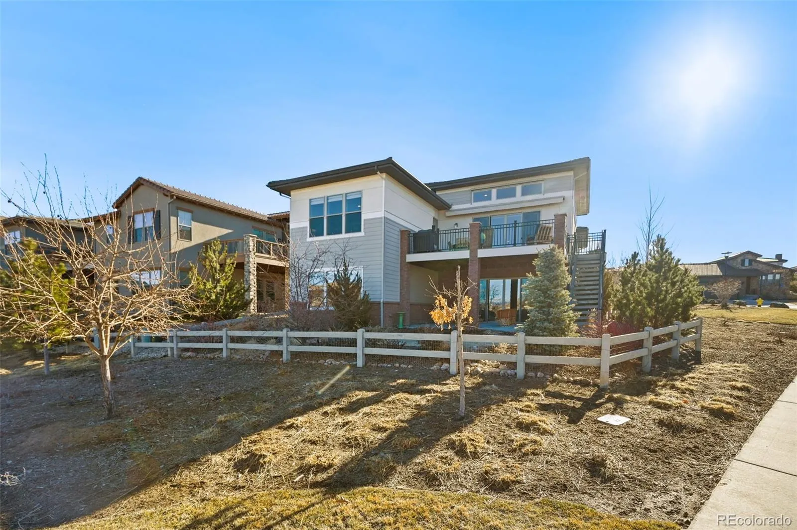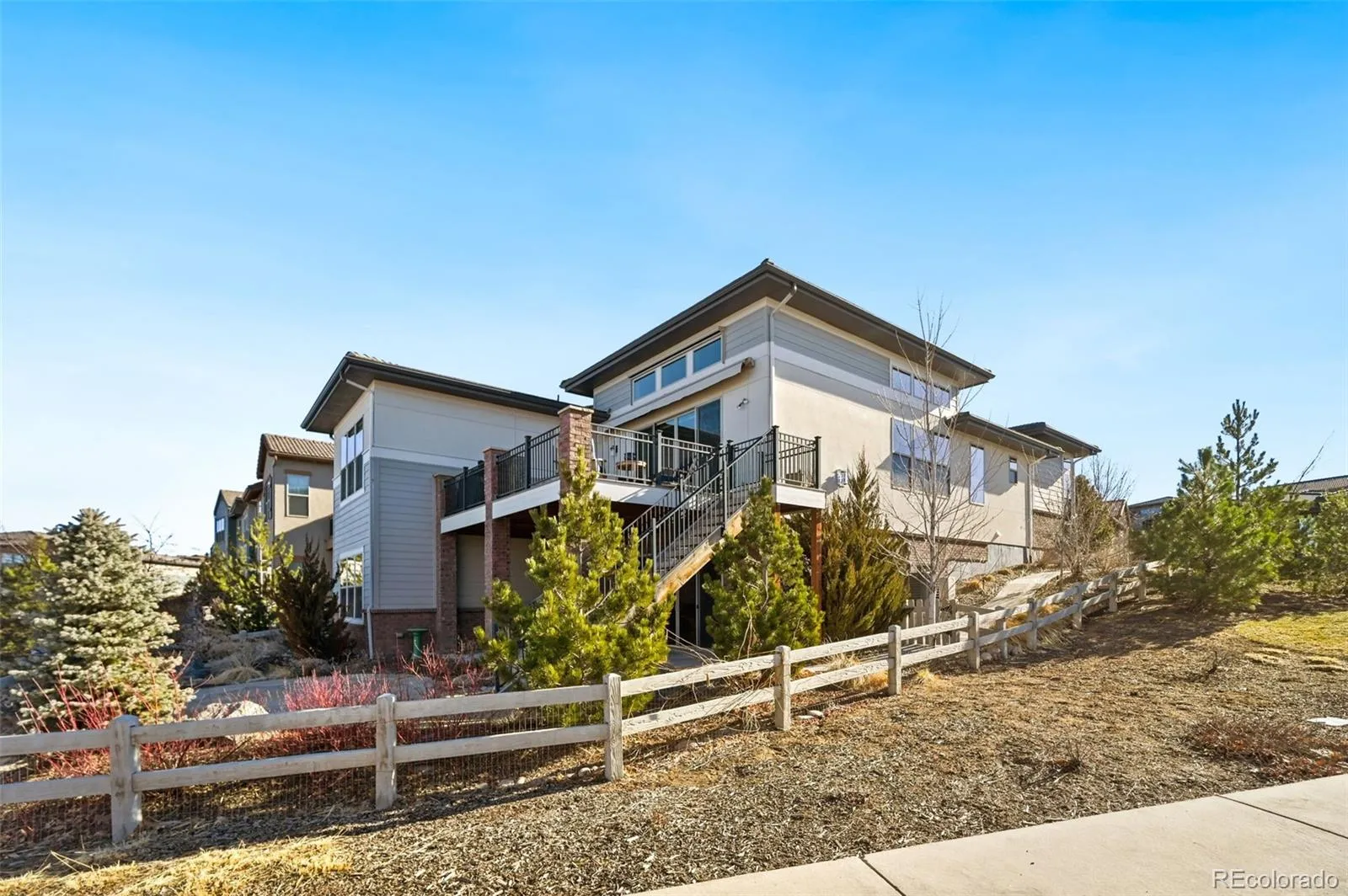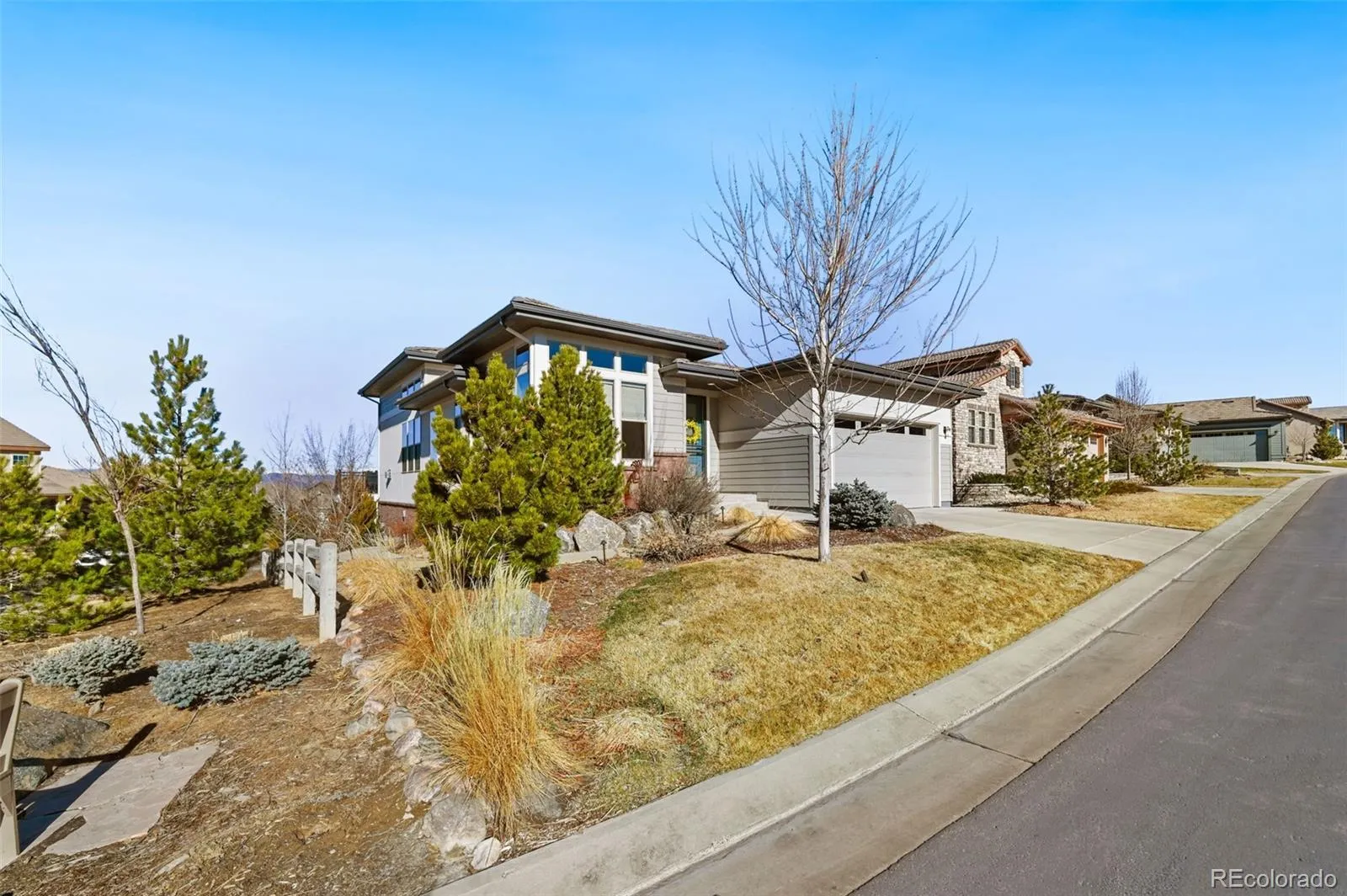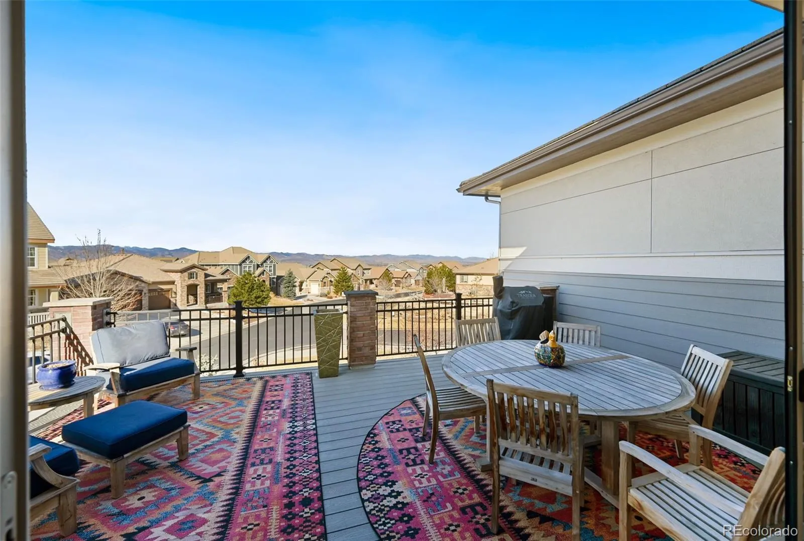 BACK ON MARKET! MOUNTAIN VIEWS! CORNER LOT! Upon entry, be wowed by the expansive front range views of this exceptional ranch style home located in the gated community of Backcountry. Wake up in your primary suite to striking views of Colorado sunrises reflecting off the front range. Your primary bath offers gorgeous tile upgrades, expanded shower with rain and handheld showerheads, and dual vanities. The large walk in closet boasts Closet Factory built-ins and a convenient access door to the laundry room. The chef’s kitchen provides ample space with wall to ceiling cabinetry and quartz countertops with beautiful tile backsplash. Cook and entertain in style with upgraded GE Cafe appliances and a custom kitchen island that adds both charm and storage. Off the kitchen find a large walk-in pantry with electrical outlet upgrades. Enjoy spectacular sunsets from your great room area, or step out onto your grand deck complete with retractable awning for those afternoon barbeques. This home also features a stairway off the deck which is a rare feature in the Painted Sky line of homes. On the main level you will also find an office with a full en-suite bath. Office can easily be converted to a second bedroom with already existing en-suite full bath. The walkout basement level features a large recreation room, 2 additional bedrooms and a full bath. Stay comfortable year round with a whole house humidifier. Xeriscape landscaping makes for easy yard maintenance and HOA includes snow removal of driveway and front walk. Custom built exterior trash/recycling can enclosure-perfect for keeping things organized and out of sight. Be sure to tour the Sundial house and Discovery Center featuring fitness center, pool, hot tubs, gathering spaces, restaurant, and coffee shop. Enjoy the Backcountry lifestyle with activities including social gatherings, a variety of clubs to get involved with, and outdoor concerts and events.