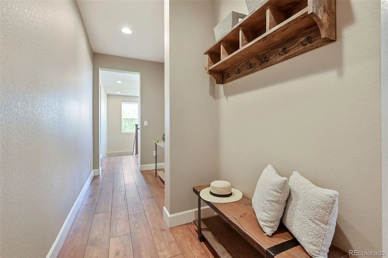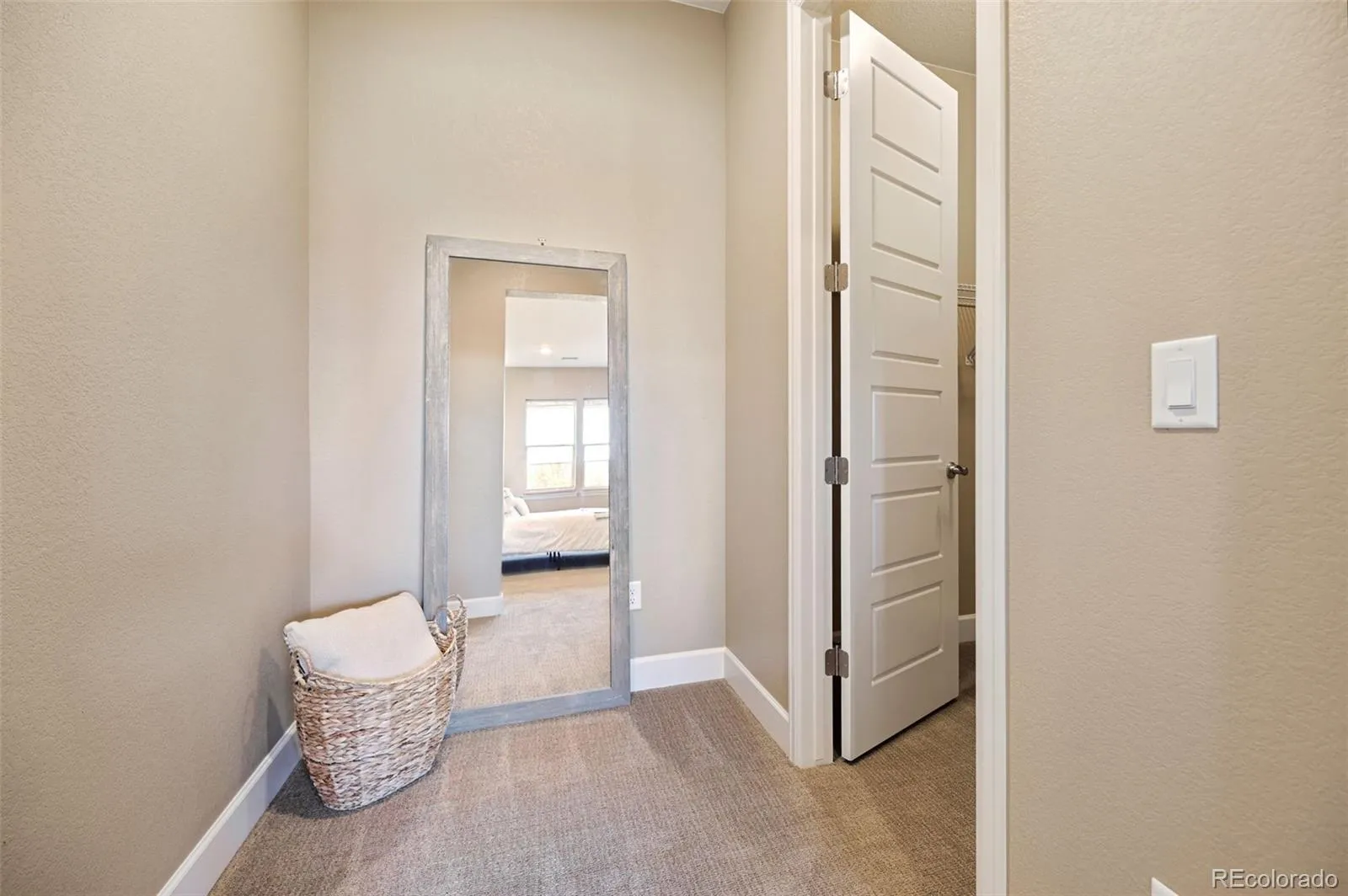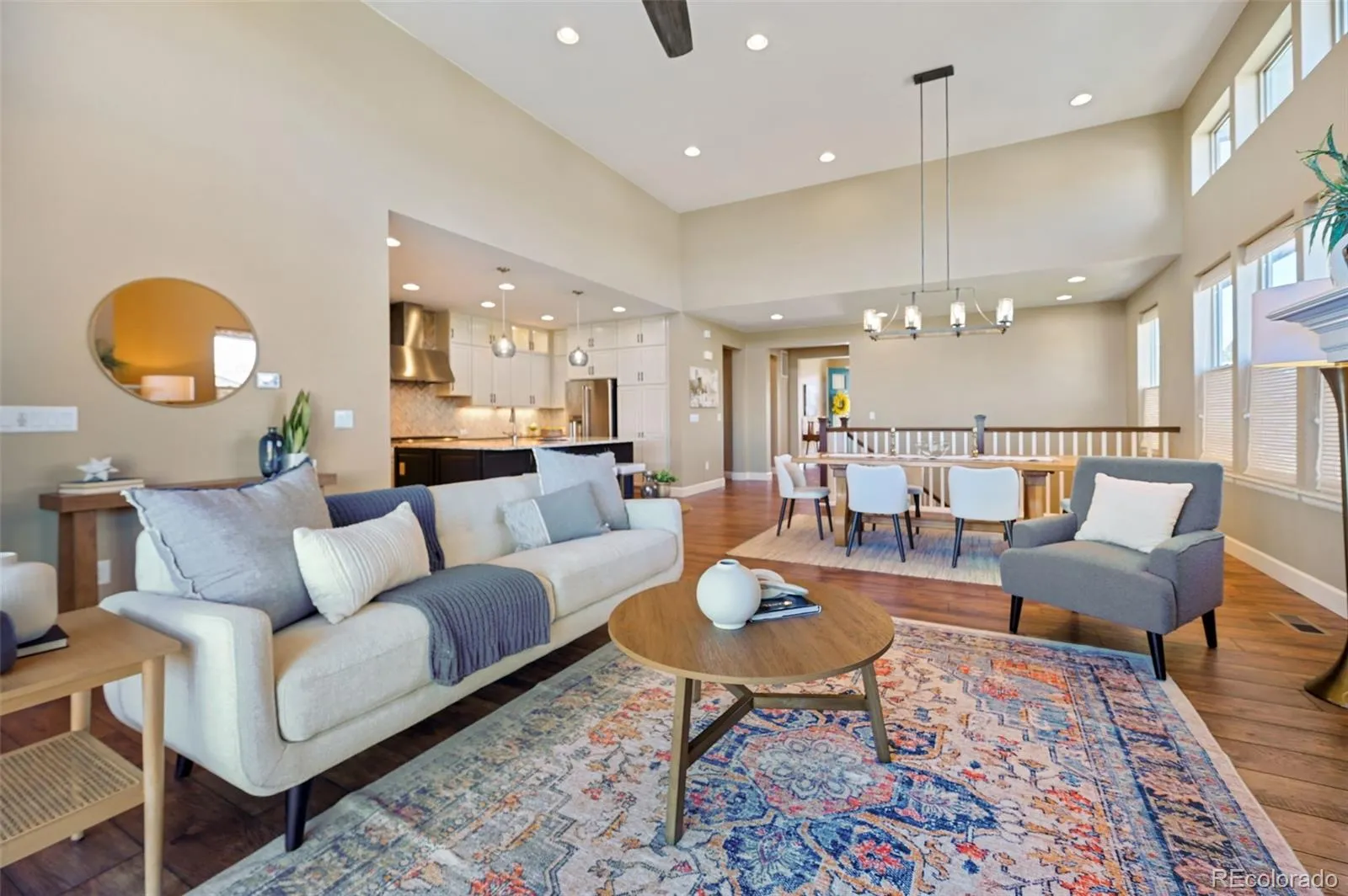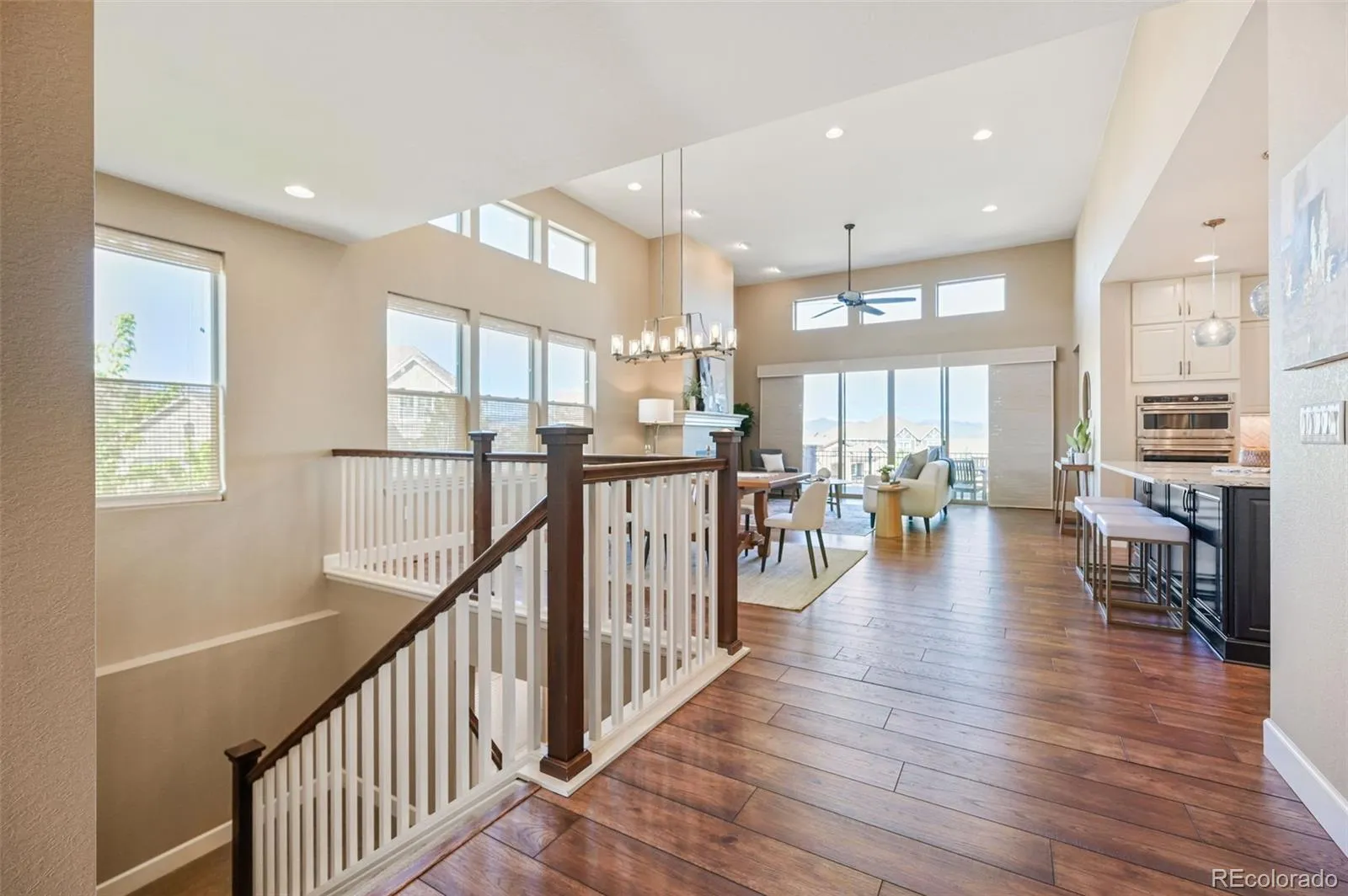 BACK ON MARKET! MOUNTAIN VIEWS! CORNER LOT! Upon entry, be wowed by the expansive front range views of this exceptional ranch style home located in the gated community of Backcountry. Wake up in your primary suite to striking views of Colorado sunrises reflecting off the front range. Your primary bath offers gorgeous tile upgrades, expanded shower with rain and handheld showerheads, and dual vanities. The large walk in closet boasts Closet Factory built-ins and a convenient access door to the laundry room. The chef’s kitchen provides ample space with wall to ceiling cabinetry and quartz countertops with beautiful tile backsplash. Cook and entertain in style with upgraded GE Cafe appliances and a custom kitchen island that adds both charm and storage. Off the kitchen find a large walk-in pantry with electrical outlet upgrades. Enjoy spectacular sunsets from your great room area, or step out onto your grand deck complete with retractable awning for those afternoon barbeques. This home also features a stairway off the deck which is a rare feature in the Painted Sky line of homes. On the main level you will also find an office with a full en-suite bath. Office can easily be converted to a second bedroom with already existing en-suite full bath. The walkout basement level features a large recreation room, 2 additional bedrooms and a full bath. Stay comfortable year round with a whole house humidifier. Xeriscape landscaping makes for easy yard maintenance and HOA includes snow removal of driveway and front walk. Custom built exterior trash/recycling can enclosure-perfect for keeping things organized and out of sight. Be sure to tour the Sundial house and Discovery Center featuring fitness center, pool, hot tubs, gathering spaces, restaurant, and coffee shop. Enjoy the Backcountry lifestyle with activities including social gatherings, a variety of clubs to get involved with, and outdoor concerts and events.