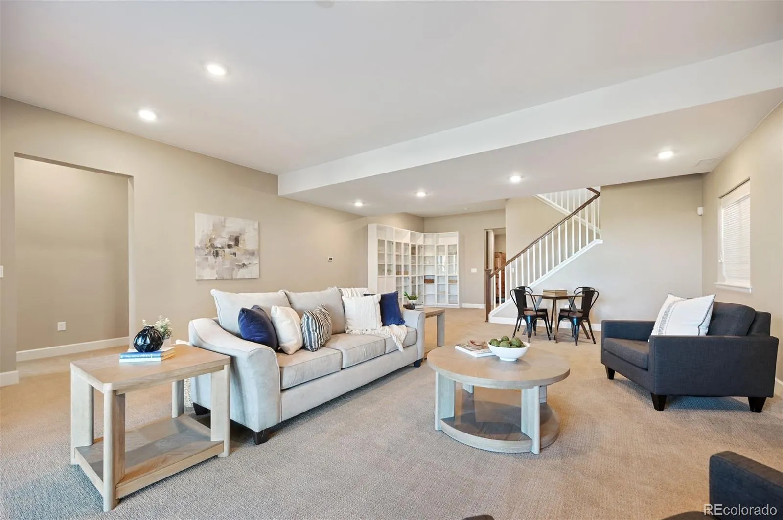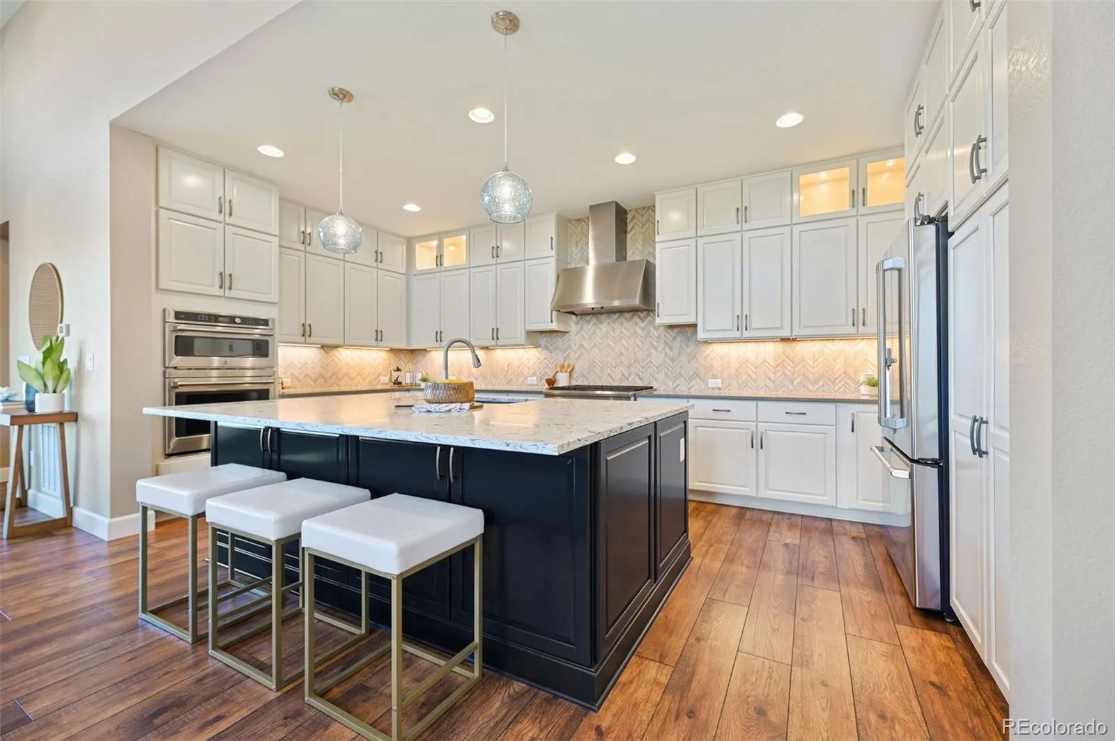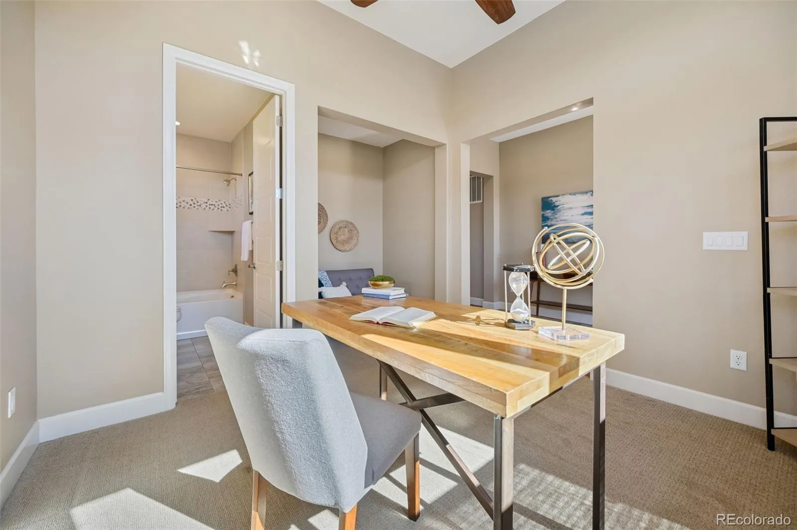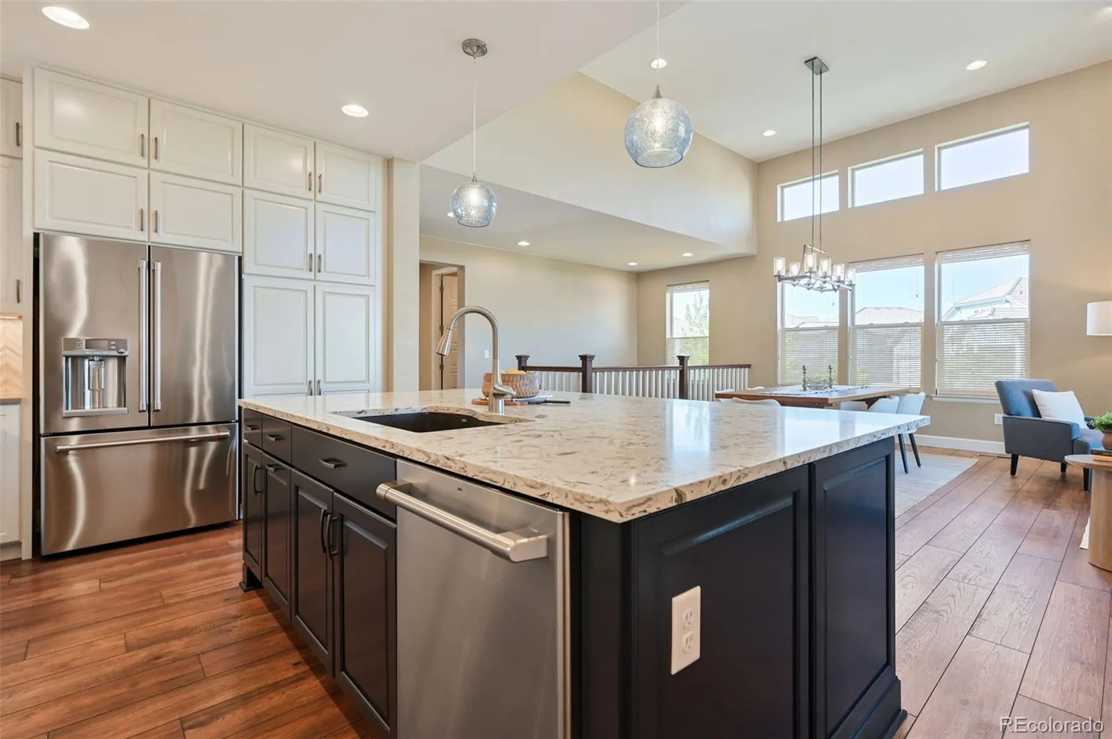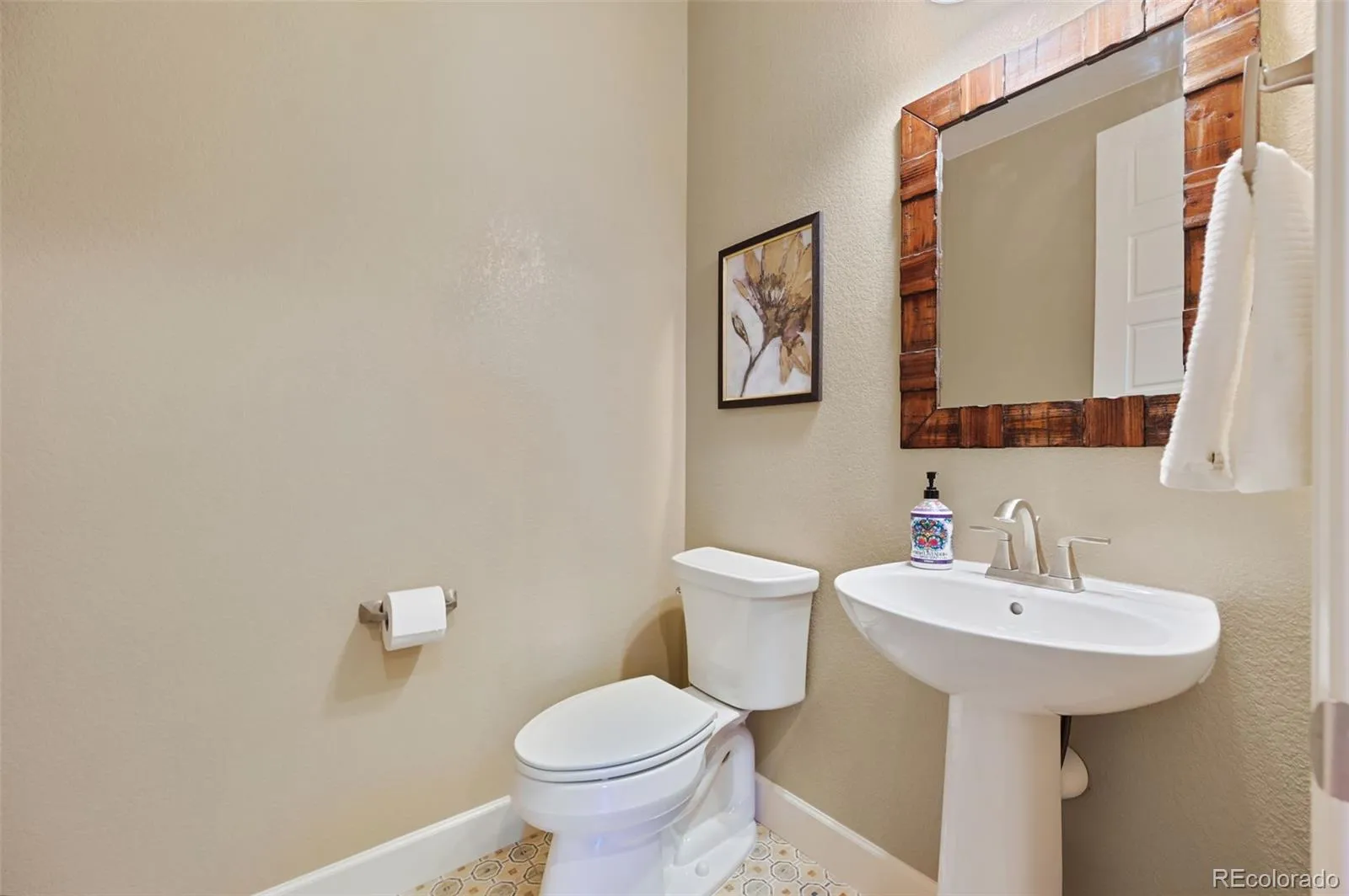 BACK ON MARKET! MOUNTAIN VIEWS! CORNER LOT! Upon entry, be wowed by the expansive front range views of this exceptional ranch style home located in the gated community of Backcountry. Wake up in your primary suite to striking views of Colorado sunrises reflecting off the front range. Your primary bath offers gorgeous tile upgrades, expanded shower with rain and handheld showerheads, and dual vanities. The large walk in closet boasts Closet Factory built-ins and a convenient access door to the laundry room. The chef’s kitchen provides ample space with wall to ceiling cabinetry and quartz countertops with beautiful tile backsplash. Cook and entertain in style with upgraded GE Cafe appliances and a custom kitchen island that adds both charm and storage. Off the kitchen find a large walk-in pantry with electrical outlet upgrades. Enjoy spectacular sunsets from your great room area, or step out onto your grand deck complete with retractable awning for those afternoon barbeques. This home also features a stairway off the deck which is a rare feature in the Painted Sky line of homes. On the main level you will also find an office with a full en-suite bath. Office can easily be converted to a second bedroom with already existing en-suite full bath. The walkout basement level features a large recreation room, 2 additional bedrooms and a full bath. Stay comfortable year round with a whole house humidifier. Xeriscape landscaping makes for easy yard maintenance and HOA includes snow removal of driveway and front walk. Custom built exterior trash/recycling can enclosure-perfect for keeping things organized and out of sight. Be sure to tour the Sundial house and Discovery Center featuring fitness center, pool, hot tubs, gathering spaces, restaurant, and coffee shop. Enjoy the Backcountry lifestyle with activities including social gatherings, a variety of clubs to get involved with, and outdoor concerts and events.