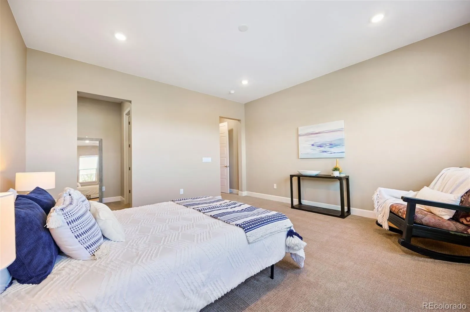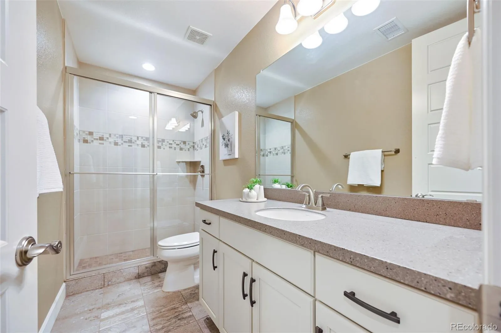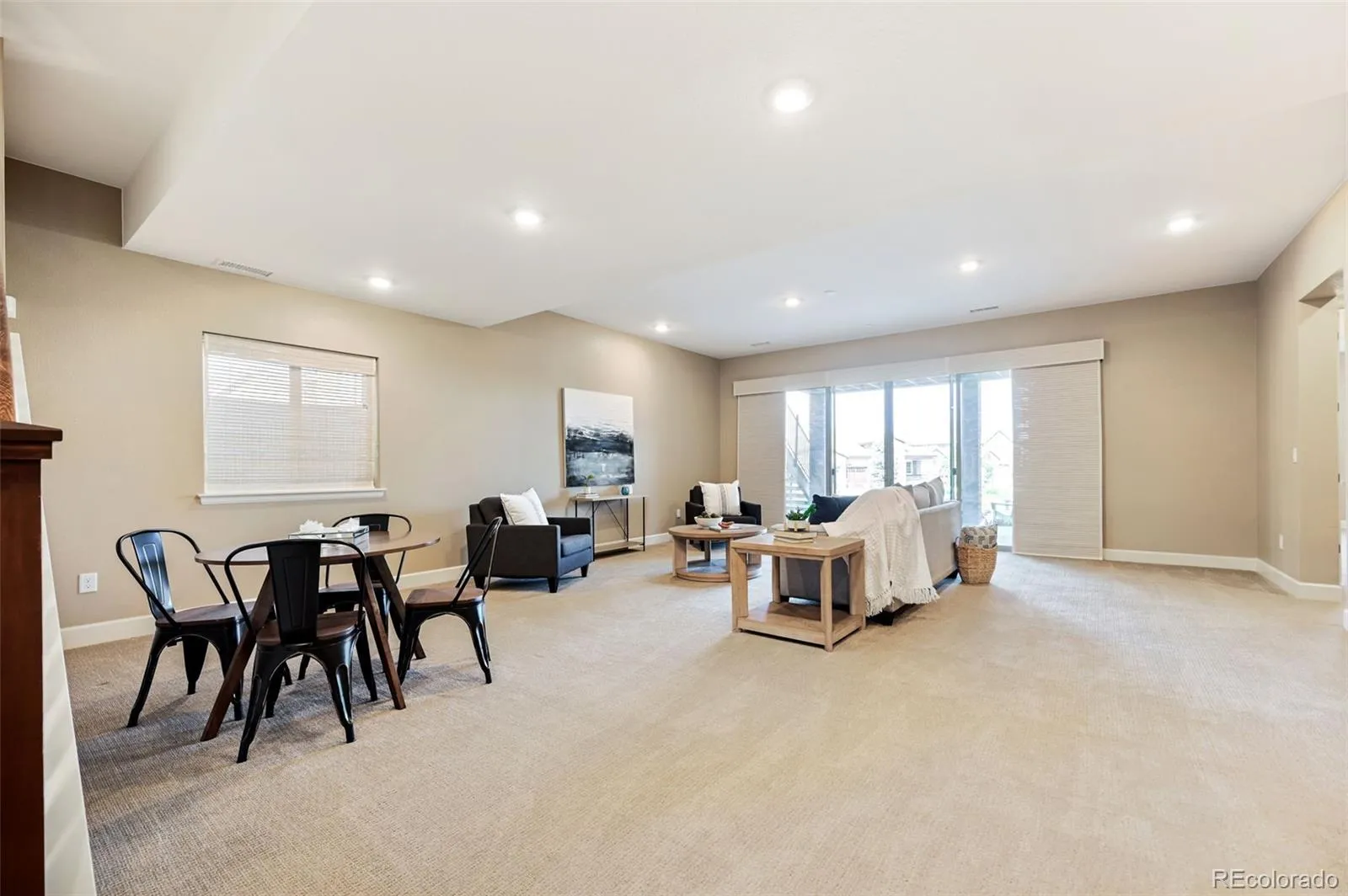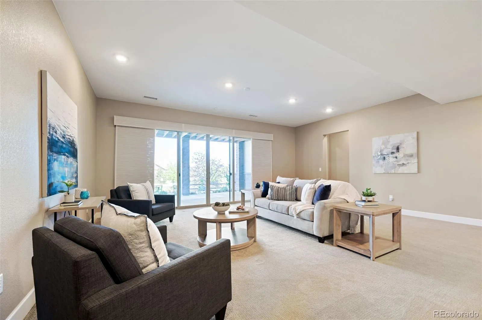BACK ON MARKET! MOUNTAIN VIEWS! CORNER LOT! Upon entry, be wowed by the expansive front range views of this exceptional ranch style home located in the gated community of Backcountry. Wake up in your primary suite to striking views of Colorado sunrises reflecting off the front range. Your primary bath offers gorgeous tile upgrades, expanded shower with rain and handheld showerheads, and dual vanities. The large walk in closet boasts Closet Factory built-ins and a convenient access door to the laundry room. The chef’s kitchen provides ample space with wall to ceiling cabinetry and quartz countertops with beautiful tile backsplash. Cook and entertain in style with upgraded GE Cafe appliances and a custom kitchen island that adds both charm and storage. Off the kitchen find a large walk-in pantry with electrical outlet upgrades. Enjoy spectacular sunsets from your great room area, or step out onto your grand deck complete with retractable awning for those afternoon barbeques. This home also features a stairway off the deck which is a rare feature in the Painted Sky line of homes. On the main level you will also find an office with a full en-suite bath. Office can easily be converted to a second bedroom with already existing en-suite full bath. The walkout basement level features a large recreation room, 2 additional bedrooms and a full bath. Stay comfortable year round with a whole house humidifier. Xeriscape landscaping makes for easy yard maintenance and HOA includes snow removal of driveway and front walk. Custom built exterior trash/recycling can enclosure-perfect for keeping things organized and out of sight. Be sure to tour the Sundial house and Discovery Center featuring fitness center, pool, hot tubs, gathering spaces, restaurant, and coffee shop. Enjoy the Backcountry lifestyle with activities including social gatherings, a variety of clubs to get involved with, and outdoor concerts and events.