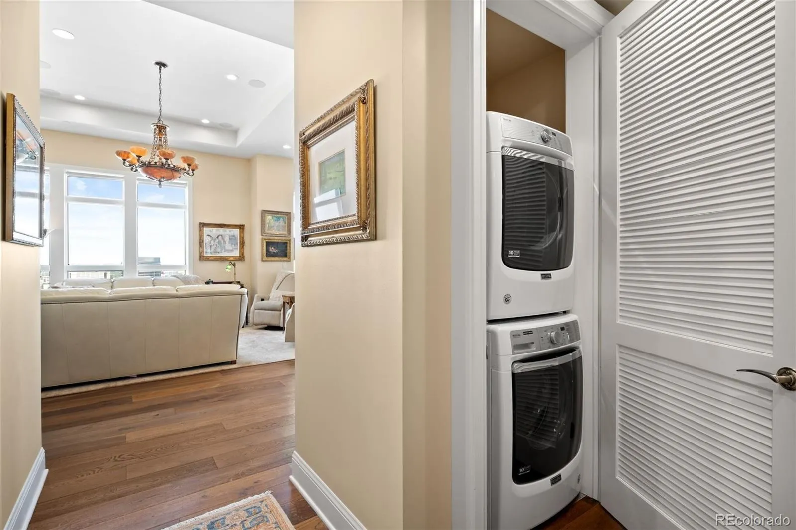 Discover luxury living in this exceptional Landmark penthouse, originally designed as the developer’s residence, there is truly no other floor plan like it. Spanning 2,244 SF, this 3-bedroom, 2.5-bath home offers breathtaking views of the Front Range and downtown Denver from two spacious balconies. To help potential buyers with different design aesthetics imagine themselves here, we’ve modified the photos to showcase how simple updates to lighting and decor can dramatically transform the space. These visualizations highlight how easily the home can be tailored to appeal to a broad spectrum of tastes—whether transitional, modern, or traditional. As you enter, a welcoming foyer leads to a bright and airy open-concept living space, perfect for entertaining. The updated gas fireplace serves as a striking focal point, complemented by new walnut wide-plank flooring. The gourmet kitchen is a chef’s dream with a Sub Zero refrigerator, Miele panel dishwasher, beautiful granite countertops, updated backsplash, chic cabinet hardware, and a water filtration system. The expansive primary suite features a custom walk-in closet and a spa-like bath with oversized frameless glass shower, soaking tub, dual vanities, and private water closet. A versatile 2nd bedroom doubles as an office or gym with access to a protected inset balcony. On the opposite side, a 3rd bedroom with a custom closet and 3/4 bath completes the layout. Additional highlights include custom closets by Closets by Design, abundant storage with rollout drawers, new carpet, upgraded hardware, an Aprilaire whole-house humidifier, and a new heat pump for comfort and peace of mind. Living at The Landmark means enjoying concierge services, pools, spas, sauna/steam, guest suites, theater, and more. This penthouse is truly one of a kind—luxury living tailored for every taste. *Furniture negotiable*