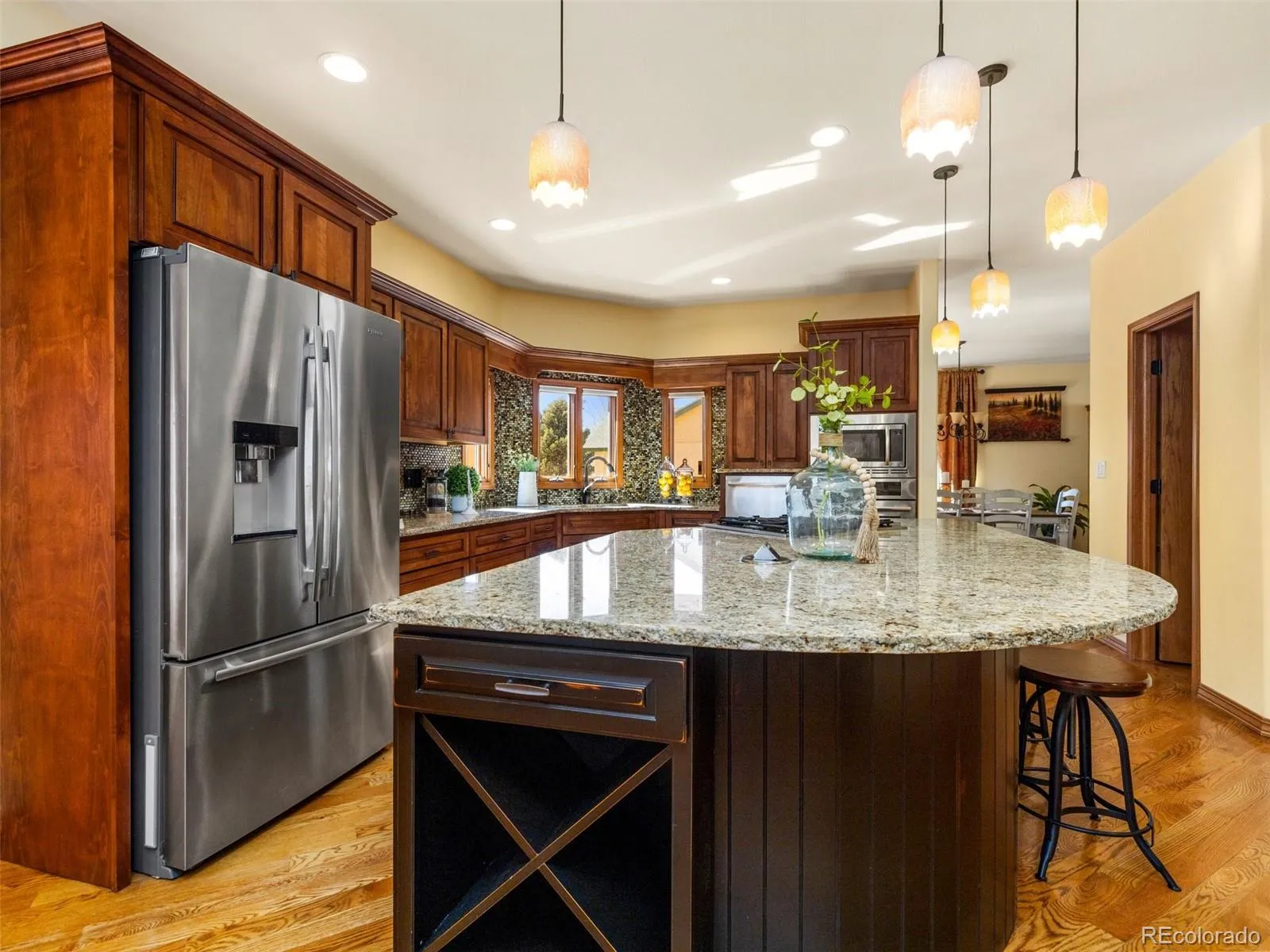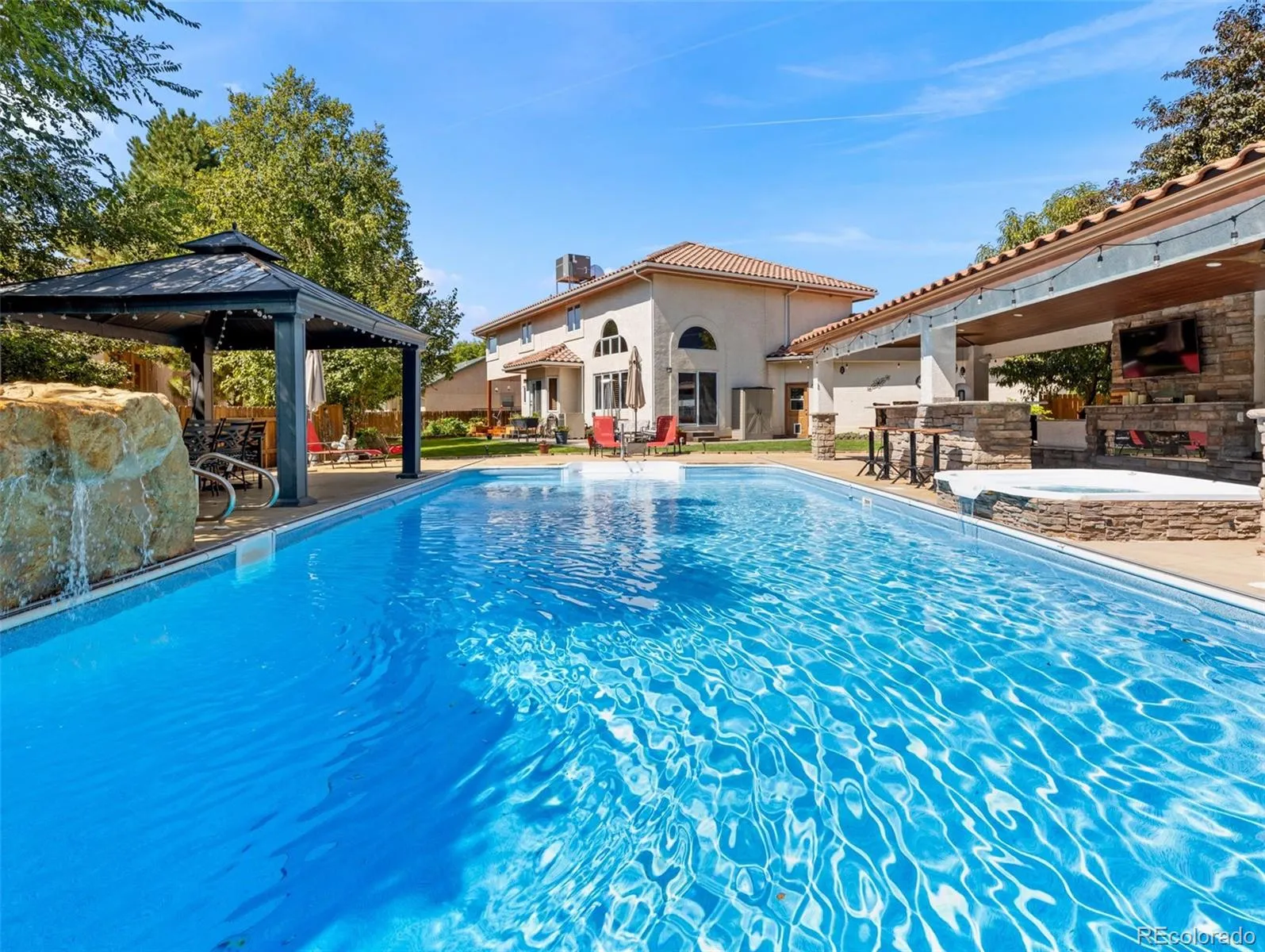Take Advantage of This New Price! Don’t miss this exceptional opportunity to embrace luxury in this stunning 2-story home located in the prestigious El Camino neighborhood. Featuring 5 bedrooms, 5 bathrooms, and over 5,000 sq ft of beautifully remodeled living space, this home seamlessly combines elegance, comfort, and functionality. Step into nearly 2,000 sq ft on the main level, where you’ll be welcomed by soaring vaulted ceilings, a spacious formal living and dining area, and a gourmet kitchen that’s truly the heart of the home. The chef’s kitchen boasts a large granite island, stainless steel appliances including a gas cooktop, double ovens, a warming drawer, custom cabinetry, and a designer tile backsplash—perfect for entertaining and hosting in style. Upstairs, you’ll find four spacious bedrooms, including a luxurious primary suite featuring a custom slate accent wall, a spa-inspired bathroom, an expansive walk-in closet, and a walk-in shower that offers the ultimate in relaxation. The fully finished basement expands your living space with a home theater, hobby room, dry bar, and an additional bedroom and bathroom, ideal for guests or multigenerational living. And then there’s the backyard oasis—a show-stopping retreat complete with a covered outdoor kitchen, saltwater in-ground pool, built-in hot tub, serene ponds, gazebo, and Rocky Mountain Trim lighting for evening ambiance. Backing to a private greenbelt, this space is perfect for entertaining or simply unwinding in peaceful seclusion.