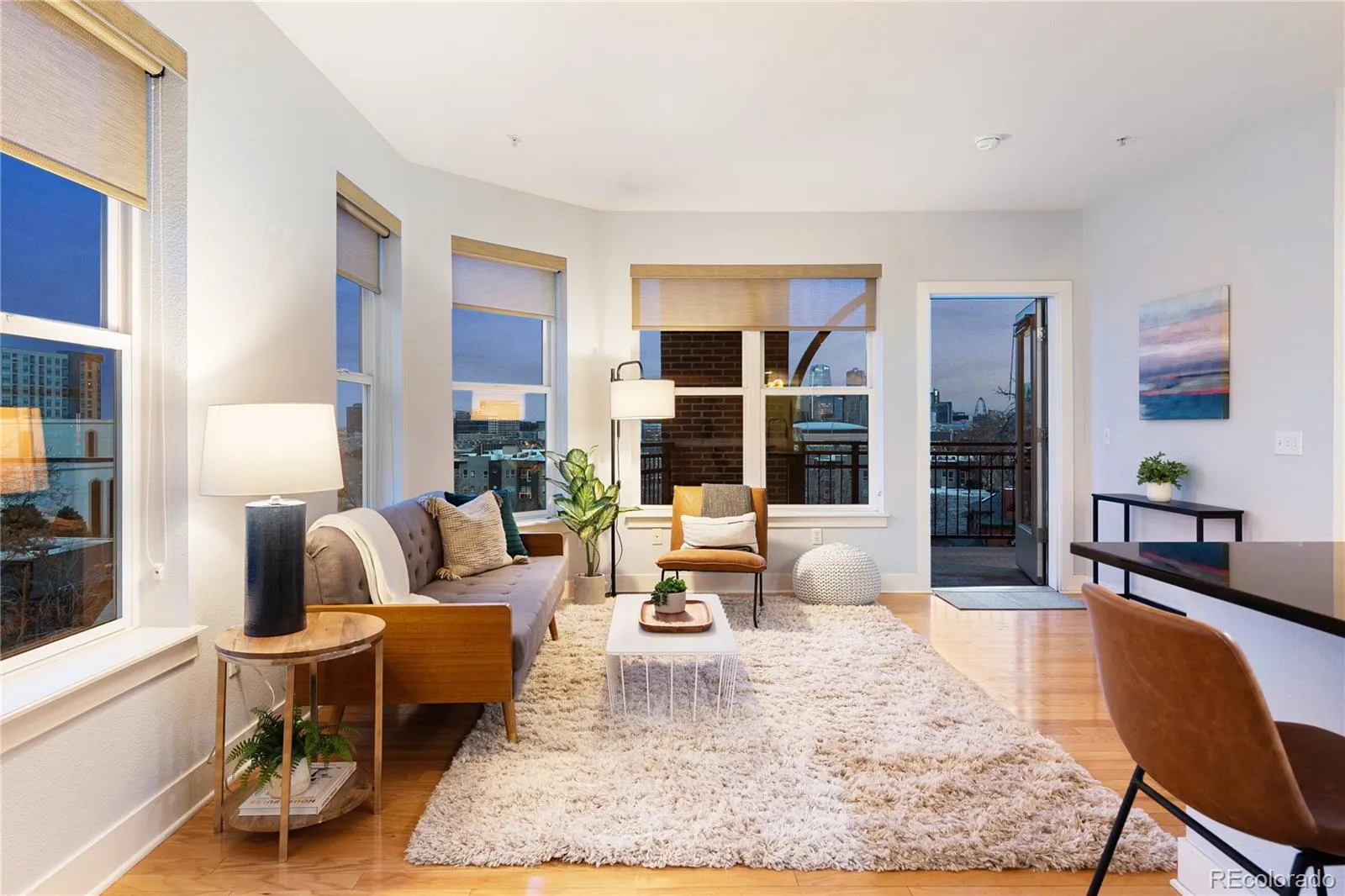 Welcome to an exceptional 2-bed, 2-bath corner condo on the 5th floor of the Riverclay building in Denver’s vibrant Jefferson Park. This unit boasts panoramic north and east-facing windows that frame breathtaking city views. Inside, you’ll find an open-concept living area with wood floors, a well-equipped kitchen with European-style frameless cabinets, granite counters, and stainless steel appliances. A spacious, east-facing balcony is perfect for relaxing and enjoying the expansive city views. The primary bedroom offers a serene retreat with an en-suite 5-piece bath complete with a soaking tub, while the second bedroom features its own patio—ideal for morning coffee or a home office. The second bedroom (conforming) has its own private, north-facing balcony. Deeded parking space and storage in the garage. The building amenities include a fitness center, secured parking, and LEED-certified energy efficiency. With Jefferson Park, restaurants, coffee shops and top Denver attractions just steps away, this condo delivers the ultimate urban lifestyle.