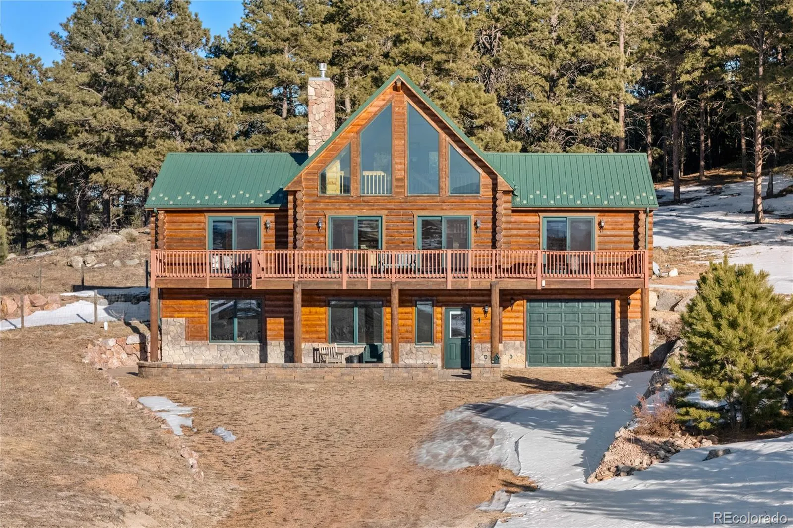 Glimpse YOUR paradise! Nestled at the base of Sunset peak and Sunrise ridge, amongst the tapestry of rolling meadows, ancient Ponderosa Pines and majestic rock formations,is the legacy refuge you’ve been dreaming of. A custom log home with unparalleled 95+ acres awaits you and your 4-legged friends.The property has a spacious 4 stall horse barn (approx.48’X24’) with frost-proof water. Outbuildings: A feed/equipment/livestock barn(approx.65’X20’ with overhead doors on each end), a 2 stall loafing shed (approx.26’X24’), an open loafing shed (approx.28’X14’) and a workshop/storage with overhead door (approx. 24’X16’). The diverse landscape attracts a wide array of wildlife-a perfect pairing for outdoor enthusiasts. The warm and open floorplan of the home greets you with sunshine and panoramic views of Pikes Peak and nature on every side. 10” logs lend charm and substance to the interior and exterior of this home. The rock and slab stone gas fireplace warms and anchors the living space. The kitchen has an open feel, with beamed ceiling, warm hickory cabinetry, stainless steel appliances and granite countertops. An elegant hickory and granite buffet/pantry bookends the dining/kitchen area. On the main level are 2 primary suites, each generous with ensuite baths including custom tiled showers. Both suites have walk-in closets and walk-out doors to the deck. The loft has pine-planked floors and is perfect