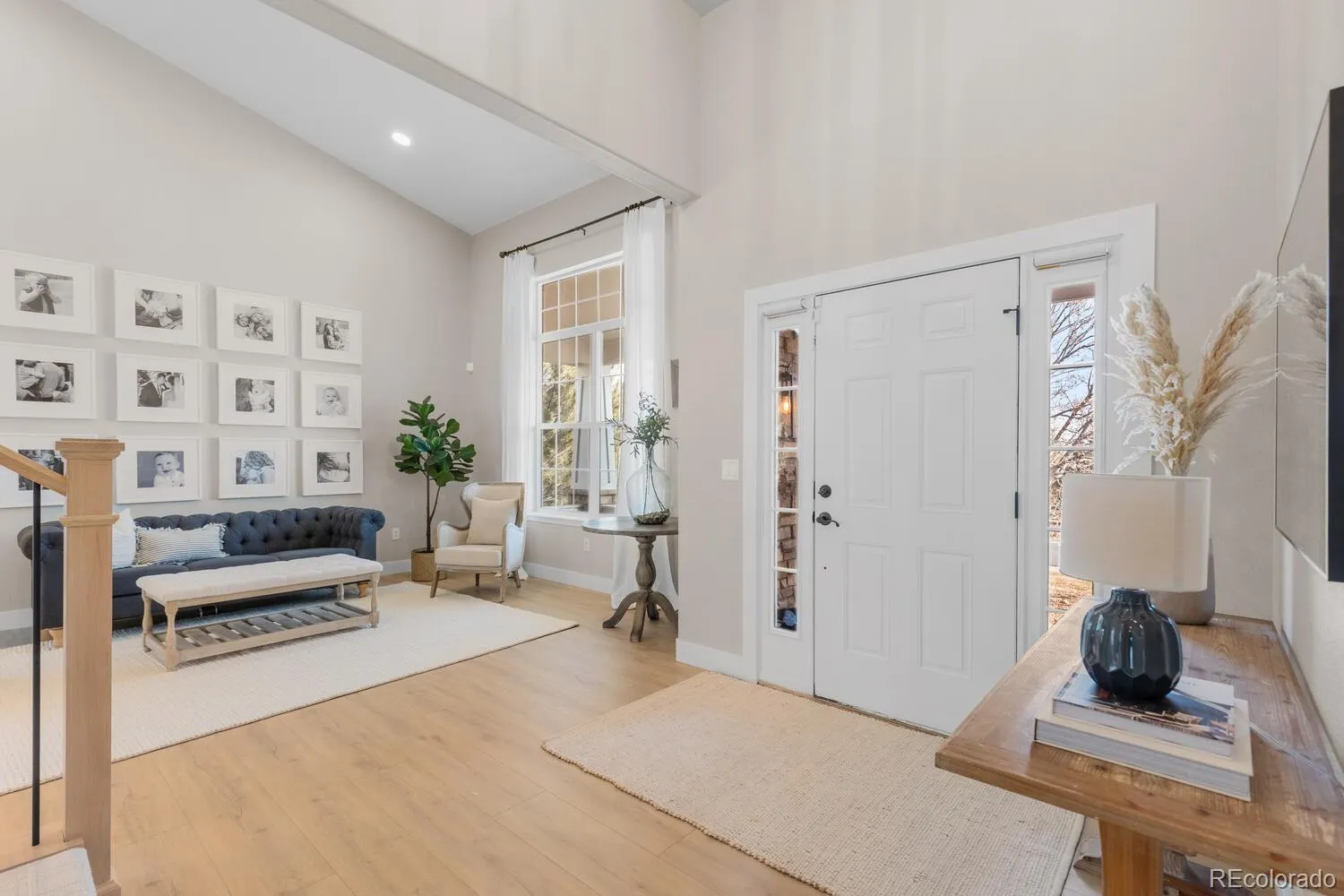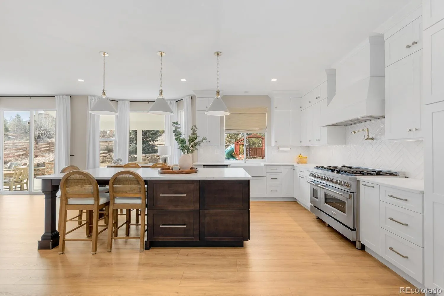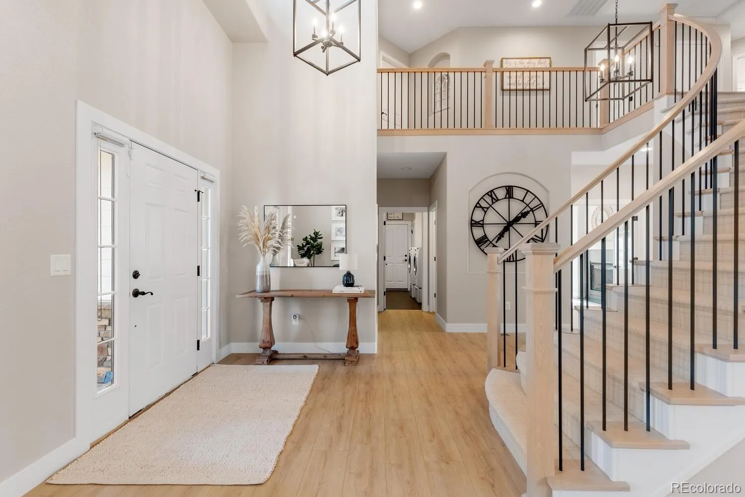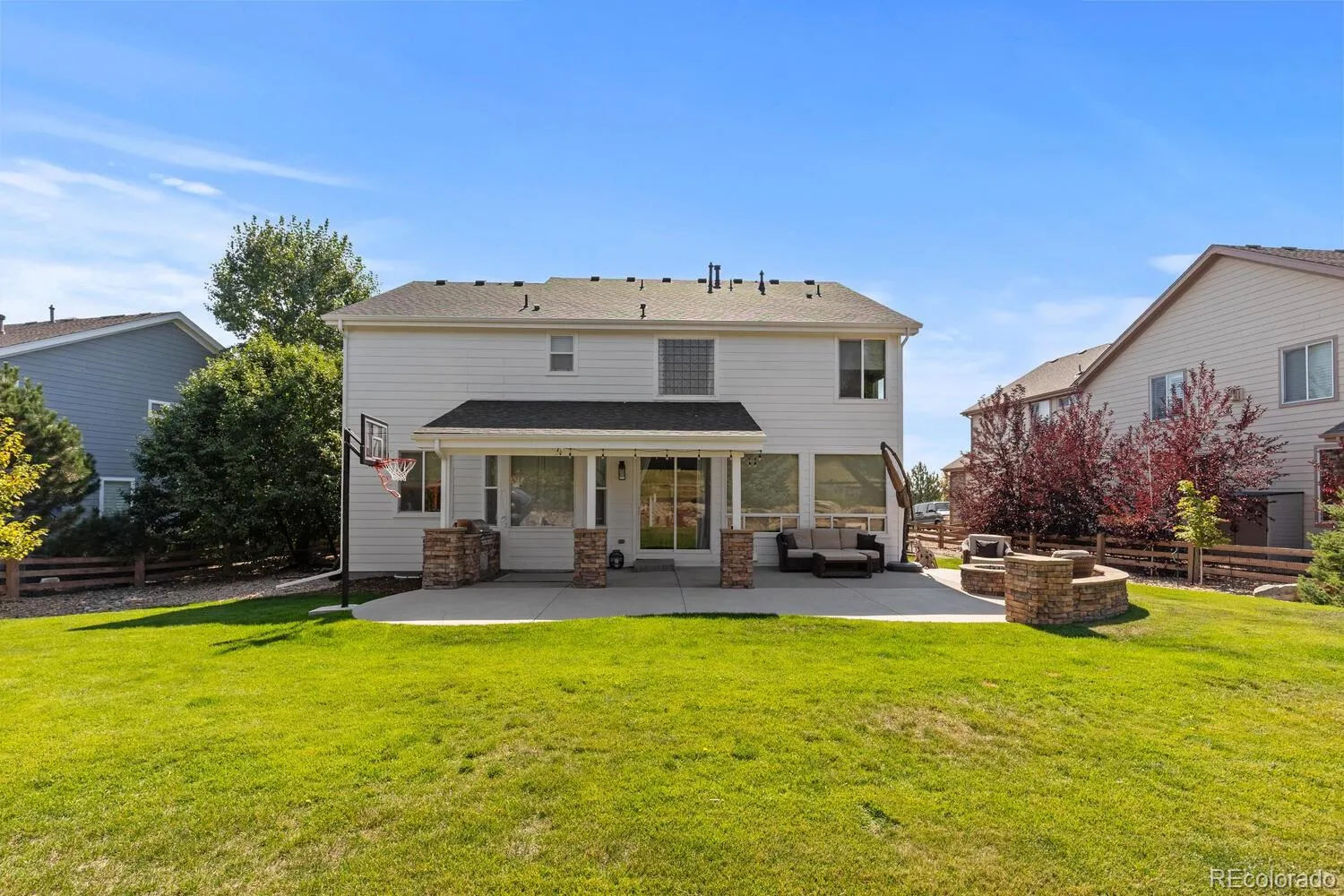 Modern luxury meets timeless sophistication in this stunning remodel in the highly coveted Pradera Golf Community! Perfectly situated on a third-acre lot backing to a greenbelt, this home blends expansive outdoor living with over $275K in thoughtful updates, making it truly one-of-a-kind.The striking curb appeal and welcoming front porch set the stage for the refined design inside. Step through the door to soaring vaulted ceilings, a dramatic curved staircase, light oak flooring, designer finishes, and a neutral palette that creates an inviting open concept flow. The gourmet kitchen is a showpiece, featuring high-end appliances, a custom wood vent hood, brass pot filler, expansive island, luxury wide plank flooring, and designer lighting. The dining room, great room, kids’ office spaces, updated powder bath, and redesigned laundry/mudroom all flow seamlessly together for everyday function and entertaining alike. Upstairs, the master retreat offers a cozy fireplace, spa-like five-piece bath, and generous walk-in closet. Three additional bedrooms and two bathrooms complete the upper level. The finished basement adds nearly 1,800 SF of versatile living: a glass enclosed home gym, two bedrooms, a full bath, under-stair play nook, and a family room with a built-in bar—perfect for movie nights or entertaining. The oversized three-car garage provides extra storage for all your gear, while the backyard retreat boasts a covered patio with fire pit, outdoor kitchen, and built-in basketball hoop for endless enjoyment. Living in Pradera means access to premier community amenities including trails, open space, playgrounds, pool, parks, and an optional golf membership. All with easy access to I-25, DTC, Castle Rock, shopping, dining, and more!
