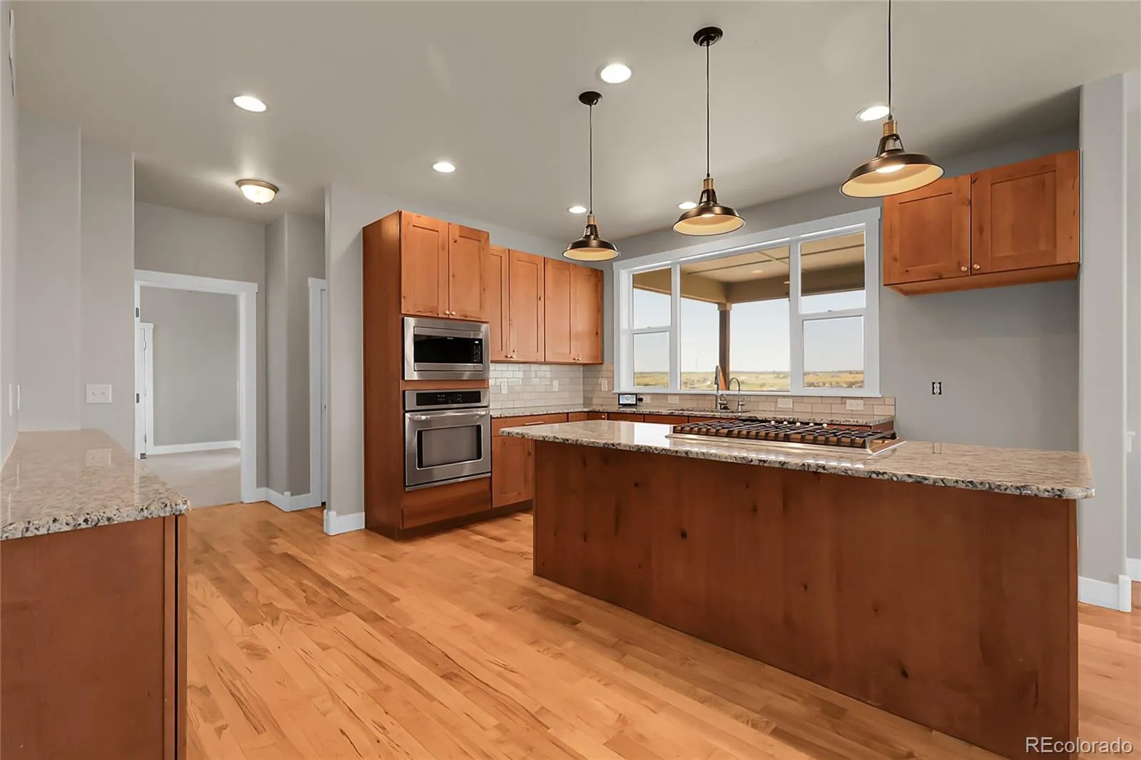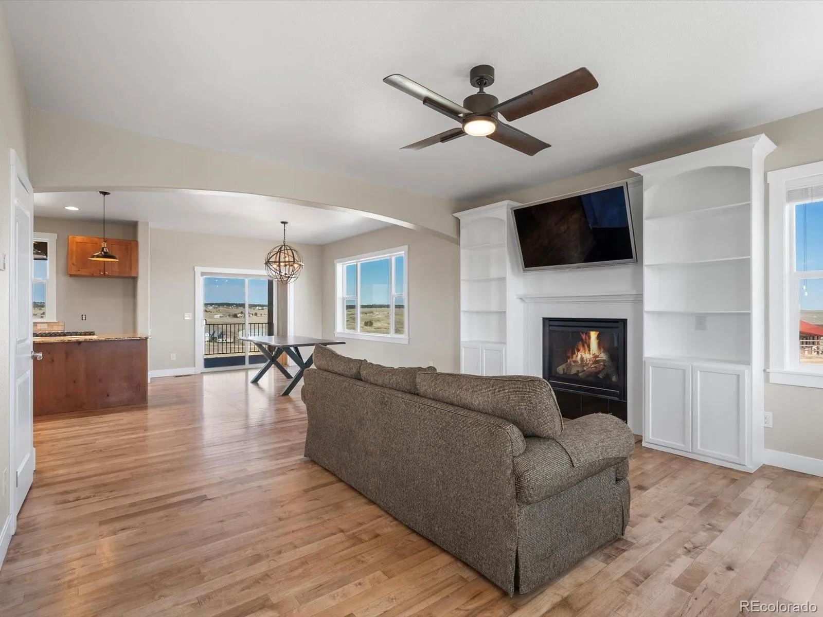 Inside, you’ll find hickory wood floors throughout the main level, leading to an updated kitchen with big windows overlooking the property. The living room features a cozy gas fireplace and custom built-ins. A main-floor bedroom can be used as a guest room or office.
