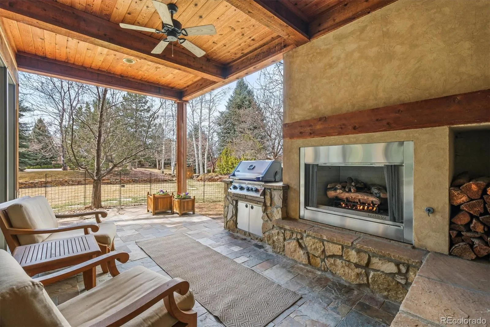 Outside, the large lot features a slate patio with fireplace, extensive landscaping, and a fenced dog area. Enjoy panoramic views from the upstairs patio with a wet bar and fireplace. The three-car garage, porte cochere, and motor court ensure convenience and privacy.
