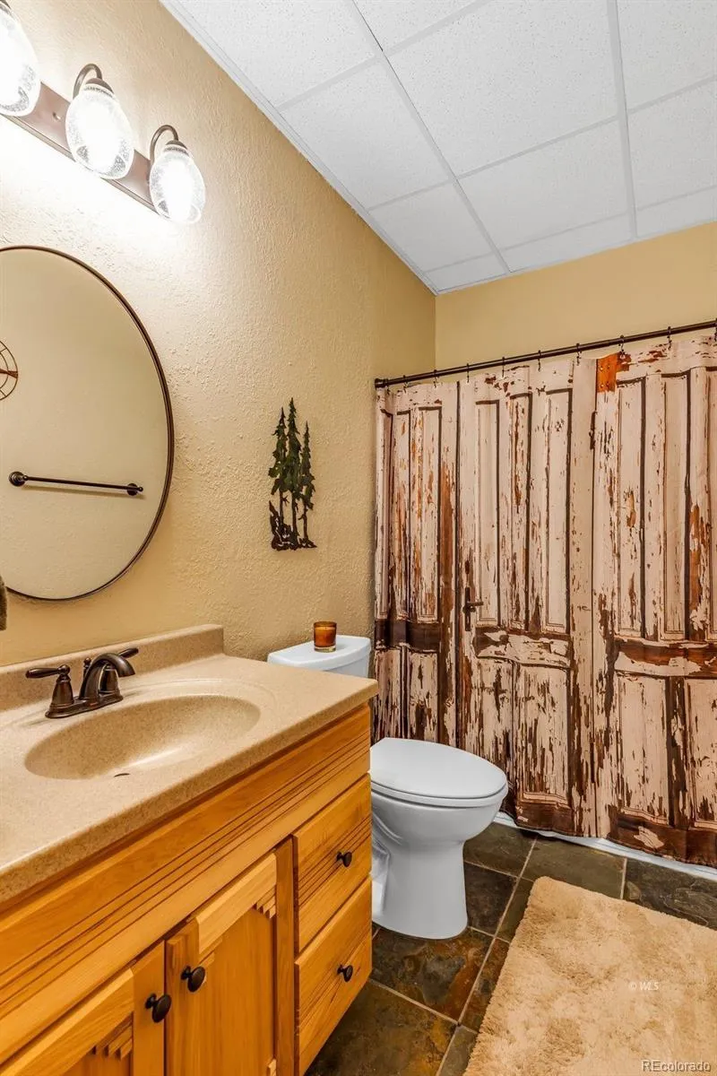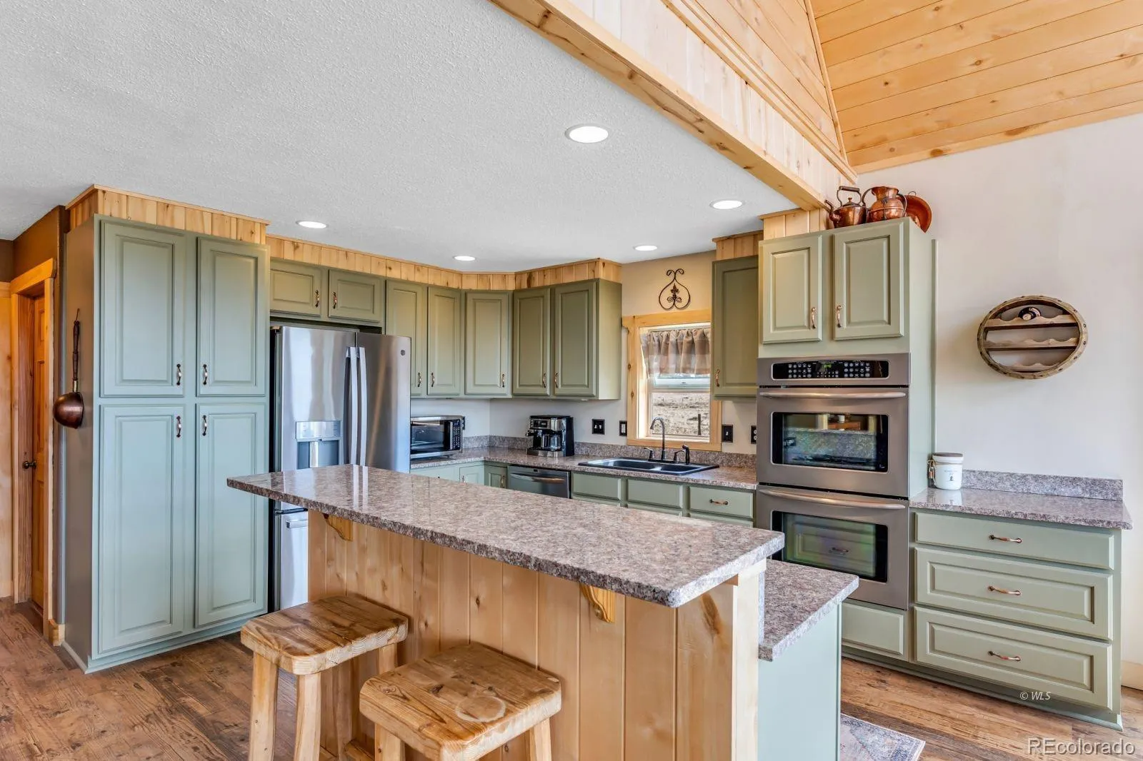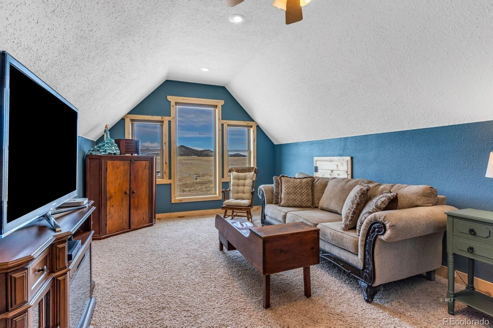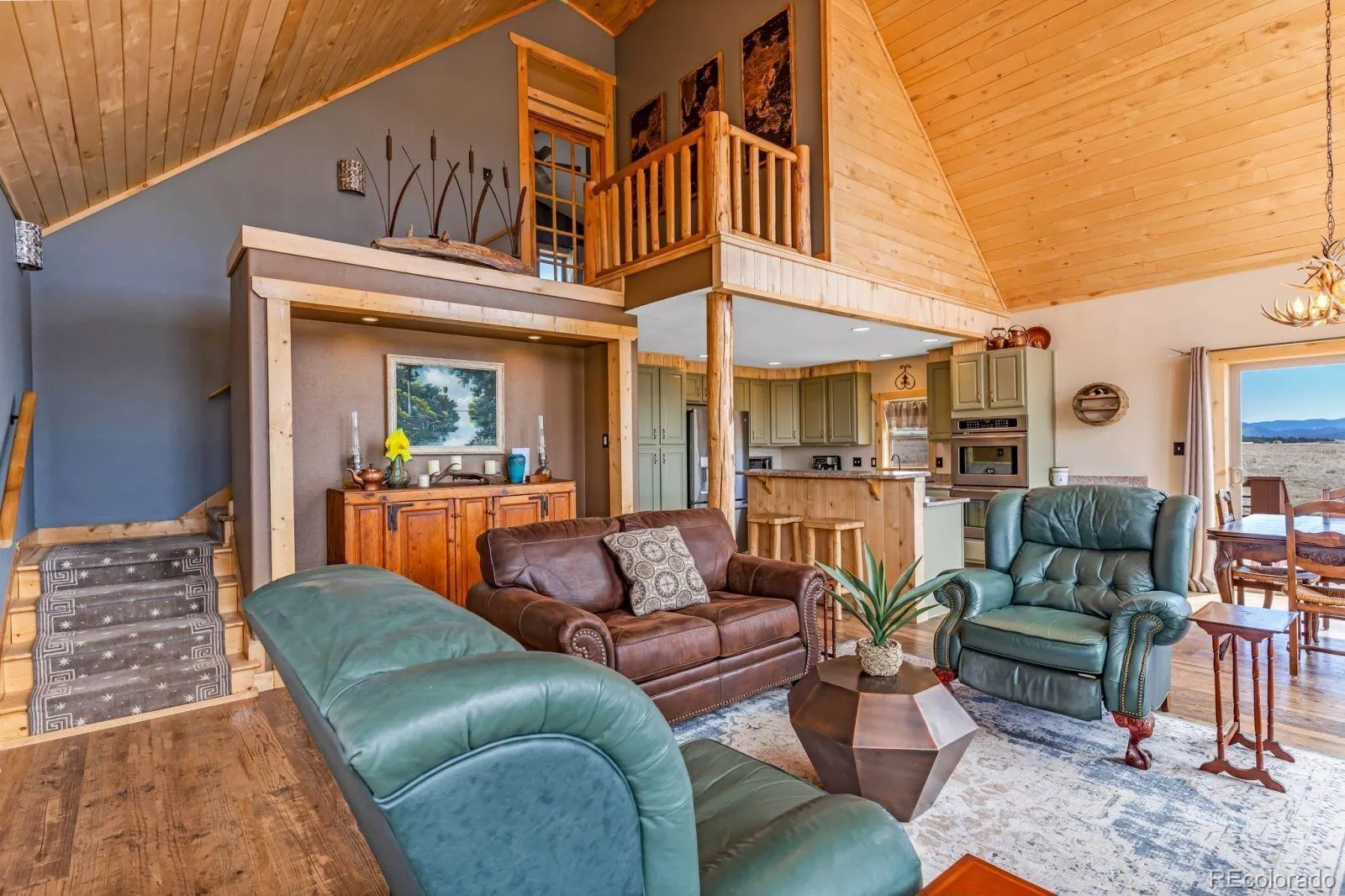 Panoramic views of the majestic Sangre De Cristos on 35 acres, this expansive log-sided home offers an unparalleled mountain retreat. 2 story windows make the home bright and the mountain views big! Offering 3 Bedrooms AND an office/4th bedroom, the open floor plan seamlessly integrates the kitchen, dining, and great room with cozy gas fireplace. The kitchen features granite countertops, stainless steel appliances including double ovens for those culinary masters or large gatherings. The entire upstairs is a comfortable master retreat with ensuite bathroom, AND adjoining bonus room. Entertainment abounds with a media room downstairs, complete with a pellet stove. Whole house radiant in-floor heat ensures cozy warmth throughout. For the hobbyist or outdoor enthusiast, an attached two-car garage AND separate 20×25 garage/shop with power, parking, storage, and RV hookups for adventurers seeking to explore the great outdoors. The subdivision has private access to BLM lands and nearby Lake DeWeese. Gated entrance provides security & privacy for peaceful living. With its breathtaking mountain vistas this property offers the quintessential mountain lifestyle.