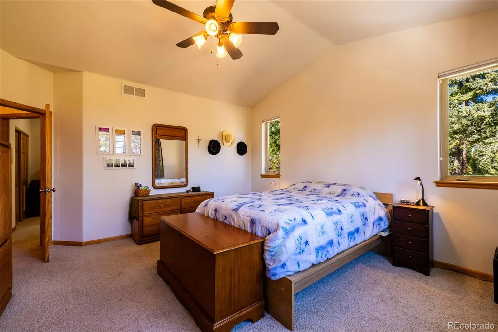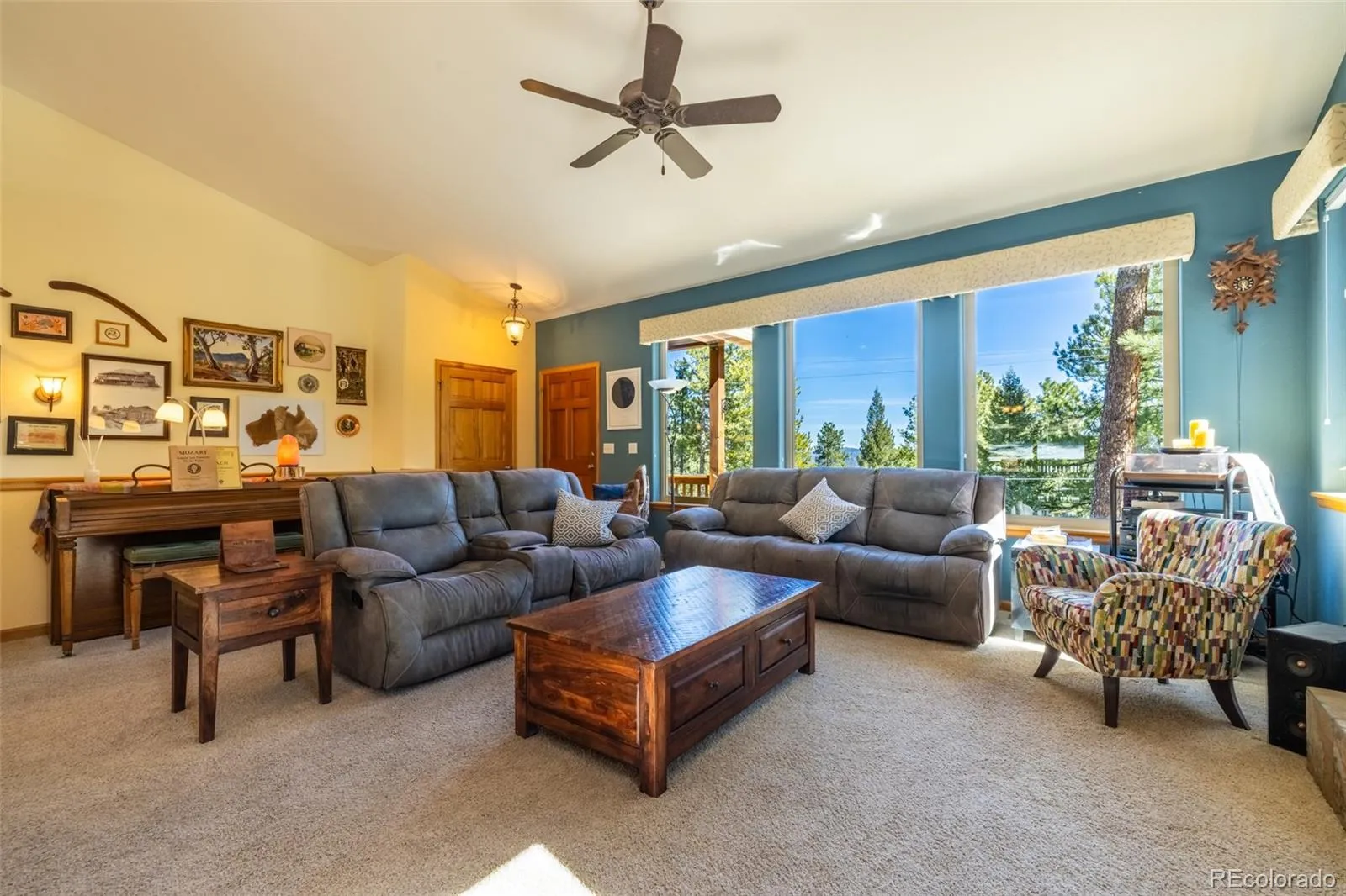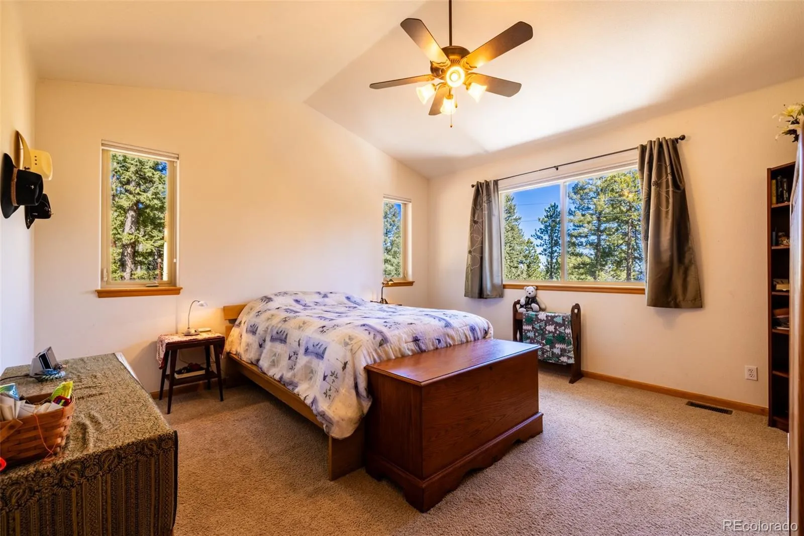 Mountain privacy, Denver convenience,Buy-down available, flat driveway, vaulted great room + daylight walk-out on 1.67 Ac. Sunlight pours through the vaulted great room of this Evergreen retreat, where massive windows frame wooded privacy and south-facing exposure keeps the home bright and warm all year long. A cozy gas fireplace anchors the space, creating the perfect spot to gather with friends and family. The open kitchen blends seamlessly with the living and dining areas, featuring alder cabinetry, refreshed counters, and stainless steel appliances, while direct access to the oversized deck and flagstone patio makes entertaining effortless. The main level is centered around a tranquil primary suite with vaulted ceilings and a spa-like five-piece bath, offering a true retreat at the end of the day. A second bedroom on this level provides the flexibility of a home office or guest space. Downstairs, the walk-out lower level expands your living options with a spacious family room warmed by a pellet stove, a guest bedroom, a full bath, laundry. With natural light and a private entrance, ideal for hosting visitors, working from home, or enjoying hobbies. Practical comforts are woven throughout this home, including an oversized 22’x29’ garage with 220V power for an EV, a brand-new Bryant furnace installed in 2024, a private well producing four gallons per minute, and a three-bedroom septic system. Fiber-ready high-speed internet supports work and play, while the flat, paved driveway ensures year-round ease of access. Light covenants, no HOA, and minimal private road fees make ownership simple and flexible. This cedar-sided raised ranch offers the perfect balance of privacy and convenience. Just minutes from Hwy 285, schools, shopping, and Evergreen’s endless trails, it delivers modern comfort with timeless Colorado charm. From morning coffee on the deck to evenings under starry skies, this home invites you to experience the best of mountain living every single day.