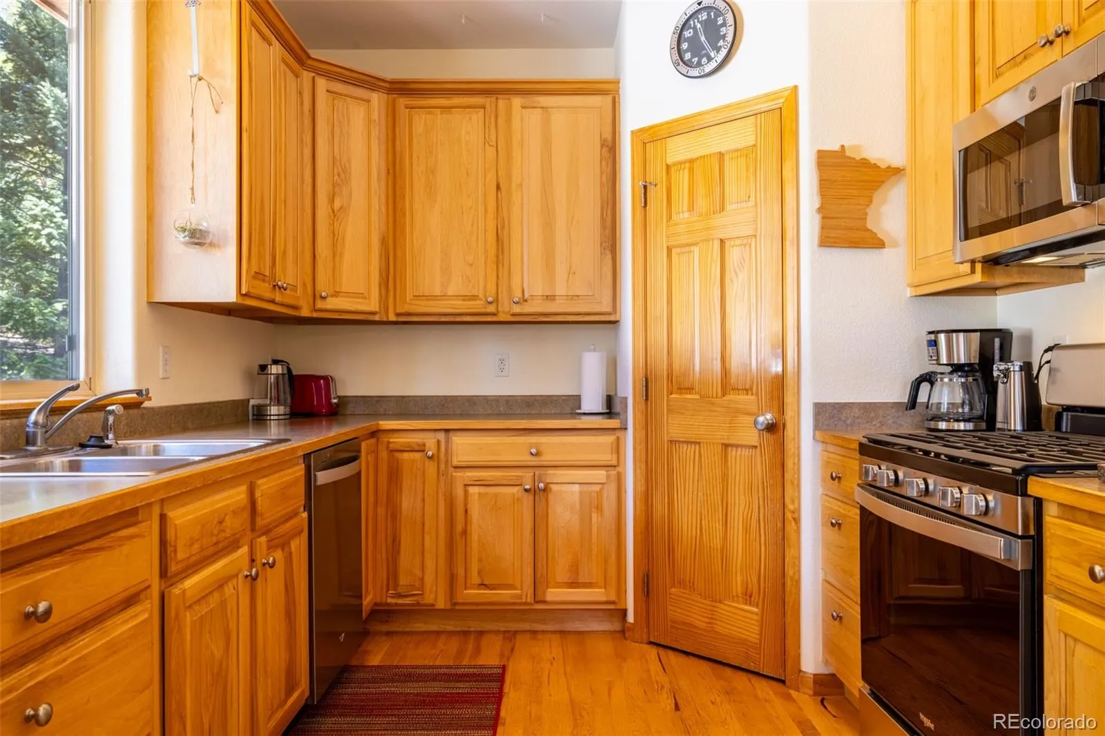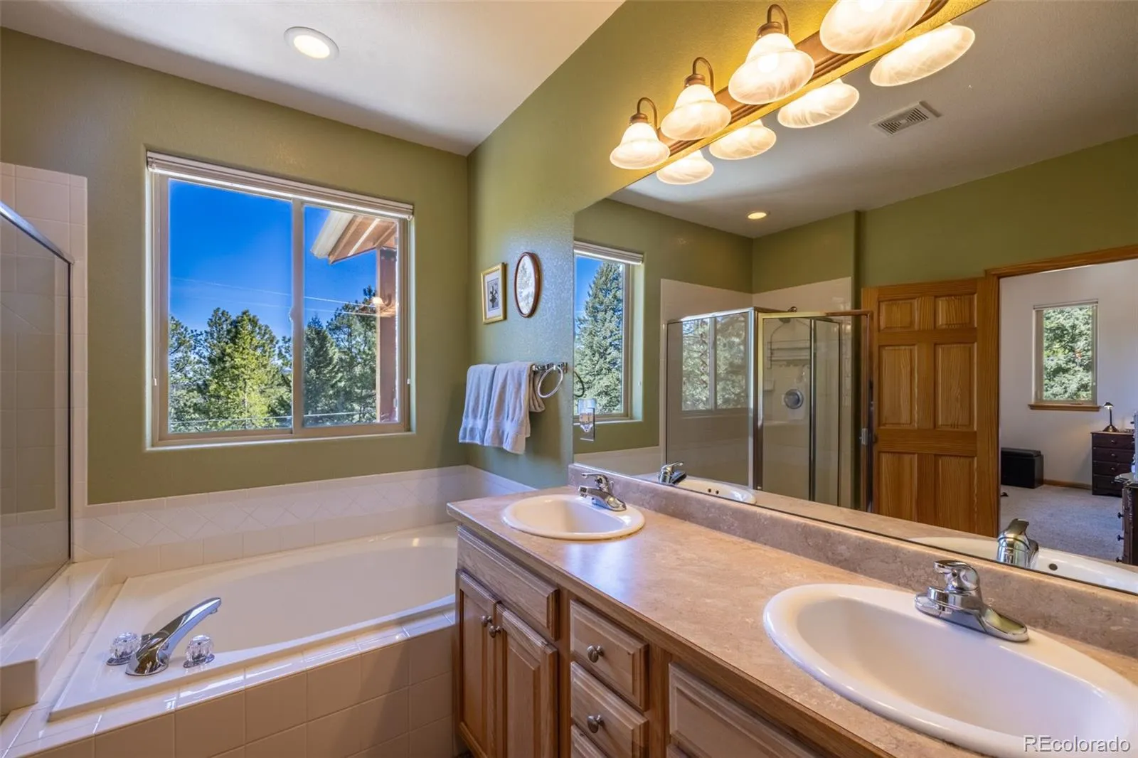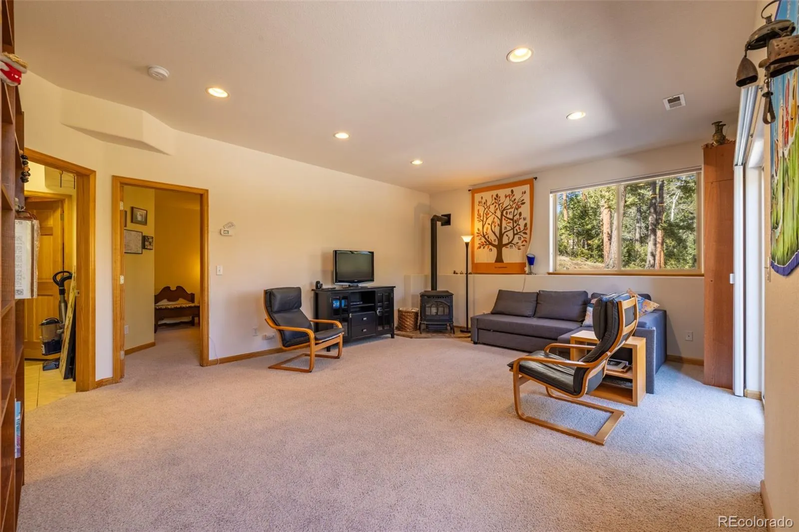 Mountain privacy, Denver convenience,Buy-down available, flat driveway, vaulted great room + daylight walk-out on 1.67 Ac. Sunlight pours through the vaulted great room of this Evergreen retreat, where massive windows frame wooded privacy and south-facing exposure keeps the home bright and warm all year long. A cozy gas fireplace anchors the space, creating the perfect spot to gather with friends and family. The open kitchen blends seamlessly with the living and dining areas, featuring alder cabinetry, refreshed counters, and stainless steel appliances, while direct access to the oversized deck and flagstone patio makes entertaining effortless. The main level is centered around a tranquil primary suite with vaulted ceilings and a spa-like five-piece bath, offering a true retreat at the end of the day. A second bedroom on this level provides the flexibility of a home office or guest space. Downstairs, the walk-out lower level expands your living options with a spacious family room warmed by a pellet stove, a guest bedroom, a full bath, laundry. With natural light and a private entrance, ideal for hosting visitors, working from home, or enjoying hobbies. Practical comforts are woven throughout this home, including an oversized 22’x29’ garage with 220V power for an EV, a brand-new Bryant furnace installed in 2024, a private well producing four gallons per minute, and a three-bedroom septic system. Fiber-ready high-speed internet supports work and play, while the flat, paved driveway ensures year-round ease of access. Light covenants, no HOA, and minimal private road fees make ownership simple and flexible. This cedar-sided raised ranch offers the perfect balance of privacy and convenience. Just minutes from Hwy 285, schools, shopping, and Evergreen’s endless trails, it delivers modern comfort with timeless Colorado charm. From morning coffee on the deck to evenings under starry skies, this home invites you to experience the best of mountain living every single day.