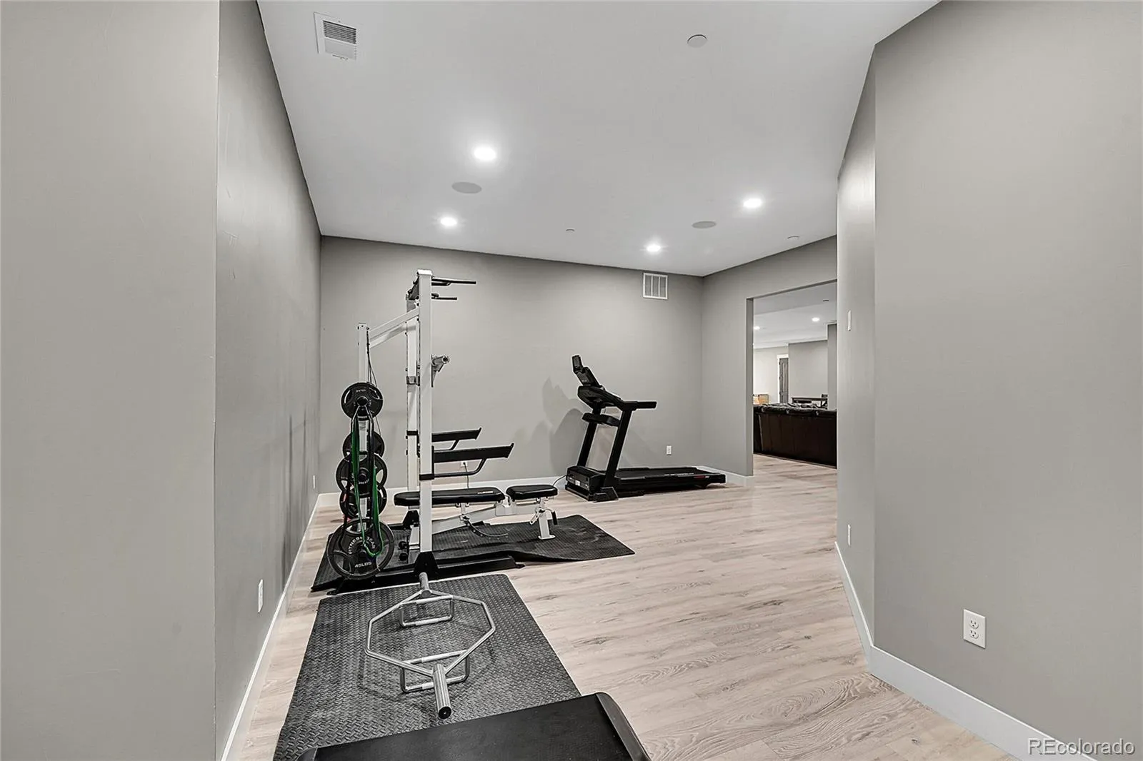 Downstairs, the expansive lower-level living room with wet bar is ideal for entertaining, and a dedicated home gym makes wellness effortless. Two laundry rooms—one on each level—add convenience, while dual heating and cooling systems ensure year-round comfort. The home is prewired for a full smart home system, including sound and security.
