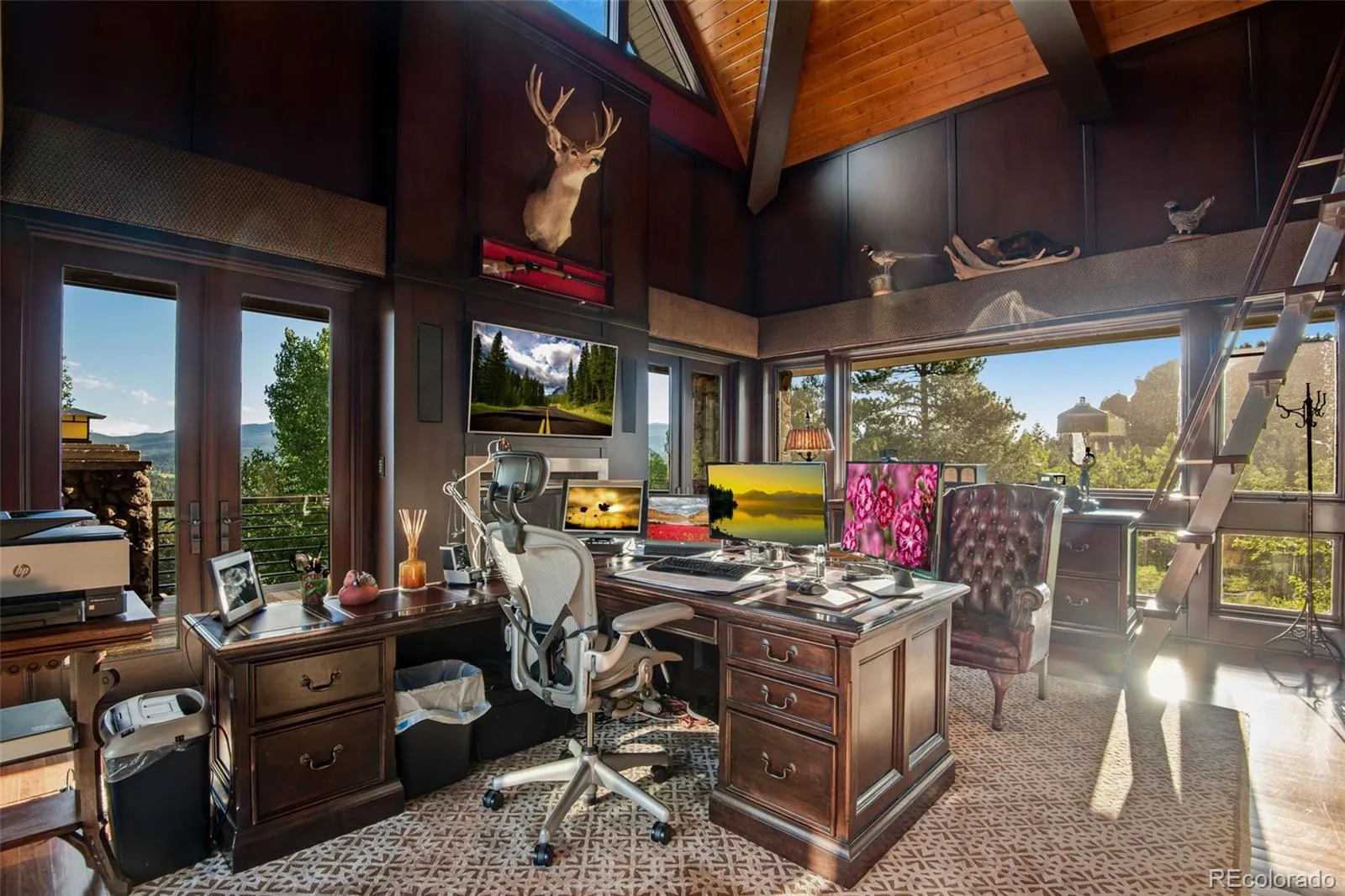Serenity Falls stands as the epitome of sophisticated mtn living, offering a serene sanctuary. This estate spans 30 pristine acres in the Rockies, accessed exclusively thru a private gate, ensuring privacy & security. The main residence is a masterpiece of craftsmanship & architectural design. Vaulted ceilings adorned w/wood beams soar above expansive living spaces w/panoramic picture windows that frame breathtaking mountain vistas. Tranquil water features & a 30′ waterfall contribute to the ambiance. Fall of 2024, 3 state-of-the-art AC chillers were installed, ensuring optimal comfort thru the year, even in the high-altitude climate of this majestic estate. The gourmet kitchen features custom Ipina cabinets, a Sub-Zero Pro package, dual Wolf ovens w/gas cook-tops, dual warming drawers & two Miele dishwashers. The primary suite is a private retreat, offering a spa-like bath, a substantial walk-in closet & wet bar, beverage station & laundry area. 3 additional beds w/en-suite 3/4 ba & walk-in closets, provide luxurious accommodation for family & guests. There are 2 executive offices w/amazing views & ample natural light. A theater rm w/spacious wet bar & temperature-controlled wine cellar is also perfect for hosting gatherings & enjoying leisurely evenings. This estate features a guest house overlooking an integrated equine center. The studio offers 2 beds, while the equestrian facilities include 6 stables (currently used for storage), a heated tack room & an outdoor horse corral (used for guest parking). Fitness enthusiasts will appreciate the comprehensive exercise facility, which includes a professional-sized half-basketball court (20 car auto garage), steam room-equipped bath & a convenient wet bar for post-workout relaxation. Serenity Falls is more than a residence; it’s a sanctuary of luxury & refinement, harmoniously blending natural beauty w/exceptional living spaces & amenities.