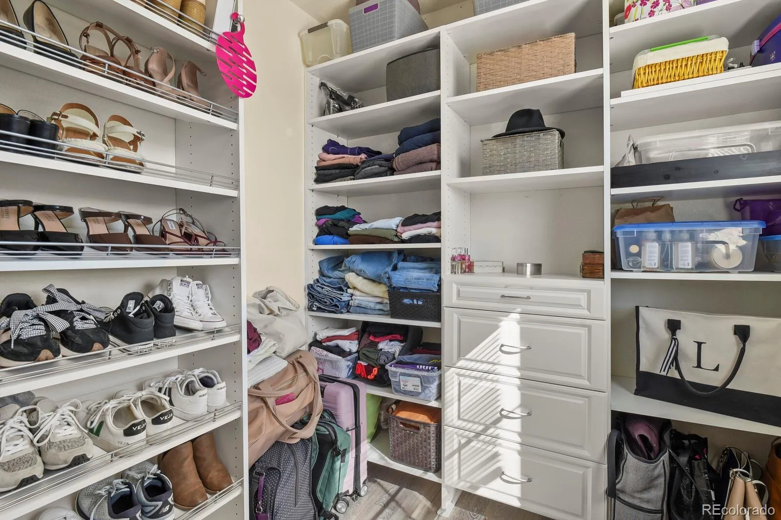 The upstairs primary suite features high vaulted ceilings, large windows, and an ensuite bathroom with slab granite countertops, two vanities, a deep soaking tub, separate shower, and a must-see remarkable walk-in closet with a custom-designed system and LVP flooring.