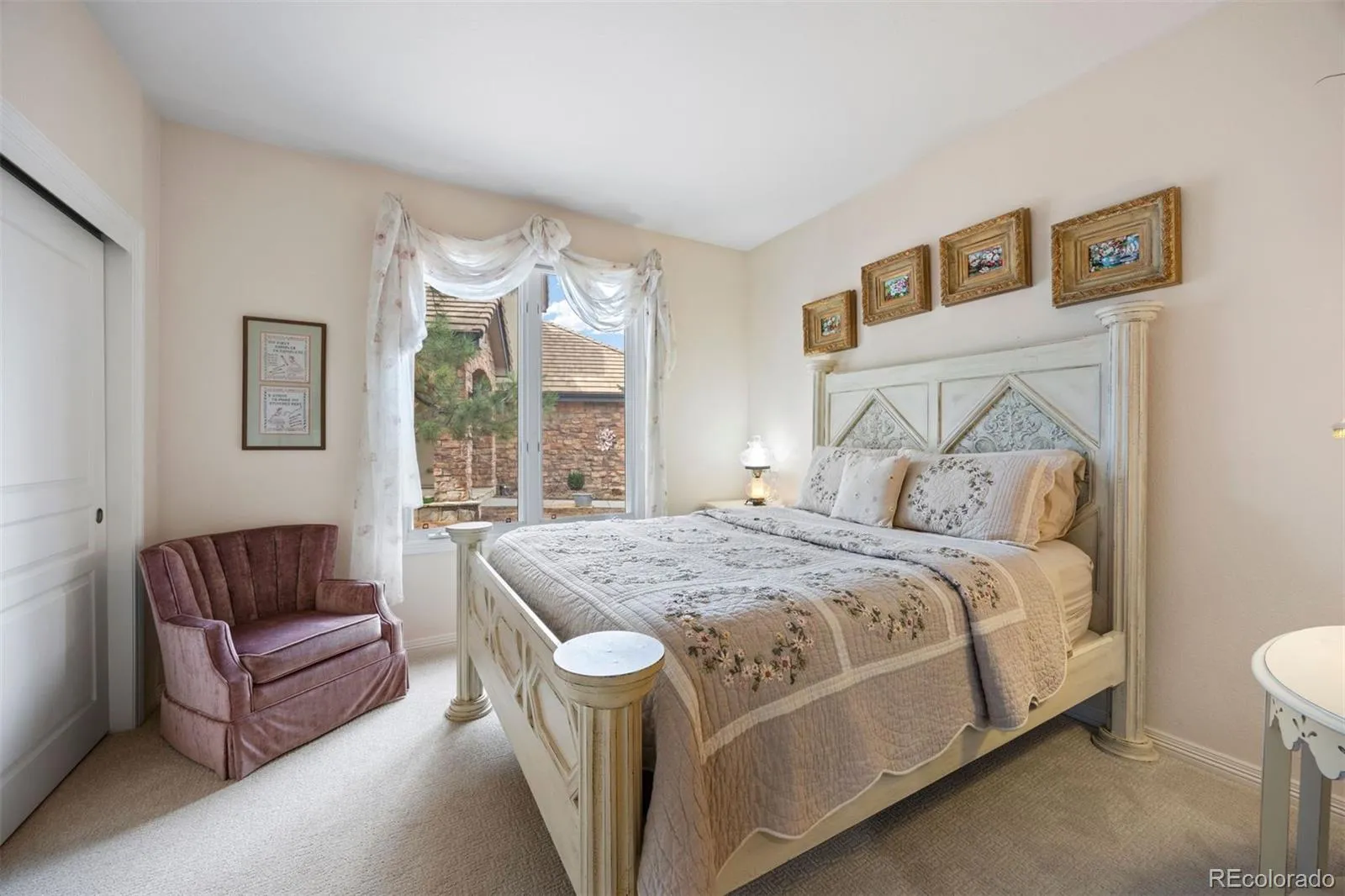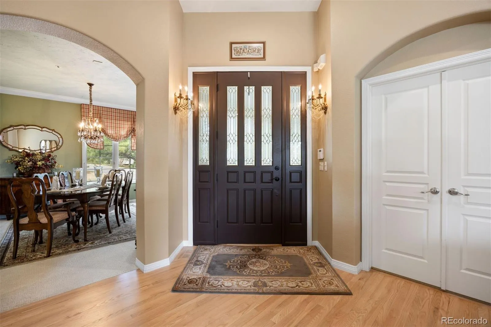 This beautifully updated, low maintenance, patio home in The Greens at The Village at Castle Pines offers privacy, stunning mountain views, and modern upgrades. The open-concept design showcases a three-sided gas fireplace, expansive windows that flood the space with natural light, and a seamless transition between the living, dining, and kitchen areas. The remodeled 2024 kitchen features custom cabinetry, granite countertops, and brand-new Bosch appliances, including an induction cooktop— thoughtfully designed for both style and functionality. Additionally, the kitchen is equipped with an RO water filtration system, ensuring pure, great-tasting water right at your fingertips. The main-floor primary suite is a tranquil retreat, with private access to the back deck and breathtaking views of Pikes Peak. Relax in front of the gas fireplace, or unwind in the remodeled en suite bath, complete with double vanities, a freestanding tub, a glass-enclosed shower, and a walk-in closet with custom built-ins. Additional updates include refinished hardwoods and new carpeting (2023). A secondary bedroom on the main level boasts large windows, high ceilings, and easy access to an updated full bath featuring a modern vessel sink. The main floor is completed by a private office, updated laundry room, and formal dining room. The walkout lower level offers two additional bedrooms, a full bath, and a spacious rec room with a dry bar and built-in shelves. A large utility room provides ample storage space. Outdoor living is a highlight, with a spacious deck featuring a built-in gas fire pit, Viking gas grill, and a hot tub. The HOA handles lawn care and snow removal for easy living.