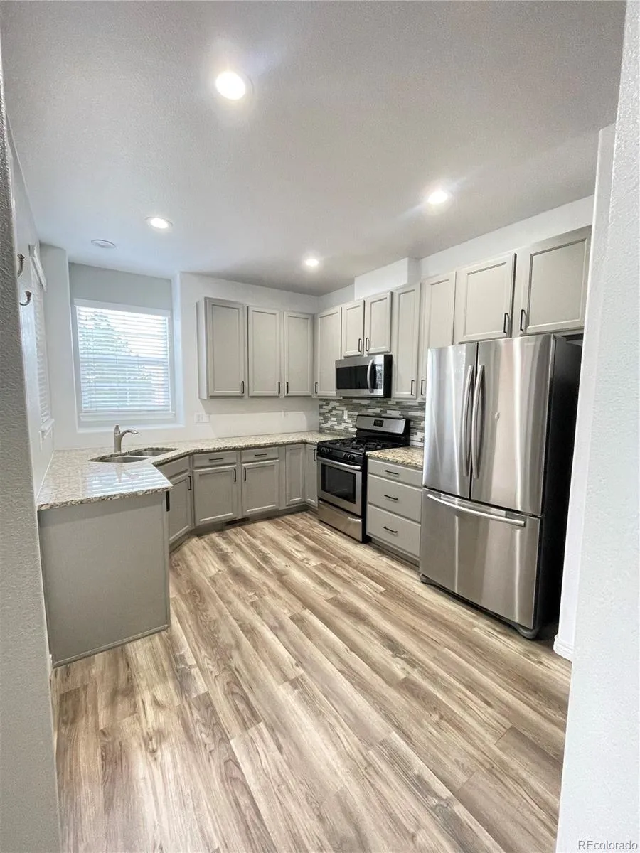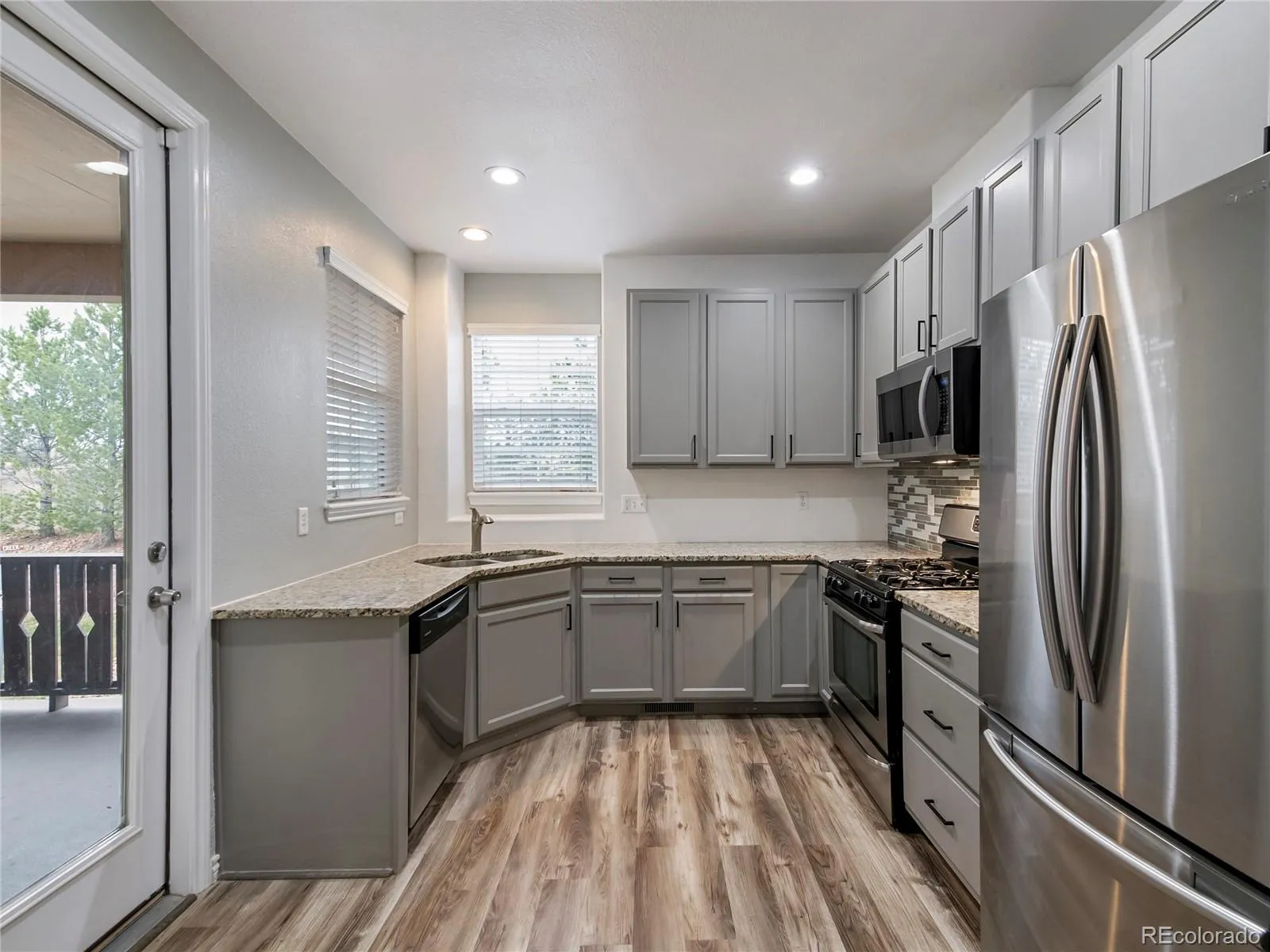 Step into comfort and style with this beautifully remodeled townhome, designed to accommodate modern living with thoughtful updates and an open, airy layout. The moment you arrive, you’re greeted by a welcoming stacked stone exterior that sets the tone for what’s inside. The entry opens to a bright and inviting living room, where new flooring and soaring ceilings allow natural light to flood the space, creating a warm and comfortable atmosphere. A large half bath on the main level offers convenience for you and your guests. The heart of the home is the updated kitchen, boasting 42″ cabinets, gorgeous granite countertops, and stainless steel appliances, including a gas range, French door refrigerator, microwave, and dishwasher. The butler’s pantry adds extra storage and makes a perfect spot for your morning coffee setup. The adjacent dining area flows seamlessly into the expansive family room, ideal for entertaining or enjoying quiet evenings by the fireplace. Step outside to your private patio and soak in peaceful Colorado evenings—perfect for grilling, relaxing, or simply enjoying the view. Upstairs, you’ll find a luxurious primary suite featuring a custom tray ceiling, large walk-in closet, and a fully renovated ensuite bathroom complete with beautifully tiled walk-in shower and sleek vessel sinks. Two additional generously-sized bedrooms and a full bath provide space for everyone. The upper-level laundry room complete with washer & dryer, adds convenience to your daily routine. Downstairs, you’ll find a functional entry-level area perfect for storing bikes, coats, and more. The easy-access crawl space offers even more storage, while the oversized garage keeps your vehicles protected from the elements. Enjoy added comfort year round with central air and built-in humidifier. Located within the highly-rated D20 school district, and offering quick access to Powers Blvd, I-25, the Air Force Academy, shopping, dining, and entertainment, this townhome truly has it all!