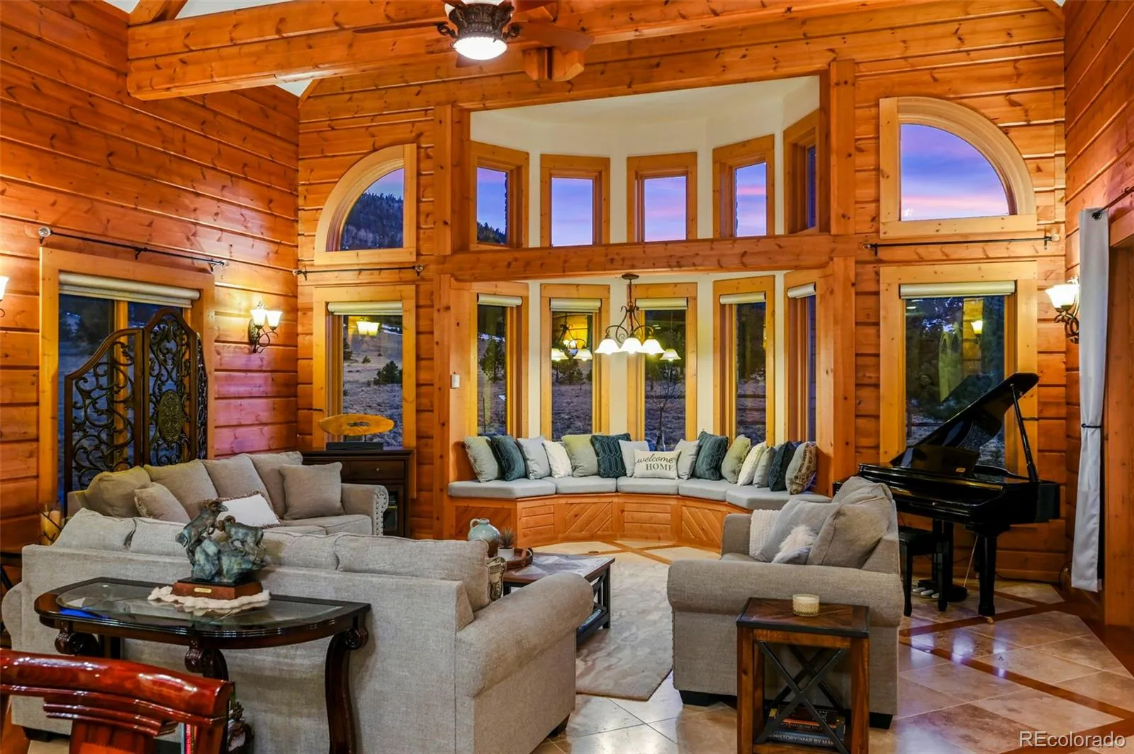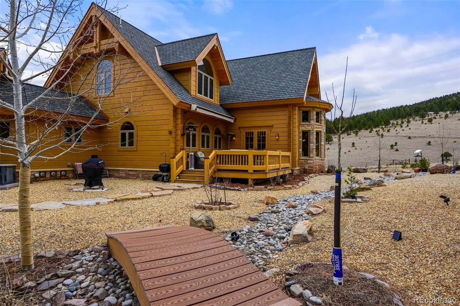 Immerse yourself in the beauty & tranquility of this extraordinary mountain home, tucked away in a gated community only 45 min outside Canon City. Blending sophistication & nature, this stunning sanctuary will leave you in awe! From the moment you enter, the soaring ceilings & striking accent beams create an atmosphere of rustic elegance. This masterpiece is constructed from premium custom-engineered Honka logs, blending timeless charm with modern functionality. In the heart of the home, the adjoined kitchen, dining & living areas are perfect for gathering. The exquisite travertine flooring, enhanced by rich cherry wood inlays enhances the warmth & refinement of the space, while expansive custom windows frame breathtaking panoramic views from every room & seamlessly blending the indoors with your surroundings. The main floor primary bedroom shares a double-sided fireplace with the formal dining & offers a beautifully appointed soaking tub in the connected bath. The refined wrought iron staircase showcases superior architecture and on the upper level you will find a dedicated library (or office) along with vaulted ceiling bedrooms & cozy window nooks. The amenities continue into the walk out basement where you will find endless space for entertaining/hobbies & guest privacy. The 3 car garage & additional parking is perfect for an RV or other storage. No detail has been overlooked extending to the exterior where endless charming landscaping awaits. For those craving adventure, this property grants direct access to pristine BLM land. Explore opportunities for adventure, hiking & the abundant wildlife from majestic elk & deer to other inhabitants right from your backyard! Designed for both year round comfort & self-sufficiency, this home comes equipped with a fully automatic generator, offering seamless convenience & security. With the perfect fusion of refined craftsmanship & back country, this exceptional estate is more than just a home – it’s a lifestyle.