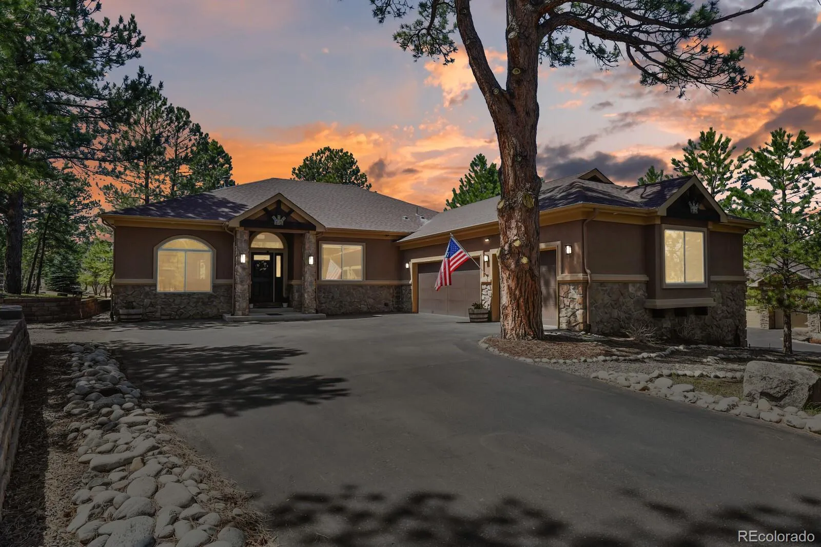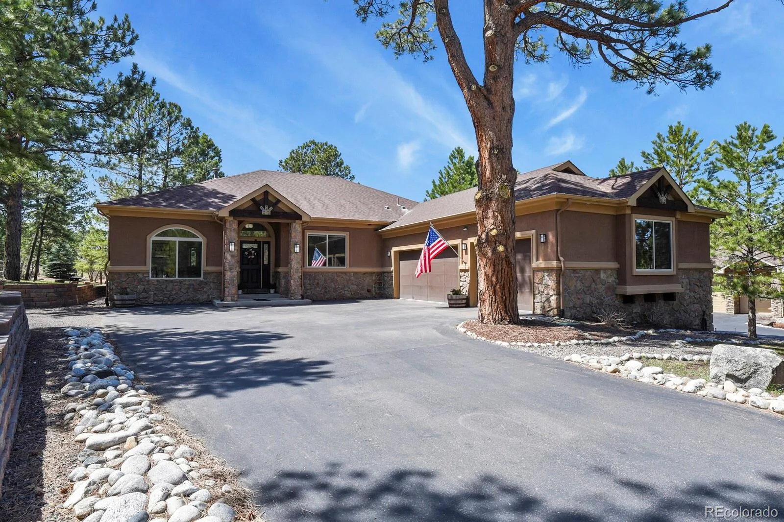 Discover unparalleled tranquility and sophisticated living in this stunning ranch home, gracefully nestled among over 60 mature pines on a .54-acre lot in Larkspur’s desirable Hidden Forest Community. This exceptional residence offers 4 bedrooms, 5 bathrooms, and a dedicated office, designed for both comfort and grand entertaining. The open-concept main level bathes in natural light, showcasing a gourmet kitchen with a 5-burner cooktop, double oven, stainless steel appliances, granite counters, and a spacious pantry, all overlooking the cozy family room with captivating views of the pine canopy. The dream primary suite is a private sanctuary, featuring an extended sitting area with backyard access, a cozy fireplace, and a luxurious en-suite bathroom. Two additional bedrooms, a laundry room, and two-and-a-half baths complete this level, with all closets boasting custom organizers for optimal storage. The elegant office provides a perfect workspace with built-in shelves, French doors, and a coffered ceiling. Step outside to your private oasis, featuring a large Trex deck with a gas hookup for your BBQ and a dedicated gas line to the included fire pit area—perfect for al fresco dining and evenings under the stars. The fully finished basement is an entertainer’s delight, offering a dedicated theatre space, a full bar with a dishwasher, sink, and beverage refrigerator, a full gym room, an additional bedroom, and a full and half bathroom. Modern conveniences abound with a new water heater and AC unit installed in 2024, a smart thermostat, and a smart WiFi irrigation system. The entire home is hardwired for internet. Enjoy the convenience of a 3-car garage with overhead storage and an added “CO turnaround” parking with a retaining wall. With a low HOA and a regularly plowed bus route, this home truly has it all and is ready for its new owners. ***BUYERS WHO QUALIFY AND FINANCE WITH OUR PREFERRED LENDER CAN EIVE A LENDER SPONSORED 1% – 1 YEAR RATE BUY-DOWN***