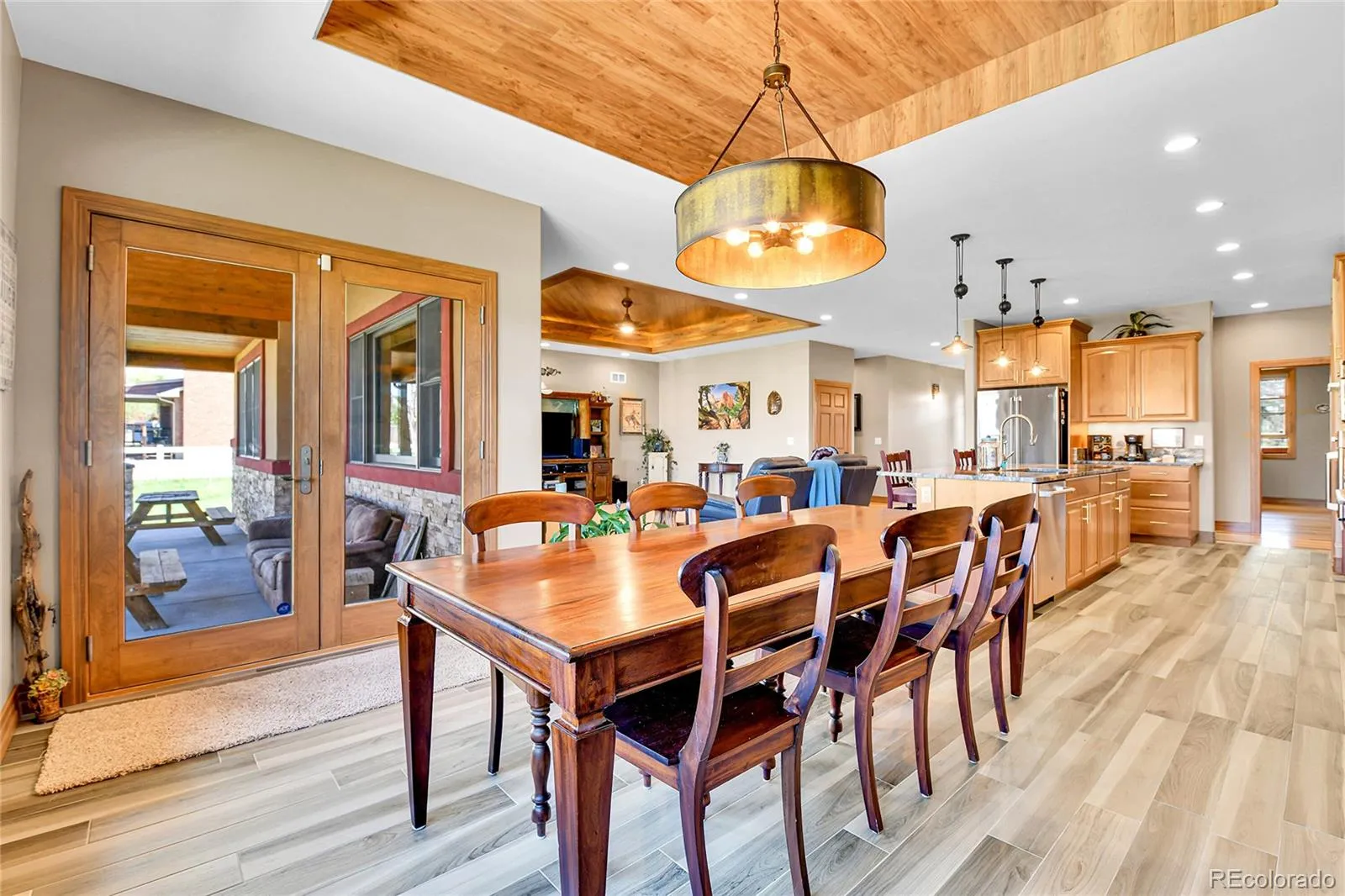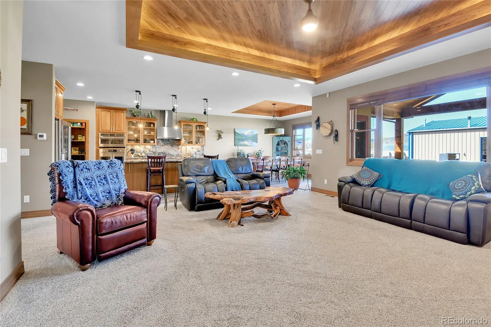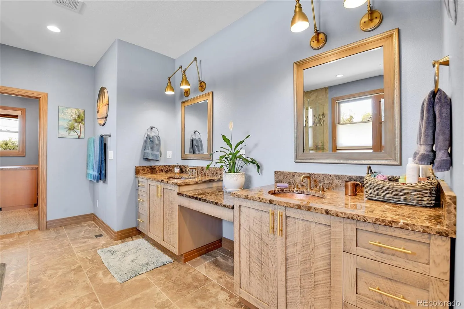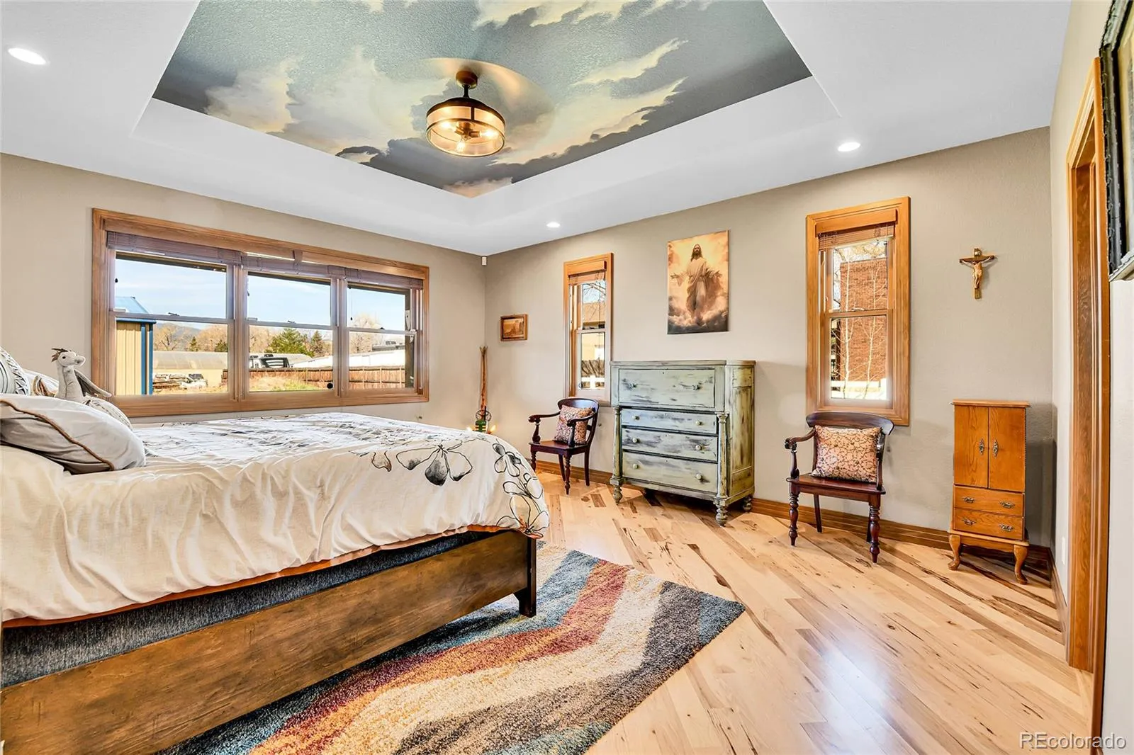Primary bedroom has a five-piece bathroom with one of the three coffered ceilings in the home.
