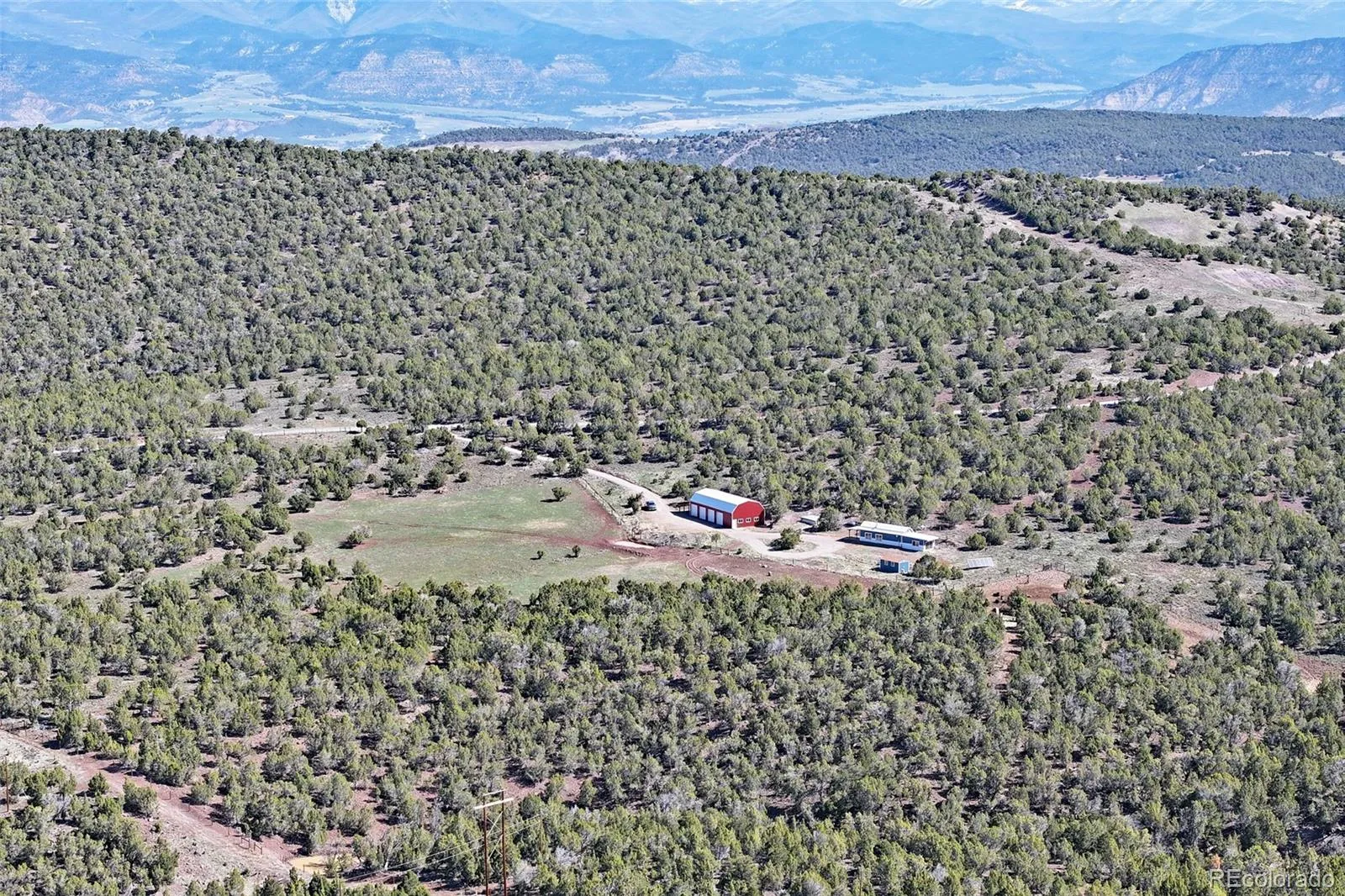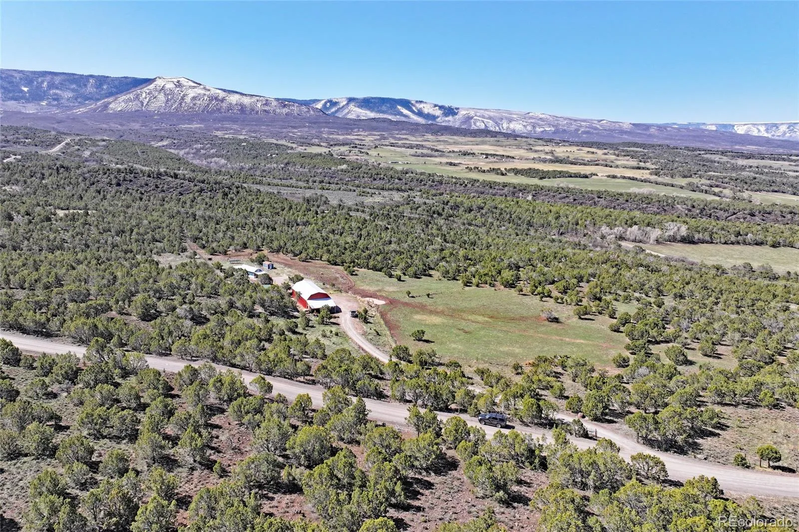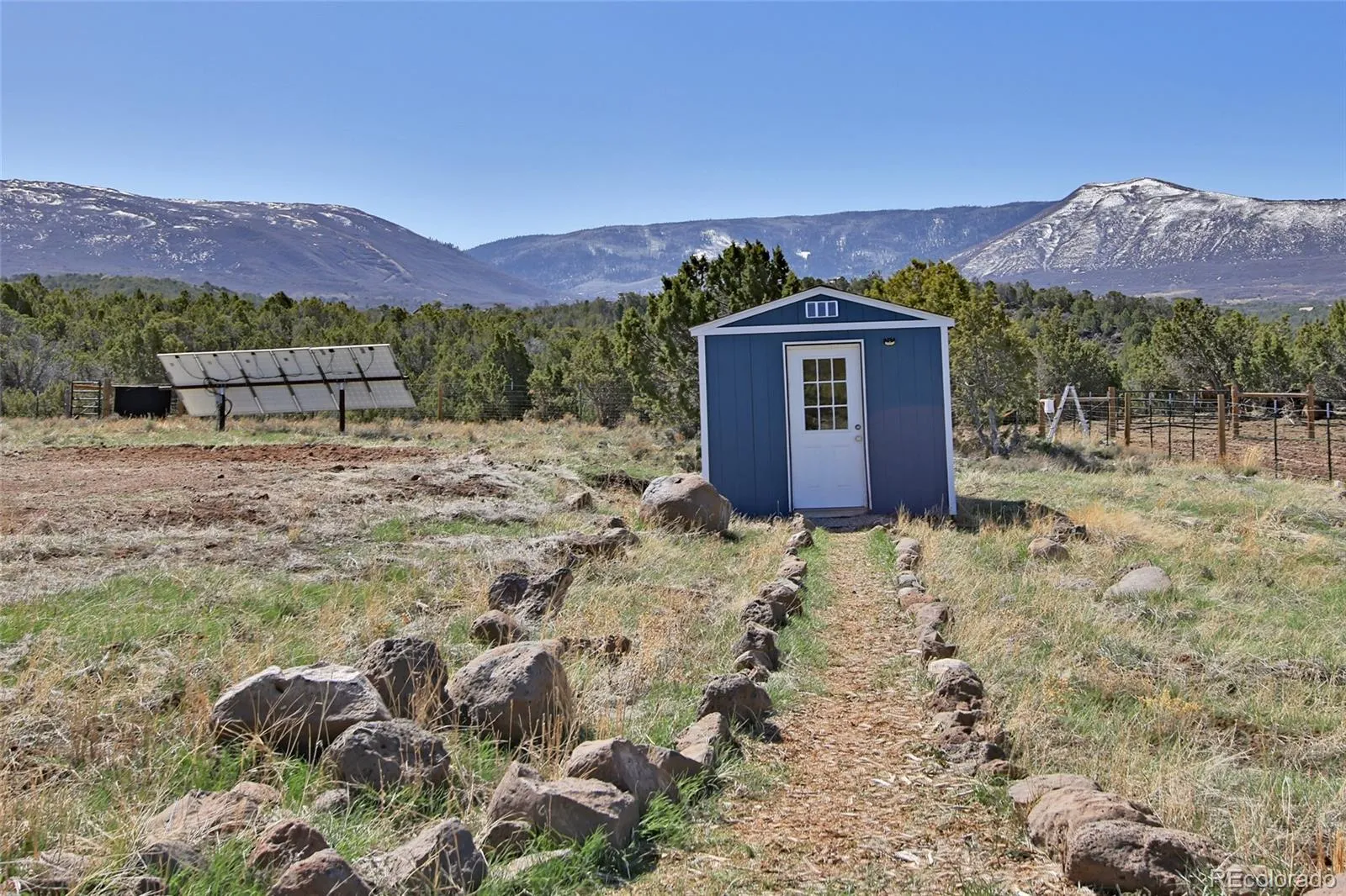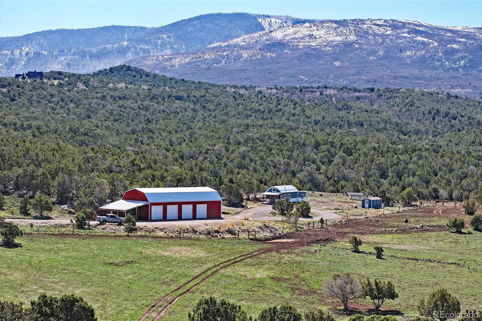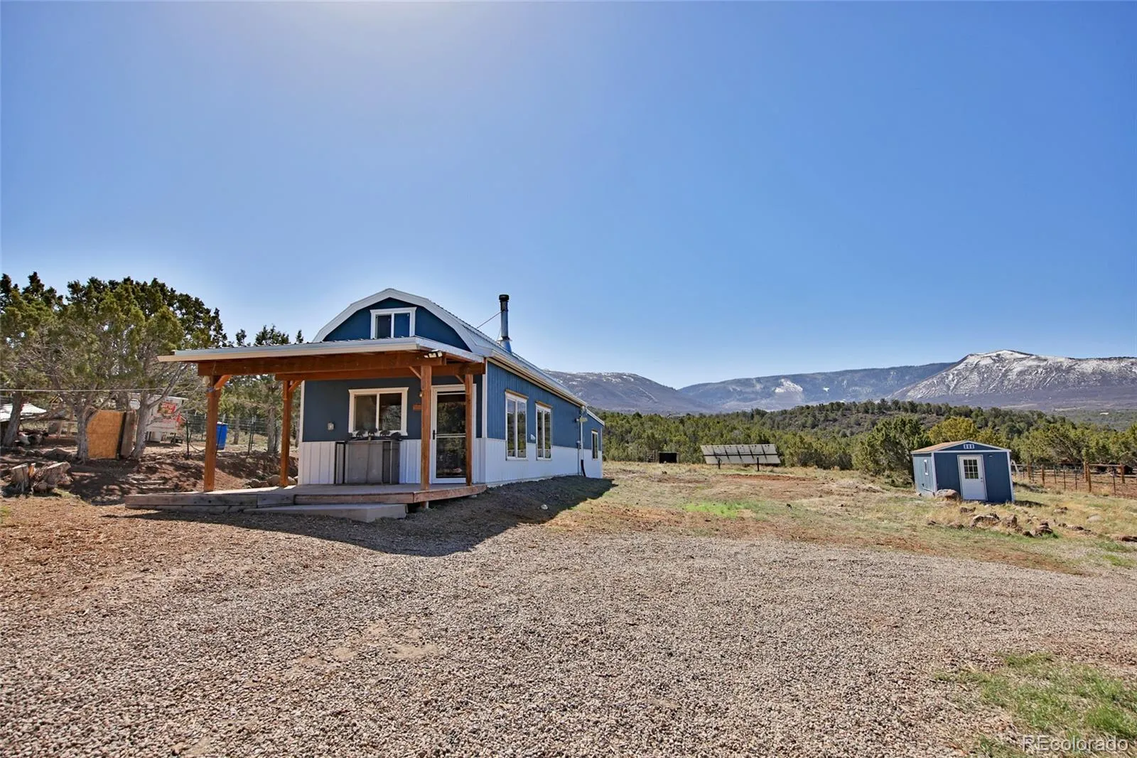 The large graveled drive leads down past the 2,100 sq ft shop to the cute and cozy 840 sq ft custom energy efficient home with one primary bedroom and one loft bedroom. The main living space features vaulted ceilings with custom pine tongue and groove walls and open concept living. Large double bay windows look out over the Grand Mesa giving this home views you’ll never tire of. An additional heated and powered guest cabin expands sleeping quarters. The kitchen has a butcher block countertop, new dishwasher, refrigerator, gas range and chest freezer. The full bath includes a deep soak claw tub with shower and vanity. Laundry room area includes a full-size stackable washer and dryer. Step down into a spacious master bedroom with dual walk-in closets. Enjoy the gorgeous views out of the bedroom with the 10 foot wide double sliding glass door providing access to the outside sitting area.
