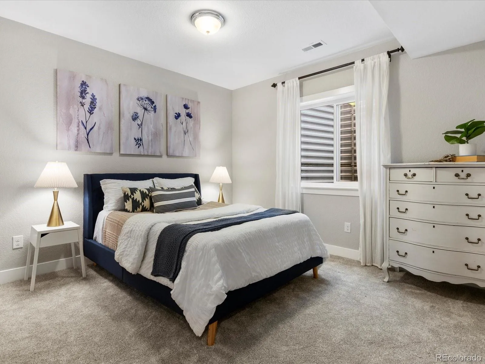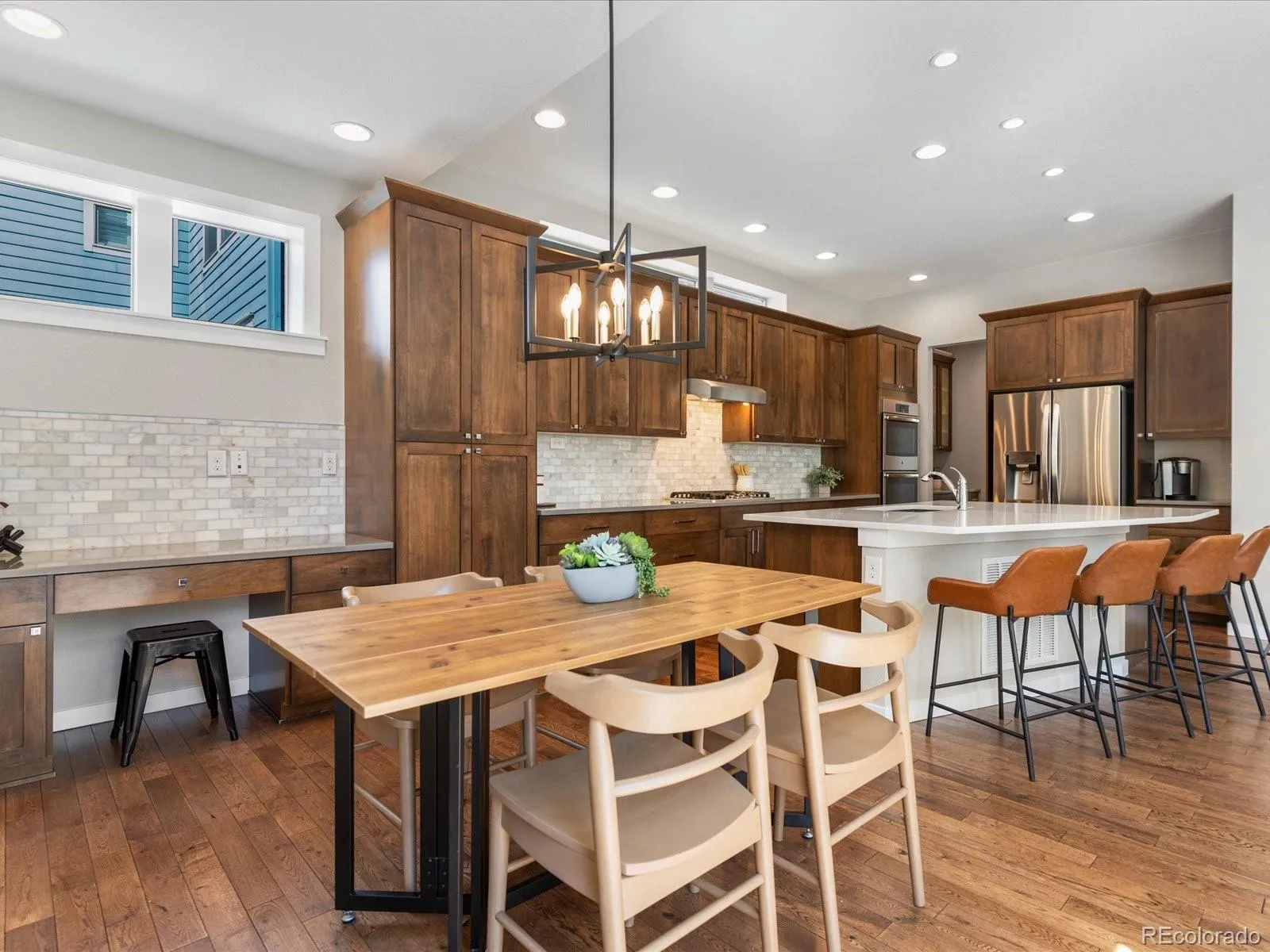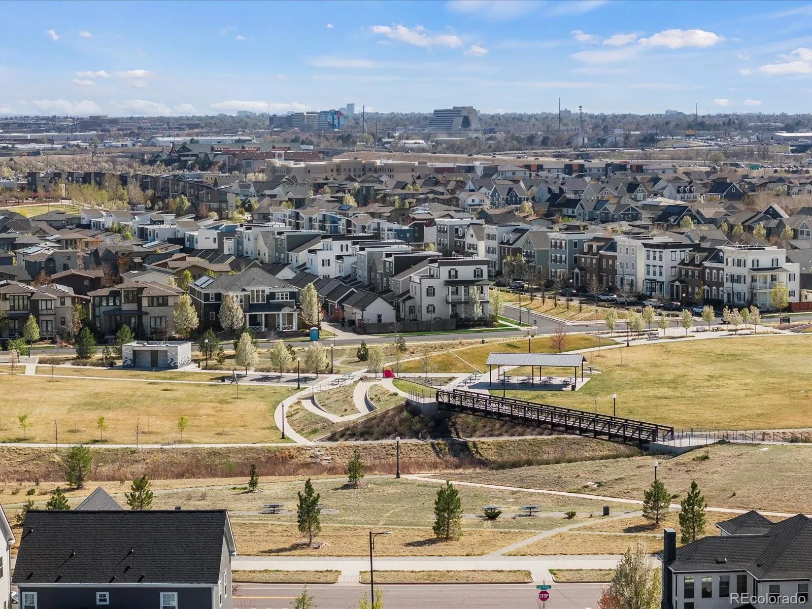 Discover refined living in this meticulously maintained 4 bedroom, 3.5 bath home, perfectly positioned just a couple blocks from the enchanting Quilted Garden Park in Central Park’s desirable Willow Park East neighborhood. Thoughtfully updated with fresh paint, plush new carpet, and chic lighting throughout, this lovely home blends style and comfort at every turn. Step inside to the spacious entry, host to a sun-drenched dedicated office and an elegant formal dining room. The butler’s pantry leads to a chef-inspired kitchen, showcasing a generous quartz-topped island, modern backsplash, gas cooktop with hood, abundant cabinetry, and a spacious pantry. A cozy breakfast nook, complete with built-in desk, is perfect for casual meals or morning coffee. Venture outside to the extended patio oasis, where a built-in fire pit invites you to bask in Colorado’s sunshine or enjoy magical evenings under the stars. The inviting living room exudes warmth, anchored by a beautiful fireplace with marble surround and floating mantle, and flows seamlessly into the open layout. A convenient mudroom off the oversized 2.5-car garage and a stylish powder room complete the main floor. Ascend upstairs to an expansive primary suite, featuring a luxurious en-suite bath with double quartz vanity, soaking tub, frameless glass shower, and a walk-in closet. Two additional bright bedrooms, a full bath, and a laundry room ensure space and convenience for all. The fully finished basement adds even more versatility, offering a spacious family/media room, a fourth bedroom, and a full bathroom, providing privacy for guests. With a brand-new roof installed in 2024, you’ll enjoy peace of mind for years to come. Plus, summer days await at the nearby Maverick Pool, and you’ll love the easy commute to Downtown, Anschutz, and DIA. This is the perfect opportunity to own an exceptional, move-in-ready home in Central Park!