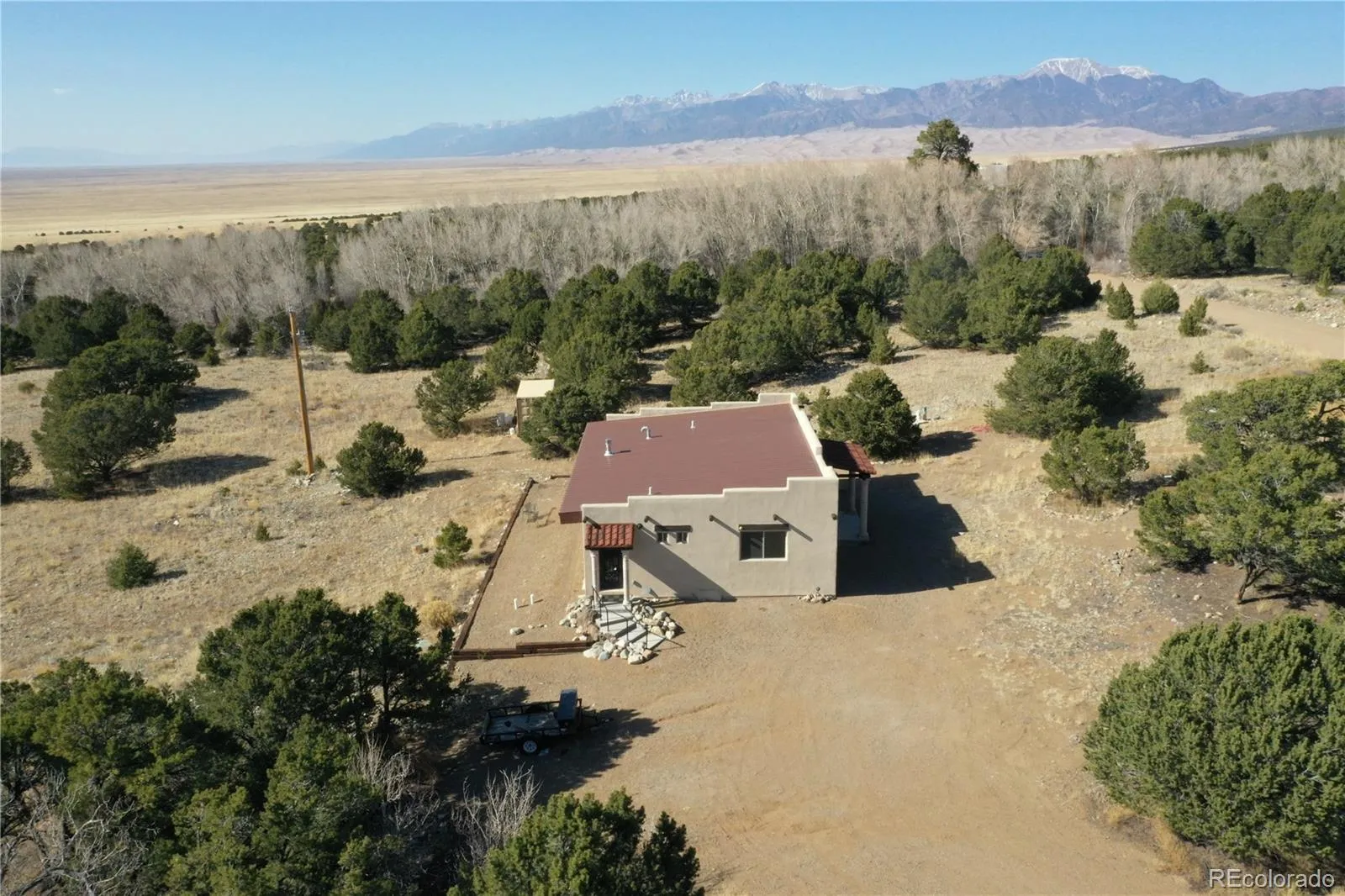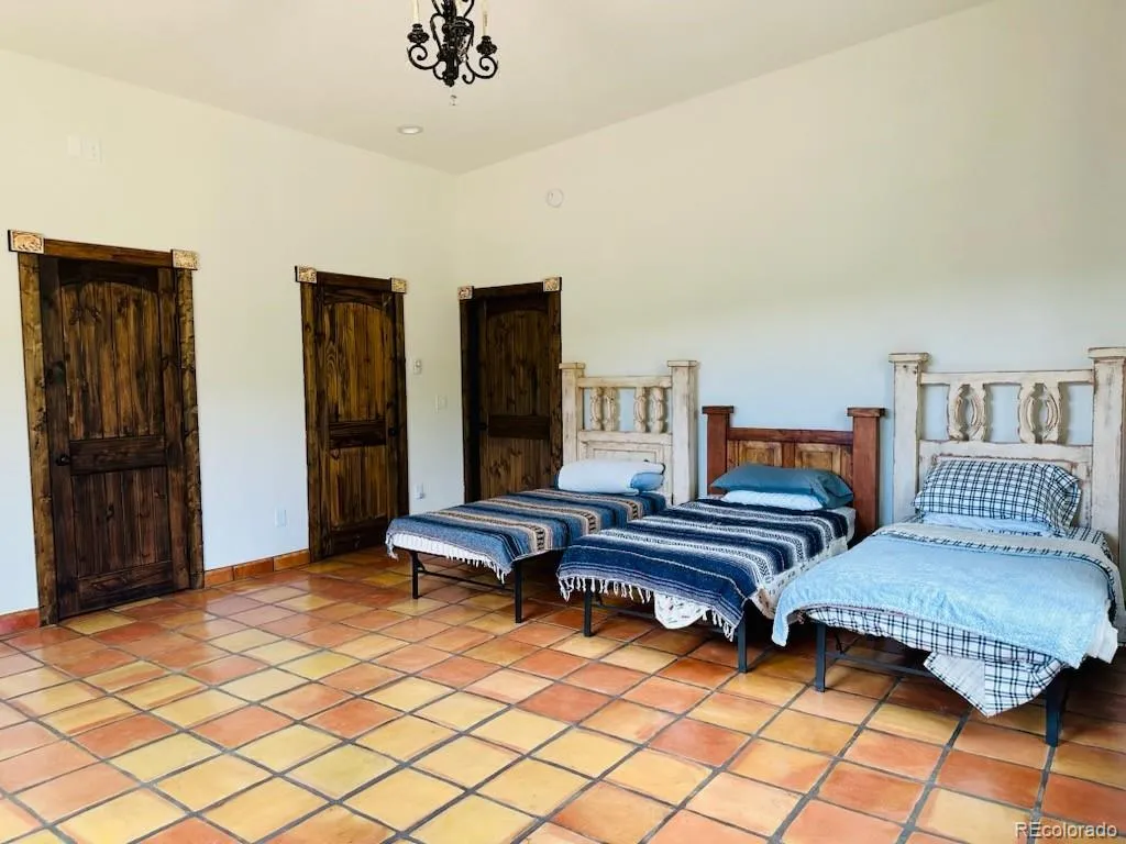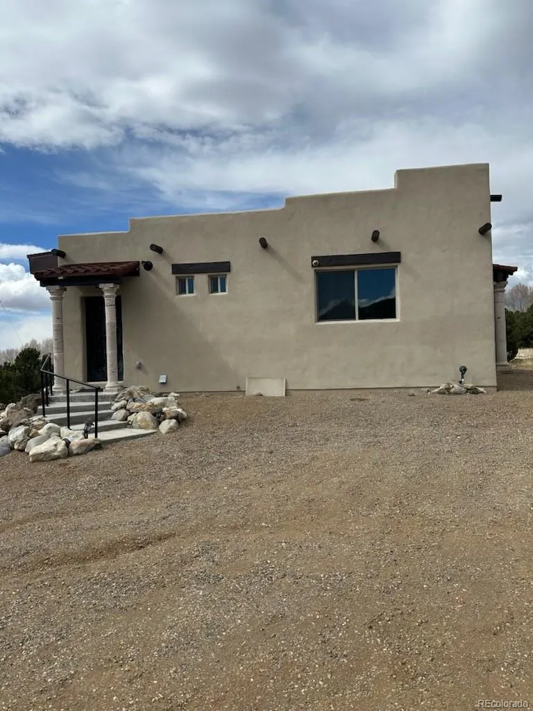 This Southwestern style custom home was built in 2024 situated alongside North Zapata Creek on 5.68 acres. Nestled in the picturesque landscapes of Zapata Subdivision, this unique and elegant home offers the perfect blend of comfort and adventure. With ample acreage, it’s not just a residence but a haven for horse lovers and outdoor enthusiasts alike. Imagine waking up to serene views, ready to embark on a day filled with hiking, fishing, and ATV trails, all just outside your door. After a fulfilling day, return to this tranquil retreat to unwind in peace. The landscape invites breathtaking sunsets and dark sky stargazing, and serene moments by the creek become your daily routine. Plus, with Alamosa only 30 minutes away, you have convenient access to shopping, dining, and entertainment options. Explore the wonders of the surrounding area, with breathtaking destinations just a short drive away. The expansive interior doors create an inviting entrance, framed by accent corner tiles that lend a distinctive character to the main living area. The kitchen center piece is a stainless-steel wolf range appliance with top-of-the-line vented hood system perfect for expressing the culinary chef in you! The remaining walls are blank canvases for creating your dream kitchen. The primary bedroom, bathed in southern sunlight, offers stunning views that invite warmth and tranquility. The second bedroom, though smaller, boasts large windows that frame picturesque scenes, enhancing its charm. Terracotta tile floors add a touch of rustic elegance, while heated towel racks in the bathroom blend comfort with luxury. A beautiful scone-style chandelier hangs gracefully, mirrored by matching sconces throughout the home, casting a soft glow in the evenings. Cozy up by the fireplace, equipped with remote control for effortless ambiance, and enjoy adjustable chandelier lighting that allows for the perfect setting. A dream home! A must-see for anyone seeking both relaxation and adventure!