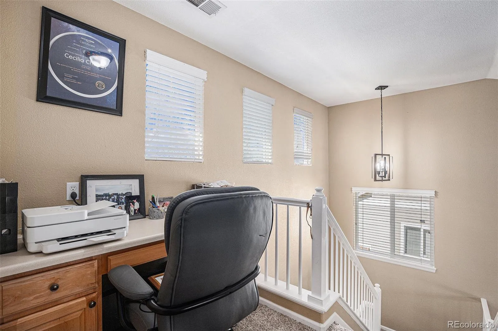 Upstairs, you’ll find a flexible loft space perfect for a home office or creative nook, along with three spacious bedrooms. The primary suite is a true retreat, complete with a sliding barn door entry, a walk-in closet, and a fully renovated en-suite bathroom that boasts dual vanities, a granite countertop, updated lighting, and a spa-style walk-in shower with river rock flooring and bench seating. Two additional bedrooms and an updated full bathroom complete the upper level, providing comfortable accommodations.