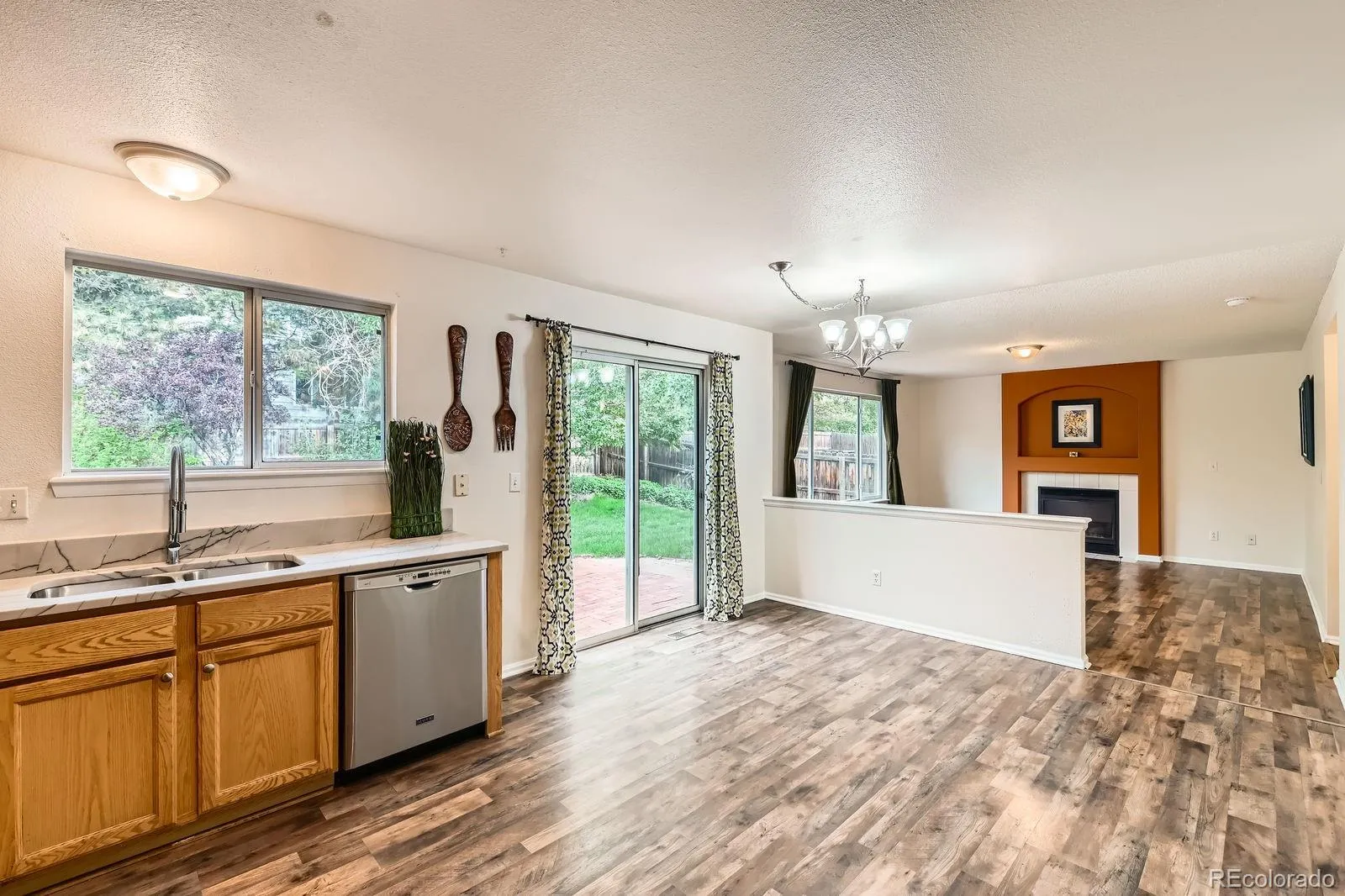 Step inside to find wood-look vinyl floors across the main level and an open-concept kitchen featuring granite countertops, stainless appliances, and a spacious pantry—perfect for everyday cooking and entertaining alike. The kitchen flows seamlessly to the dining area, family room with fireplace, and an inviting outdoor patio. A formal living room, powder bath with a custom stone sink, and convenient laundry complete the main floor.
