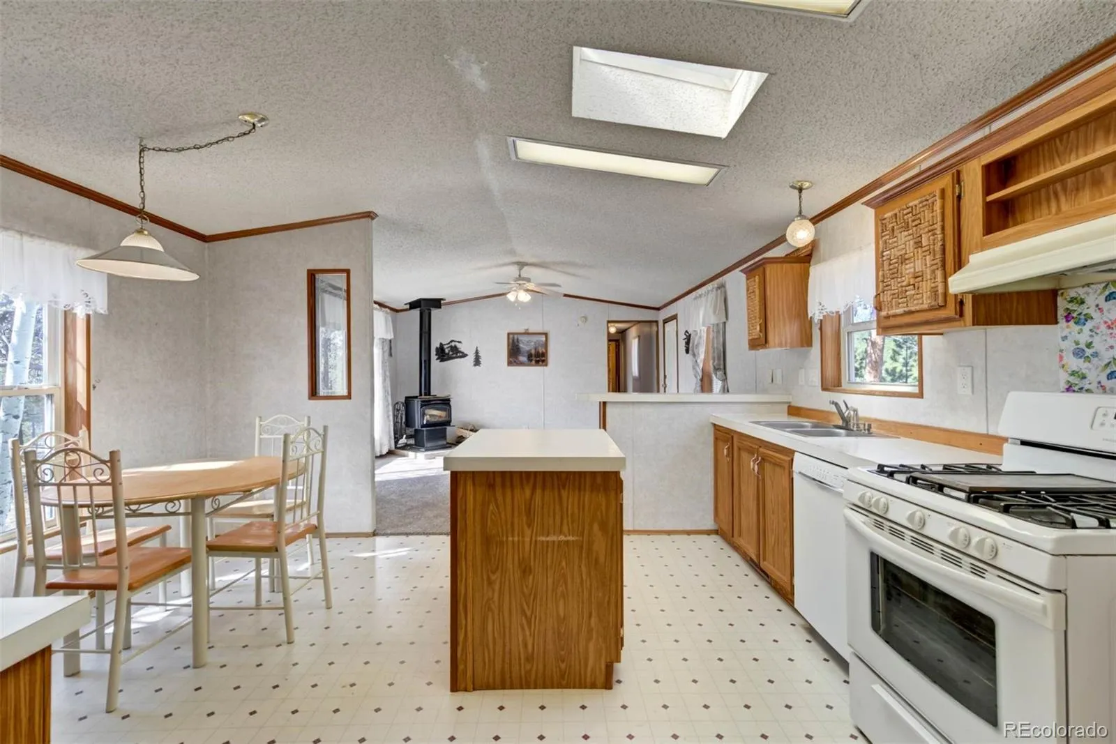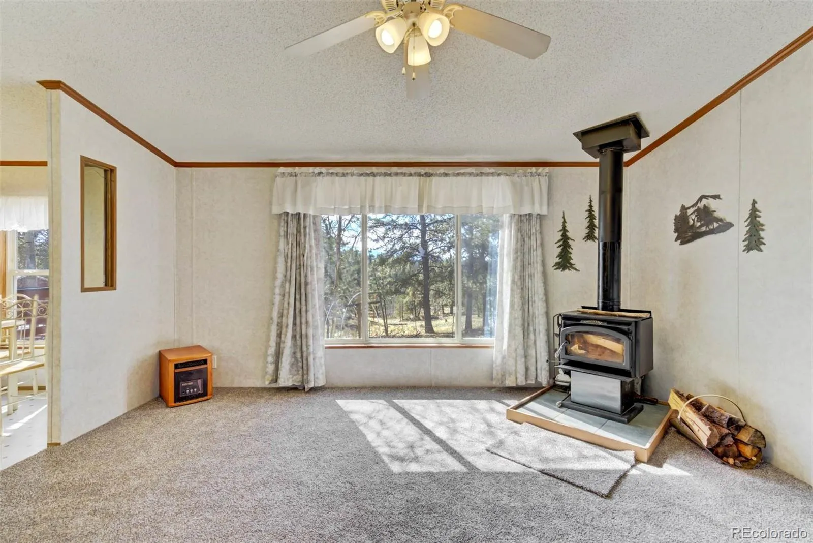 Inside, the home features three bedrooms and two bathrooms, with a practical layout and plenty of natural light. Double-pane windows help maintain energy efficiency while framing the stunning natural views. The kitchen includes a spacious island and opens to a living area warmed by a wood-burning stove. All bedrooms offer walk-in closets, brand-new carpet, and views of the surrounding landscape. The primary suite includes a skylight, soaking tub, separate shower, and an oversized vanity.