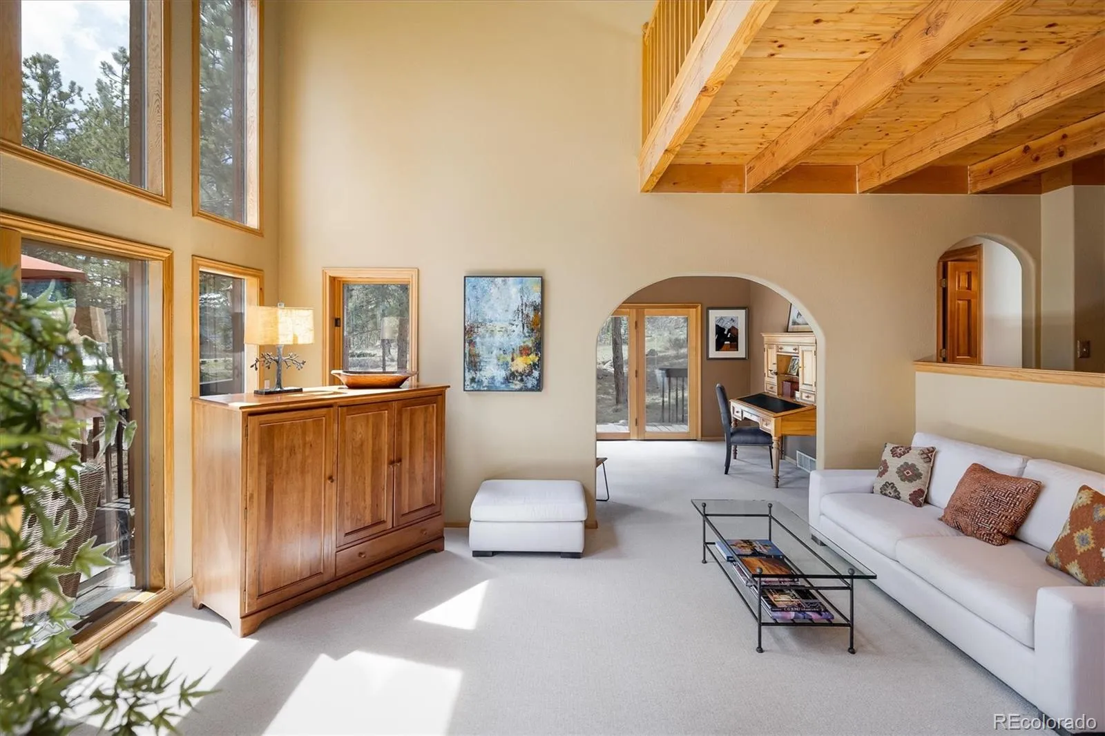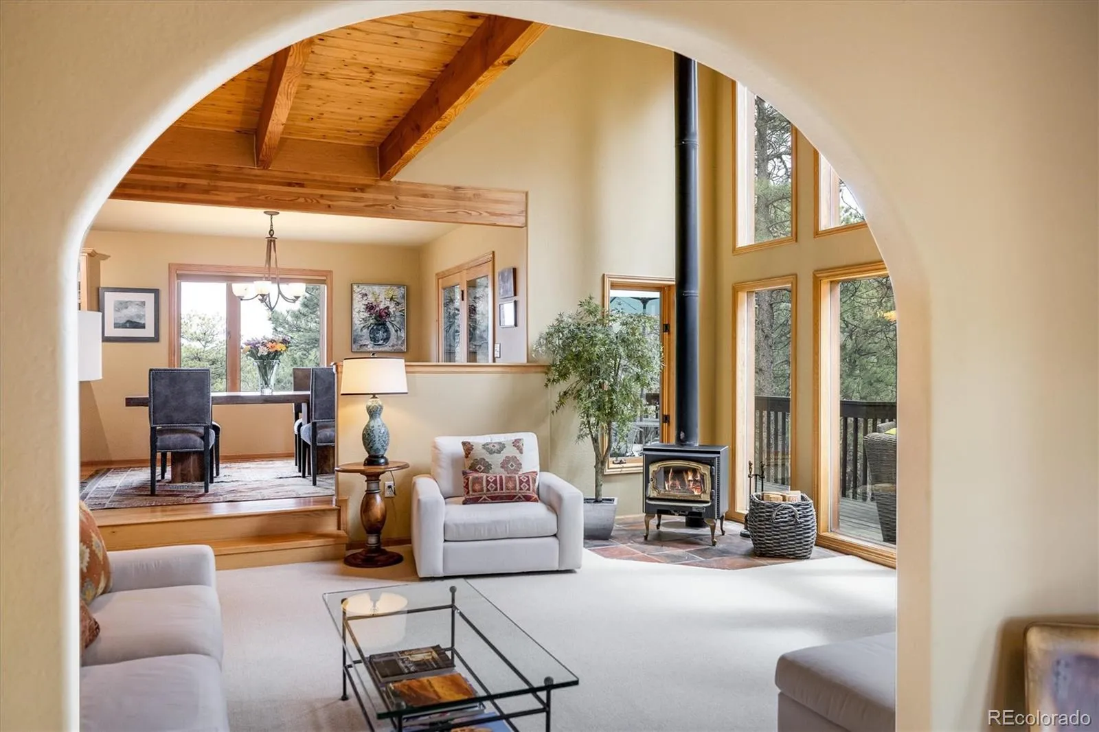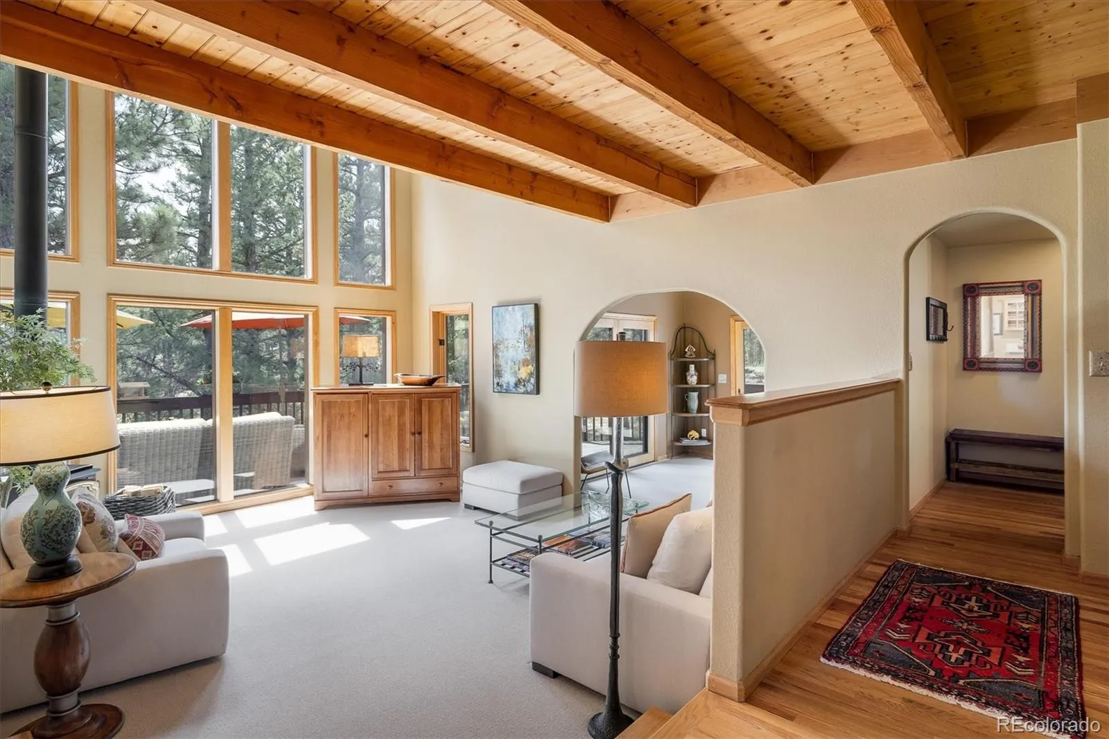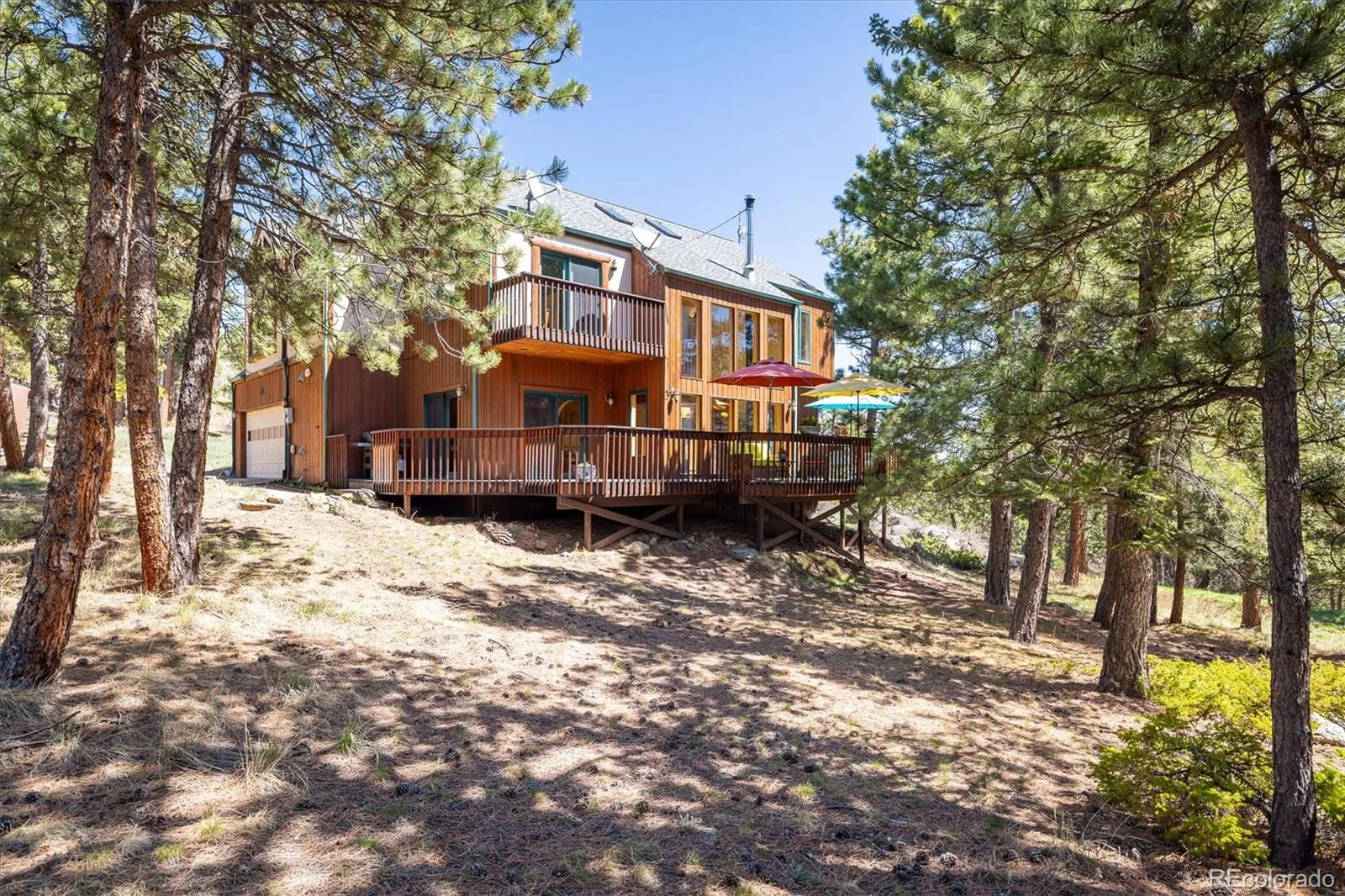 Nestled into the Boulder foothills in desirable St. Anton Highlands, this stunning home offers an extraordinary blend of mountain elegance and modern comfort. Thoughtfully designed to embrace its breathtaking surroundings, the open-concept living space is framed by floor-to-ceiling glass, flooding the living, dining, and kitchen areas with radiant natural light. A wide, graceful archway leads from the living room into a serene study, where French doors open to a sun-drenched deck and a charming flower garden framed by natural rock outcroppings. Here, the line between indoors and outdoors disappears, creating the perfect setting for both quiet reflection and lively entertaining. Step onto the expansive deck, an inviting retreat where you and your guests can bask in the sunshine, breathe in the fresh scent of pine, and admire views of distant mountain peaks framed by towering trees. Daily sightings of elk, deer, and even the occasional moose add to the magic of life in this beautiful setting. Upstairs, a loft leads to the spacious primary suite-a peaceful haven featuring vaulted ceilings, a relaxing spa-like bath, and generous living spaces. The second floor also includes a private office with its own balcony, two additional bedrooms, and another full bathroom. Lovingly maintained by the original owners, this home is a true sanctuary. Enjoy nearby skiing at Eldora and outdoor adventures like hiking, mountain biking, and snowshoeing at Hesse, Brainard Lake, and Caribou Ranch-all with close access to both Boulder and Nederland. Mountain living at its finest awaits you. Furnishings negotiable.