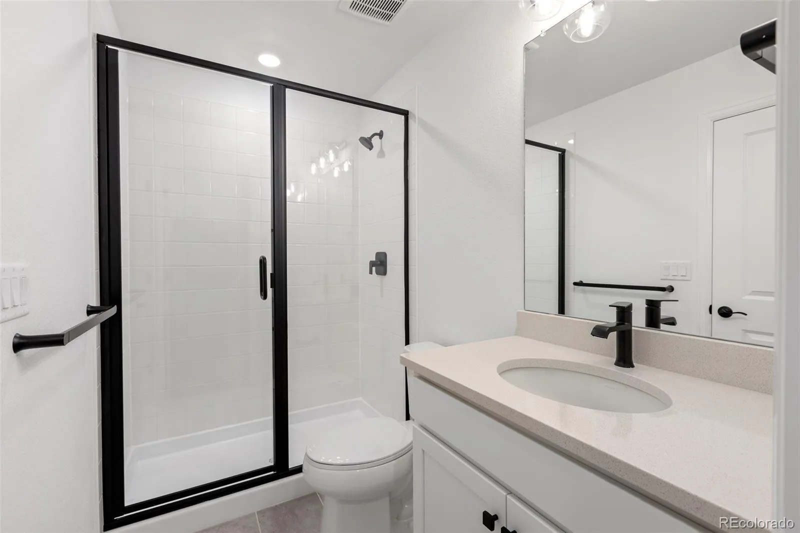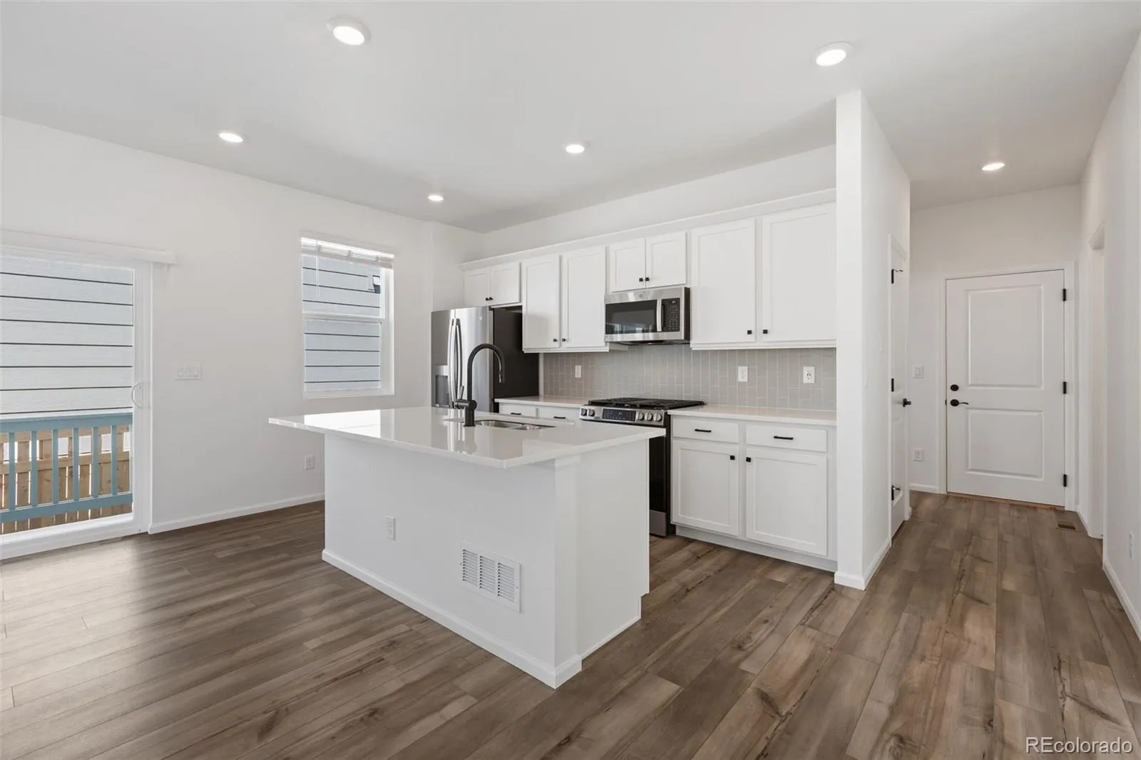As you step into the main floor, you’ll find a convenient office space, ideal for those who work from home or need a dedicated workspace. The kitchen is a chef’s dream with sleek 36″ white cabinets, white quartz countertops, and modern appliances (including washer dryer & fridge). The solid surface flooring throughout the main level adds a touch of sophistication and is easy to maintain.