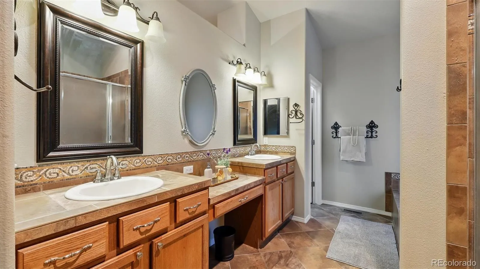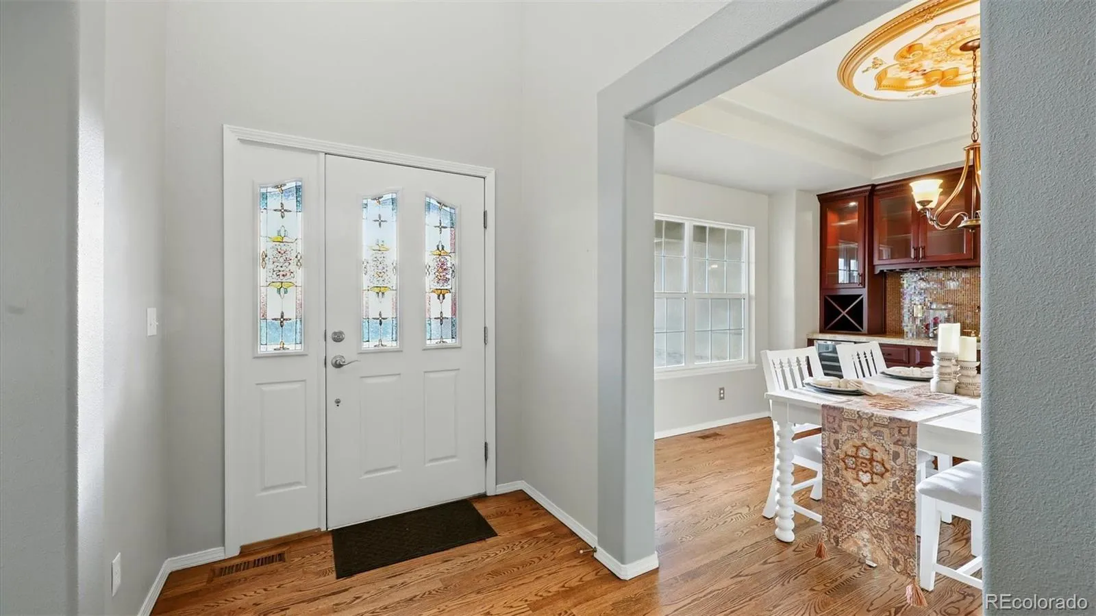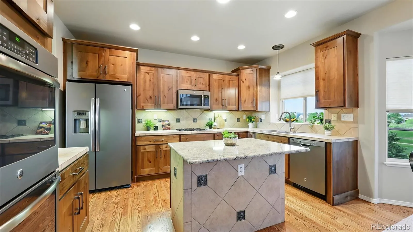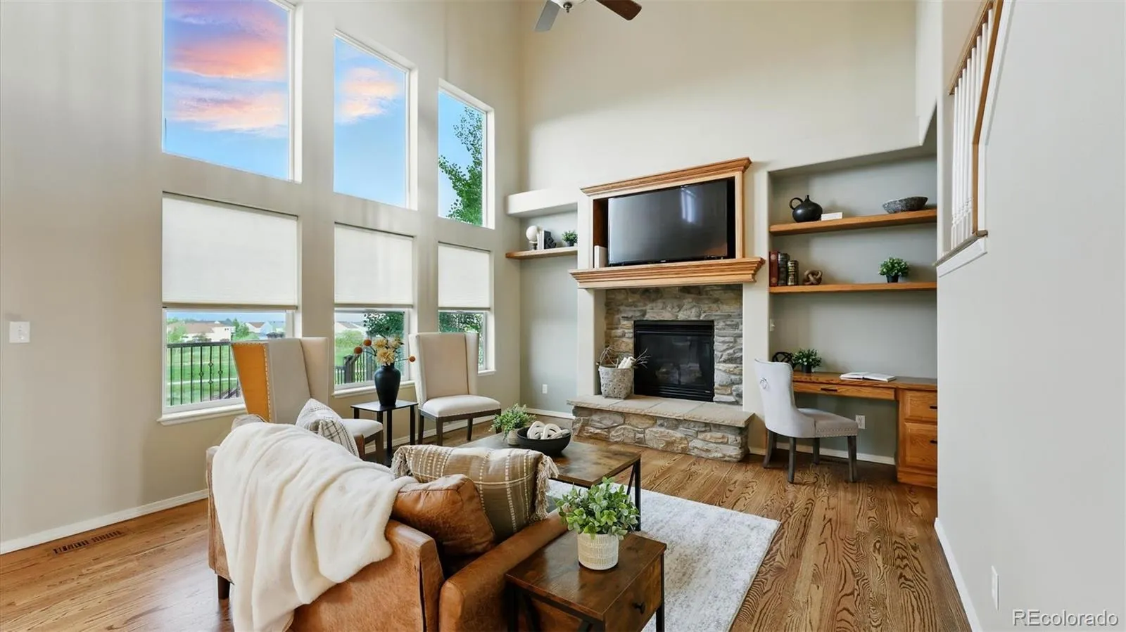 Captivating, custom 5BR, 4BA, stucco/stone home on Antler Creek Golf Course! This stunning 2-story home backs directly onto the 4th fairway, offering breathtaking Pikes Peak & golf course views! This one-of-a-kind property is rich with custom upgrades & warm, elegant finishes throughout. Step inside to stunning hardwood floors that flow through the main level & upstairs loft. The soaring ceilings & gas-log fireplace with custom cabinetry & built-in desk create a welcoming living space that opens seamlessly to the Kitchen Nook & Kitchen, each highlighting beautiful golf course views. The Chef’s Kitchen features stainless steel appliances, incl double ovens, a built-in microwave, upgraded gas cooktop, dishwasher, & side by side refrigerator. The formal Dining Rm adds a touch of sophistication with a built-in wet bar & custom cabinetry. The spacious main-level Primary Suite boasts plush carpeting, direct deck access, a massive walk-in closet, & luxurious 5-pc Bath with a dual-head, custom-tiled shower, soaking tub, dual vanities, & private toilet area. Also on the main level is a generous office, Laundry Rm, & stylish Powder Bath. Upstairs, the large loft offers addtl space for a 2nd office or creative retreat, accompanied by 2 spacious BRs & a full bath designed with dual vanities & a private shower/tub/toilet layout. The finished walk-out basement is built for entertaining, featuring a home theater setup with full surround sound, a second gas-log fireplace, wet bar with fridge, expansive recreation space, 2 more oversized BRs, & full bath. 3-car attached garage. The fenced backyard offers meticulous landscaping, an expanded deck for outdoor dining & relaxation, & a covered patio to enjoy the Colorado sunshine. Conveniently located close to schools, parks, & recreation areas. Shops, restaurants, & Cinemark, complete with an IMAX at the First and Main Town Center are only 15 min away! Don’t miss the opportunity to make this fabulous home your own!