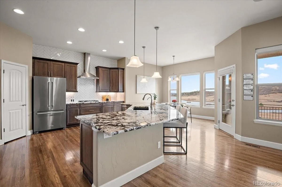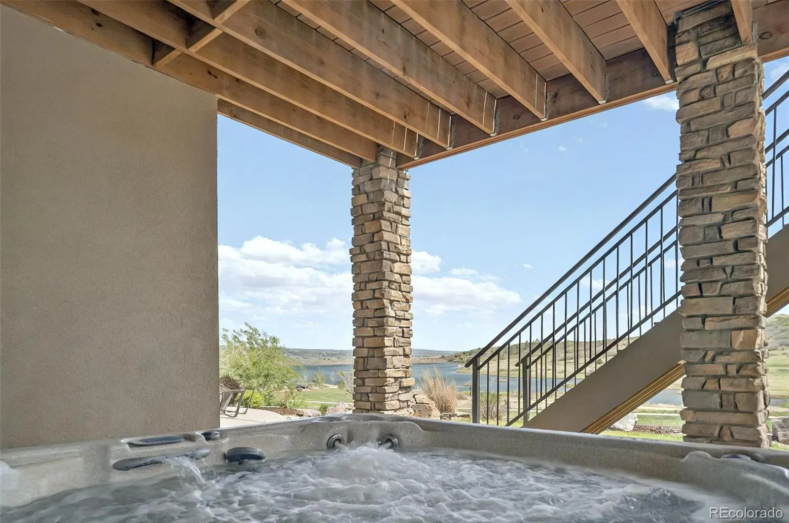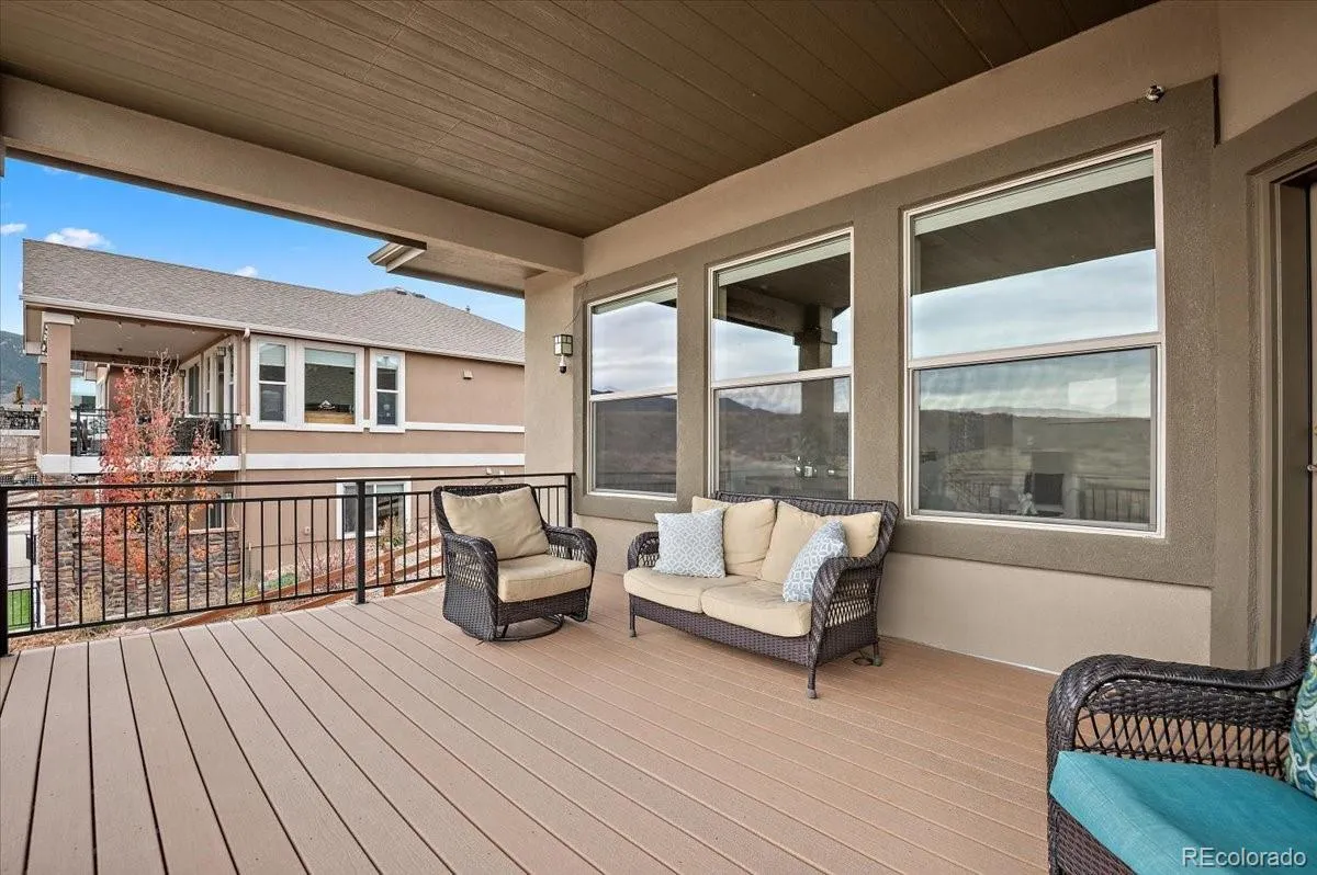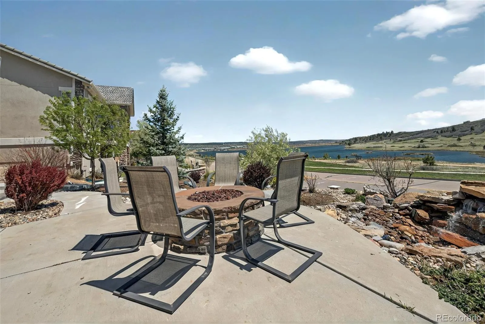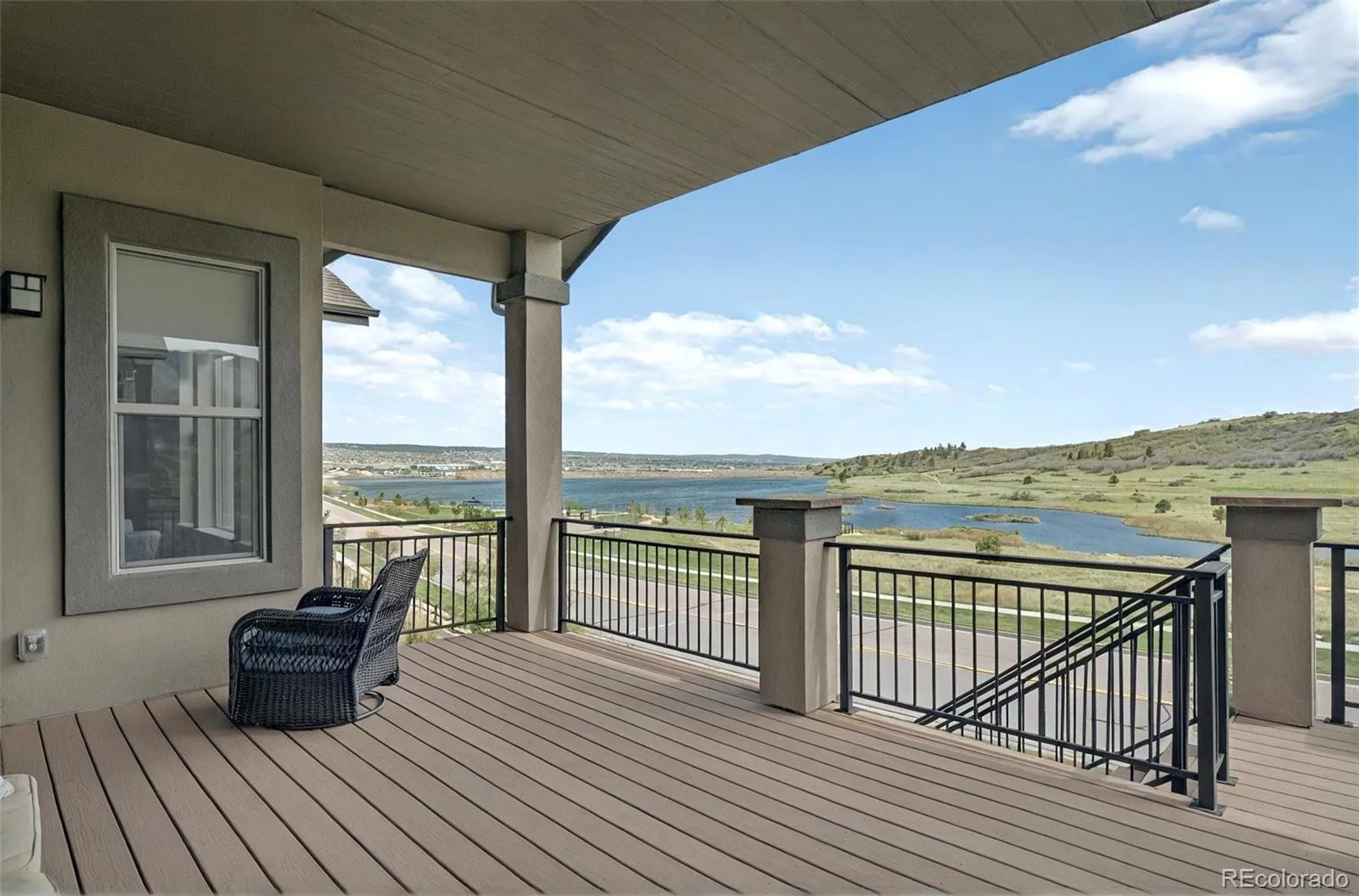 This Stratford walkout rancher is perfectly situated on a premium lot that backs to a serene lake and open space in one of the most coveted neighborhoods in all of Monument. From top to bottom, no detail was overlooked in the thoughtful design and high-end upgrade selections throughout from instant hot water to a reverse osmosis water system. A covered front porch and a formal entry opens into a beautifully designed formal dining room with custom arches, leading seamlessly into the expansive great room and gourmet kitchen. The great room concept is both open and inviting, featuring millrun hickory floors, a dramatic stacked stone fireplace, and a wall of windows with motorized bluetooth blinds that frame unmatched lake and mountain views, allowing natural light to pour in. The chef’s kitchen is a showstopper, complete with a massive solid granite slab island, premium appliances, a bright breakfast nook, and direct access to the covered custom deck—perfect for enjoying the panoramic scenery. The main level offers a spacious secondary bedroom and a luxurious master suite with stunning views and a spa-like 5-piece bath. Entering from the oversized garage, you’ll find a convenient mudroom/laundry room outfitted with matching cabinetry and a functional folding area. A custom extra-wide stairwell with wrought iron balusters and hardwood railing leads you to the fully finished walkout lower level, where a large rec/media room awaits, complete with a wet bar featuring granite counters, tumbled marble backsplash, and a built-in wine fridge. From here, step outside to a massive 49′ x 19′ patio with a beautiful water feature, fire pit, outside gas stout, hot tub, and breathtaking views, making this level ideal for entertaining and wired for surround sound inside and out (over $75k in outside landscaping). The garage is oversized with a 4 ft extension and a backyard access door. This home is a rare gem and an extraordinary find—and truly feels practically brand new.