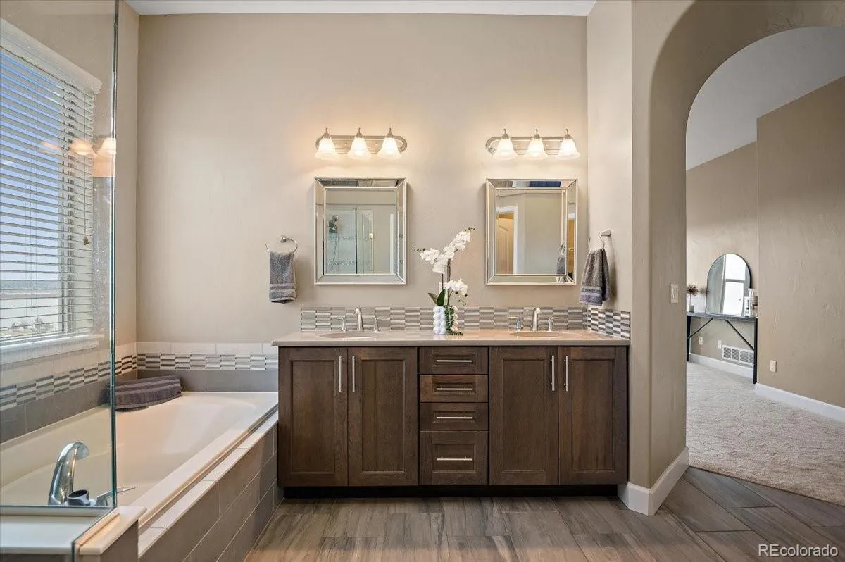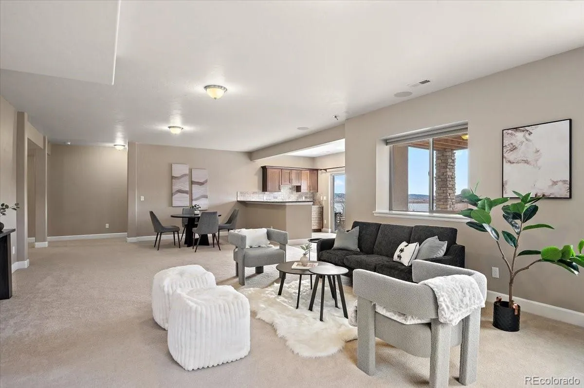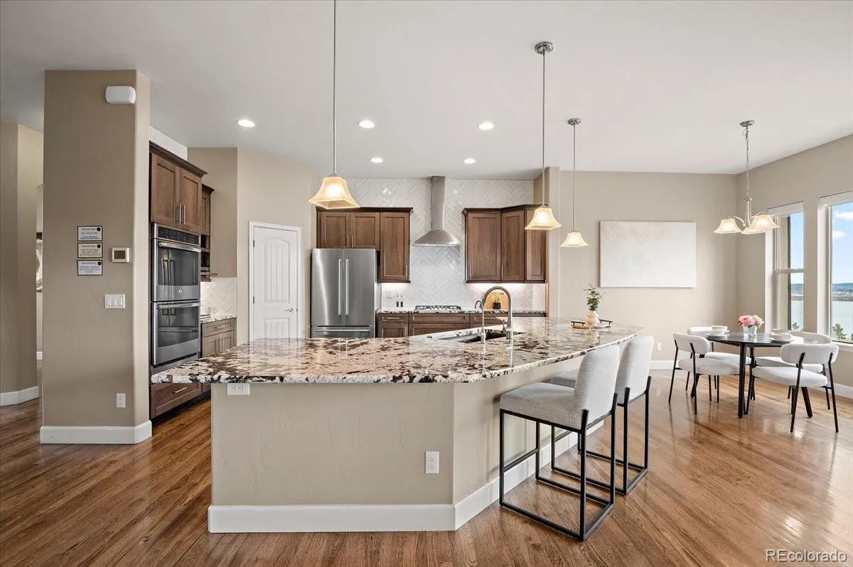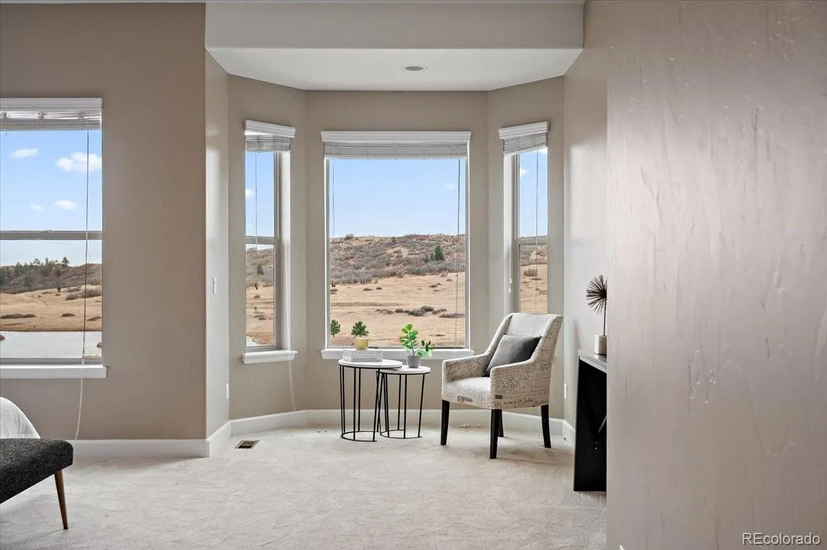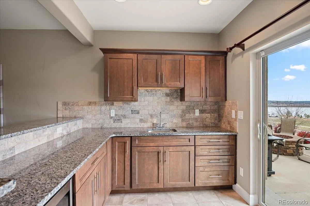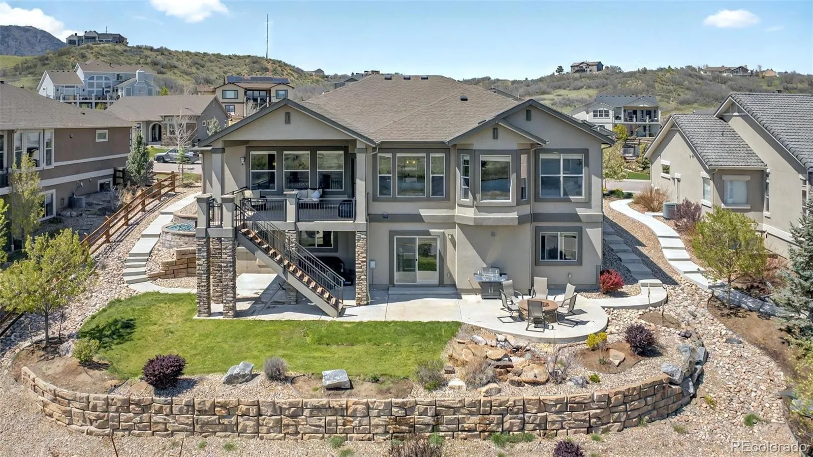 This Stratford walkout rancher is perfectly situated on a premium lot that backs to a serene lake and open space in one of the most coveted neighborhoods in all of Monument. From top to bottom, no detail was overlooked in the thoughtful design and high-end upgrade selections throughout from instant hot water to a reverse osmosis water system. A covered front porch and a formal entry opens into a beautifully designed formal dining room with custom arches, leading seamlessly into the expansive great room and gourmet kitchen. The great room concept is both open and inviting, featuring millrun hickory floors, a dramatic stacked stone fireplace, and a wall of windows with motorized bluetooth blinds that frame unmatched lake and mountain views, allowing natural light to pour in. The chef’s kitchen is a showstopper, complete with a massive solid granite slab island, premium appliances, a bright breakfast nook, and direct access to the covered custom deck—perfect for enjoying the panoramic scenery. The main level offers a spacious secondary bedroom and a luxurious master suite with stunning views and a spa-like 5-piece bath. Entering from the oversized garage, you’ll find a convenient mudroom/laundry room outfitted with matching cabinetry and a functional folding area. A custom extra-wide stairwell with wrought iron balusters and hardwood railing leads you to the fully finished walkout lower level, where a large rec/media room awaits, complete with a wet bar featuring granite counters, tumbled marble backsplash, and a built-in wine fridge. From here, step outside to a massive 49′ x 19′ patio with a beautiful water feature, fire pit, outside gas stout, hot tub, and breathtaking views, making this level ideal for entertaining and wired for surround sound inside and out (over $75k in outside landscaping). The garage is oversized with a 4 ft extension and a backyard access door. This home is a rare gem and an extraordinary find—and truly feels practically brand new.