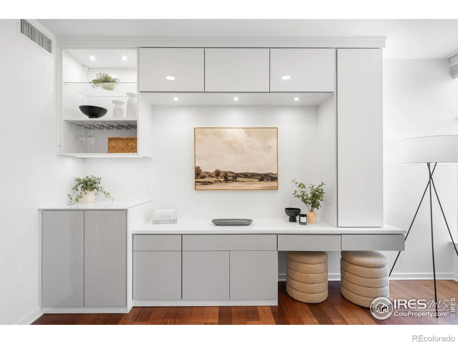 Revel in refined urban living in this mid-floor residence in the coveted Village at Uptown. Featuring Euro-inspired designer finishes, this light-filled residence boasts soaring ceilings, floor-to-ceiling glass and rich wood flooring. A sleek kitchen showcases granite countertops, stainless steel appliances, a tiled backsplash and beautiful wood cabinetry. The spacious one-bedroom layout includes a rare, separate workspace with its own bath – ideal for remote work or creative pursuits. Enjoy morning sunlight and fresh air on the oversized private balcony. The sizable bedroom is complemented by a serene bath with a walk-in shower and modern fixtures. Custom built-in California Closets enhance storage and functionality throughout, including curated closets, a pantry and an entertainment center. A detached garage adds convenience. Residents enjoy a central location with proximity to shopping and eateries in North Boulder, the NoBo Library and nature trails, plus easy access to Downtown Boulder amenities.