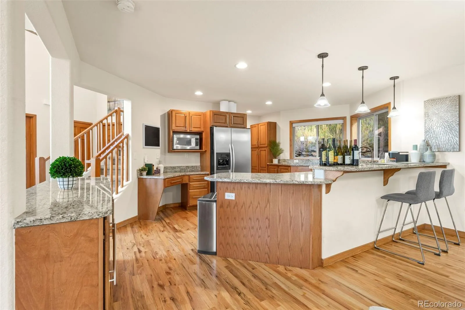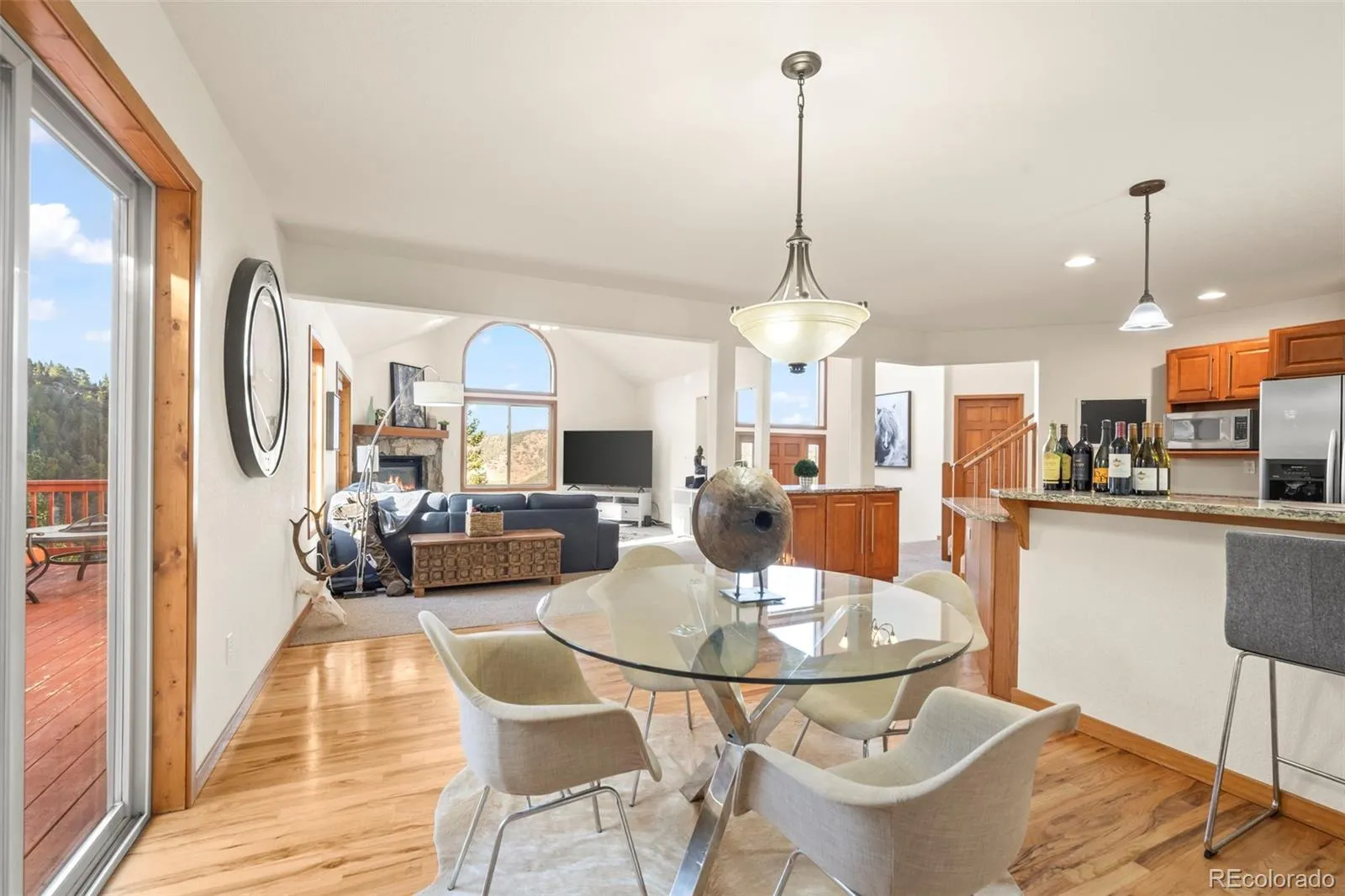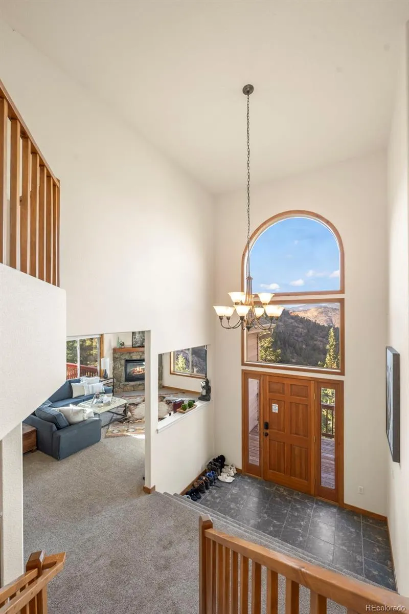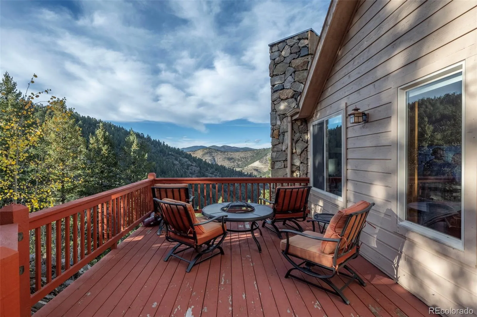 Experience unparalleled mountain living in this stunning Evergreen retreat. Situated on over 7 acres, this property offers million-dollar views and exceptional privacy. The open floor plan boasts expansive windows, a vaulted living room ceiling, and a spacious kitchen with slab granite, stainless appliances, and hardwood flooring. The main floor primary suite features a luxurious 5-piece bathroom with a soaking tub offering breathtaking views, and a private balcony. Entertain on the large main level deck while enjoying unobstructed mountain vistas. Upstairs, find two generously sized bedrooms and a full bathroom. The walkout basement includes 9′ ceilings, a family room with a second fireplace, a study/home office, a fourth bathroom, and laundry. A 2-car attached garage and greenhouse complete the property. Located just minutes from I-70, Evergreen, and with easy access to Denver and skiing.